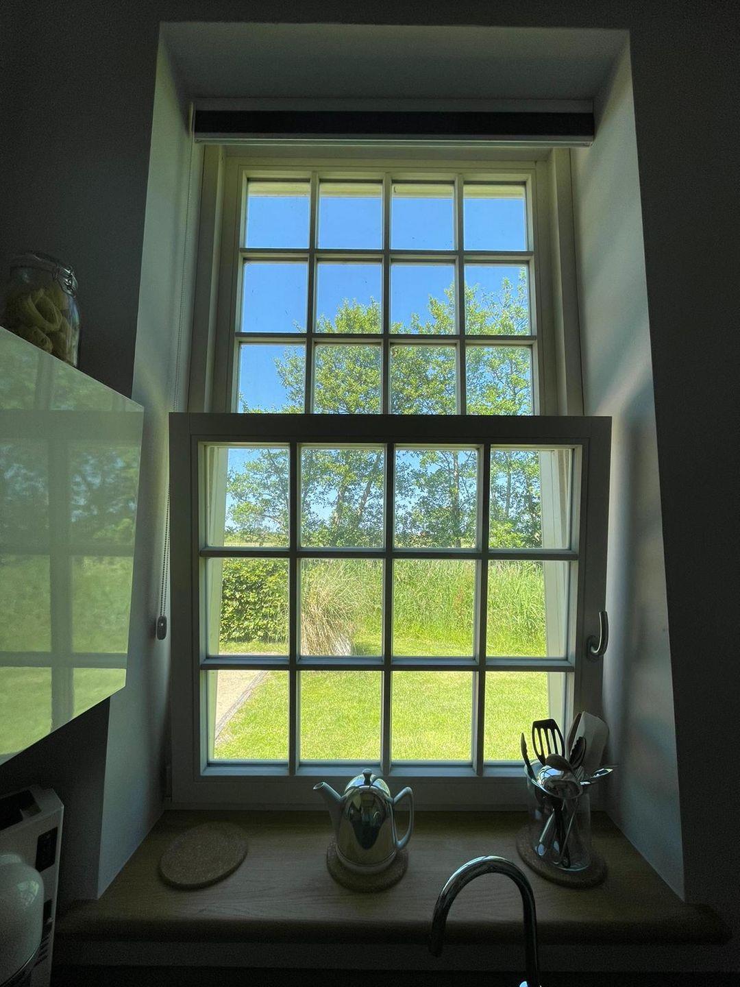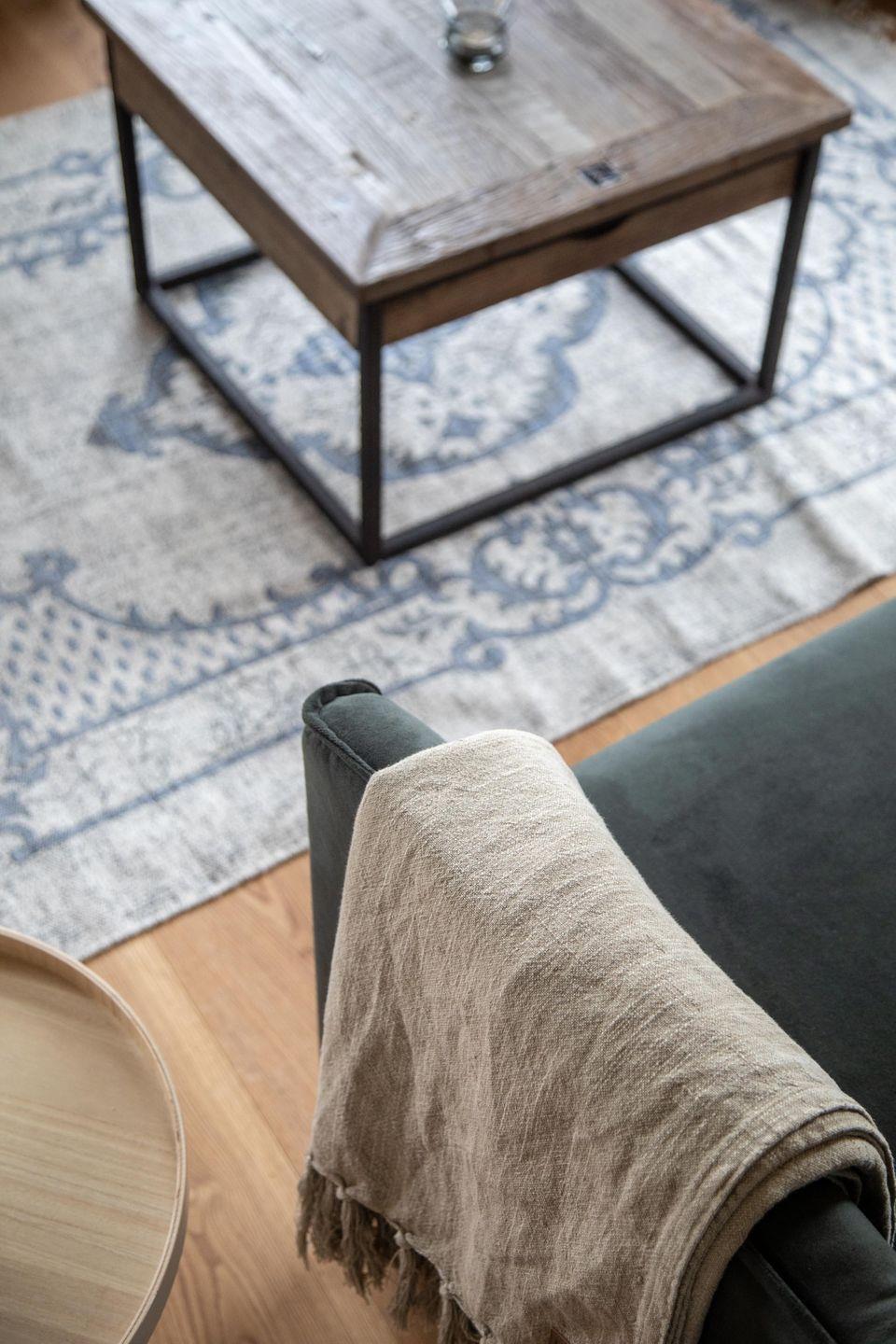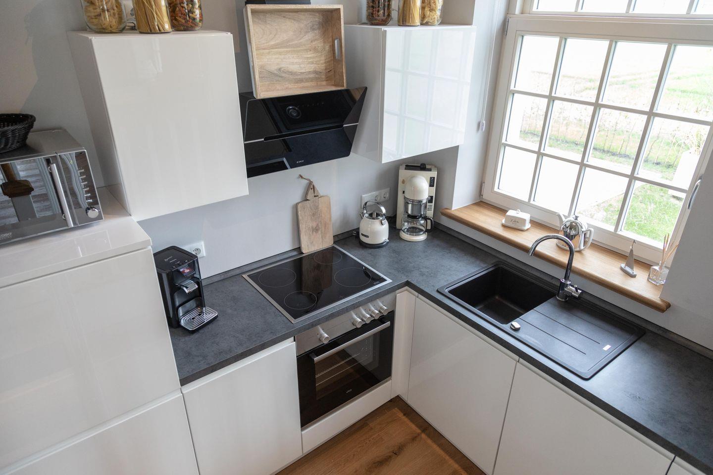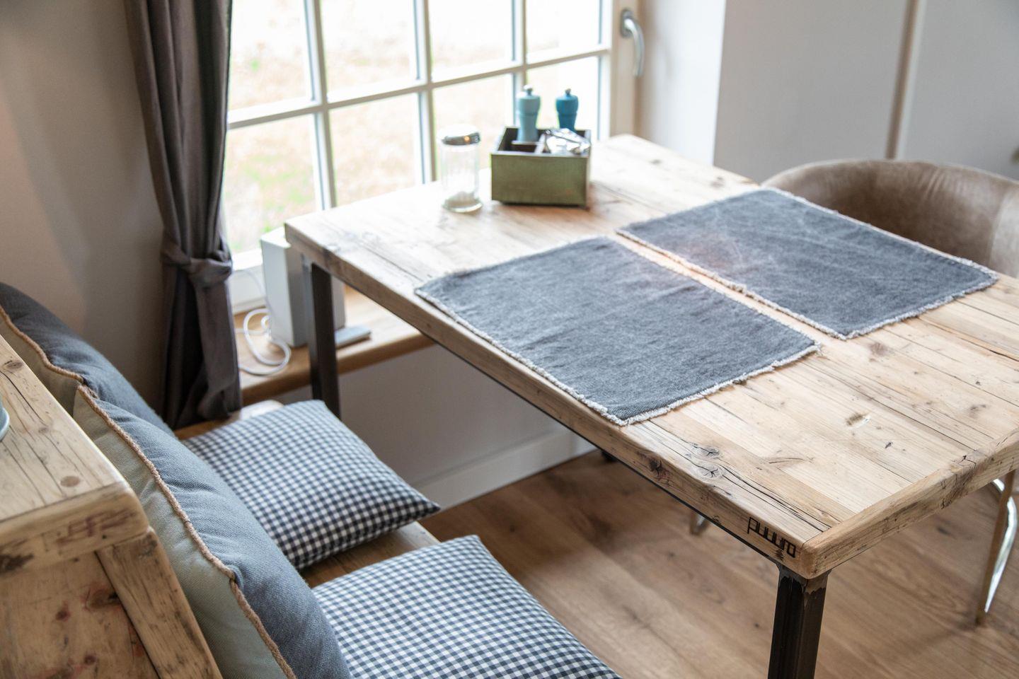 Zu Friso gehört die voll ausgestattete Küche mit schönem Wasserkocher, Kaffeemaschine und Toaster von KitchenAid. Die Schränke sind mit hochwertigem Geschirr bestückt. Über die Holztreppe geht es hinauf in den loftartigen Wohn-Schlafbereich. Am heimeligen Essplatz lädt dort eine gemütliche Bank zu einem langen Frühstück ein und beim entspannten Lesen auf dem Sofa mit der extrahohen Lehne schweift der Blick durch das großzügige Sprossenfenster bestimmt immer wieder in die Natur.
