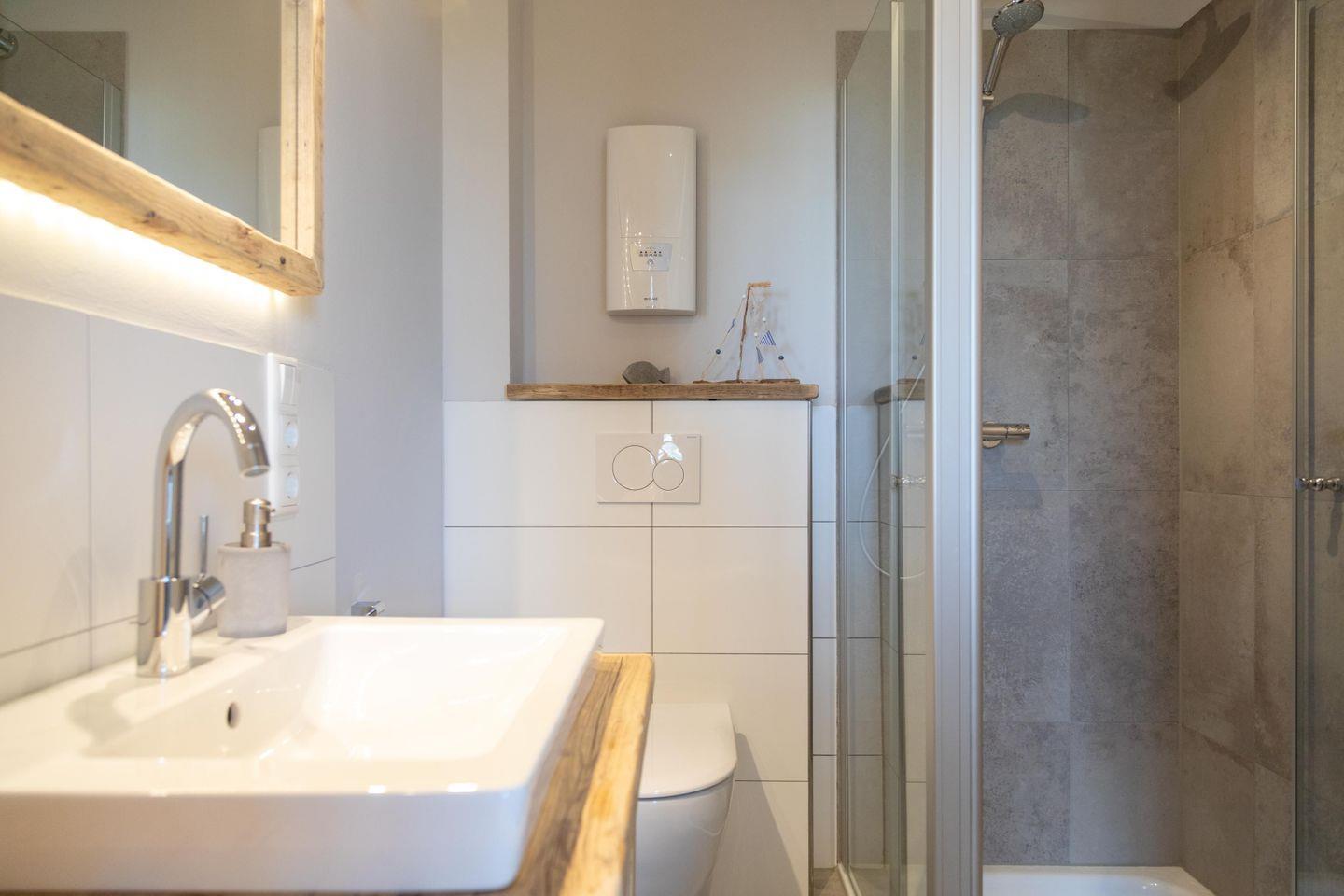 Das in der Region handgetischlerte Doppelbett verspricht mit komfortablen Matratzen und hautsympathischem Bettzeug einen erholsamen Schlaf. Für authentisches Nordsee-Feeling fällt nachts das Licht des Leuchtturms von Norderney auf das Bett. Das Bad mit Dusche und WC ist mit einem Echtholz-Waschtisch und harmonisch aufeinander abgestimmten Fliesen ebenfalls ein Raum zum Wohlfühlen.