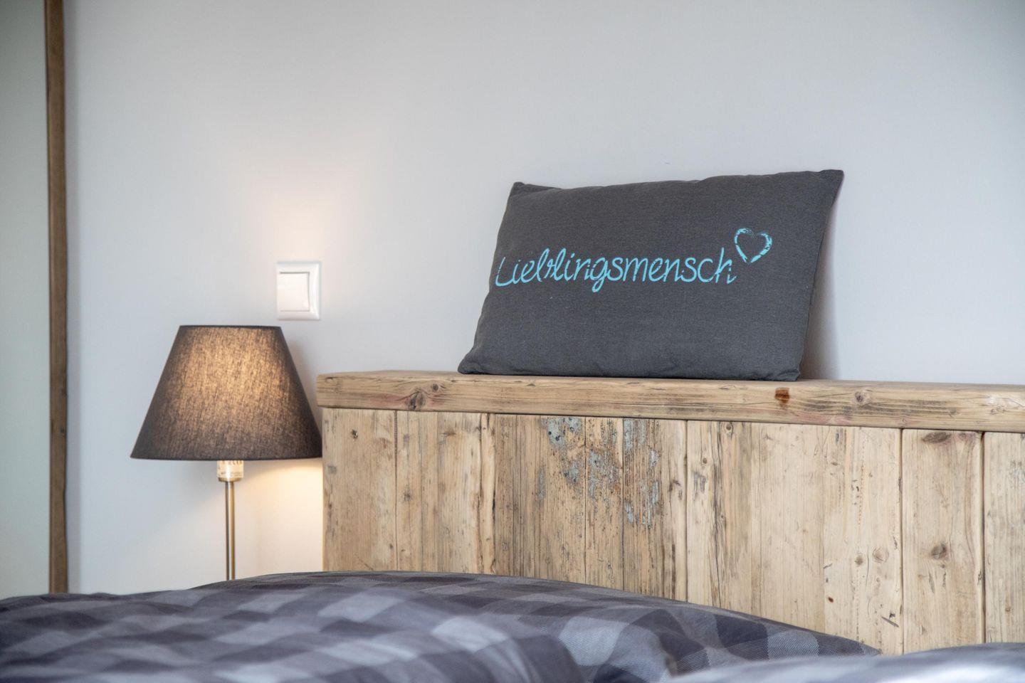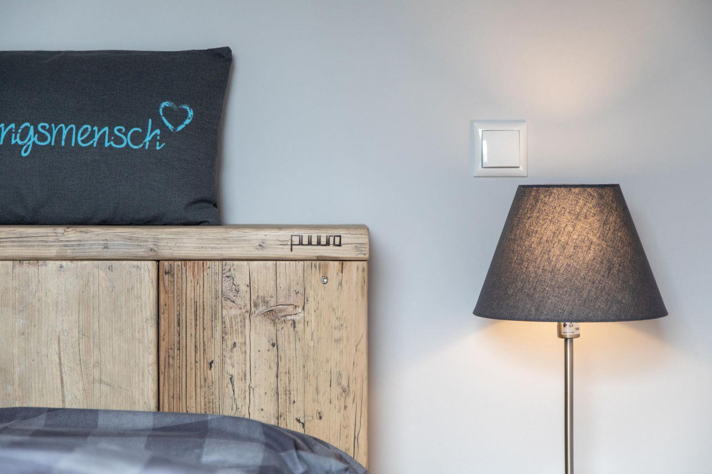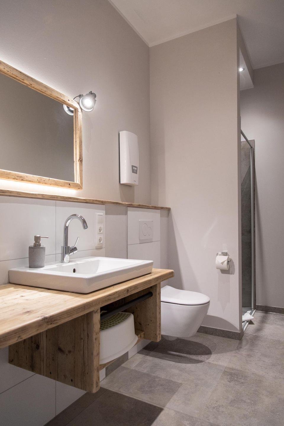 Tammo – das ist eine Ferienwohnung, die pure Gemütlichkeit ausstrahlt, ohne dabei den Sinn für das Besondere zu vergessen. Die Wohnung im Obergeschoss ist über die Scheune zugänglich und bietet mitten im wohltuenden Reizklima der nahe Nordsee einen fantastischen Blick ins Grüne. Genießt auf 61 qm zu viert eine wohltuende Auszeit in einer schönen Umgebung und nachts von den Schlafzimmern aus einen romantischen Blick in den Sternenhimmel. Wie in der gesamten Wohnung wurden auch im Bad mit Dusche und WC ausschließlich hochwertige Materialien verwendet. Das Badezimmer ist ein Ort zum Wohlfühlen und bietet ausreichend Ablagemöglichkeiten für Kosmetika und Co.