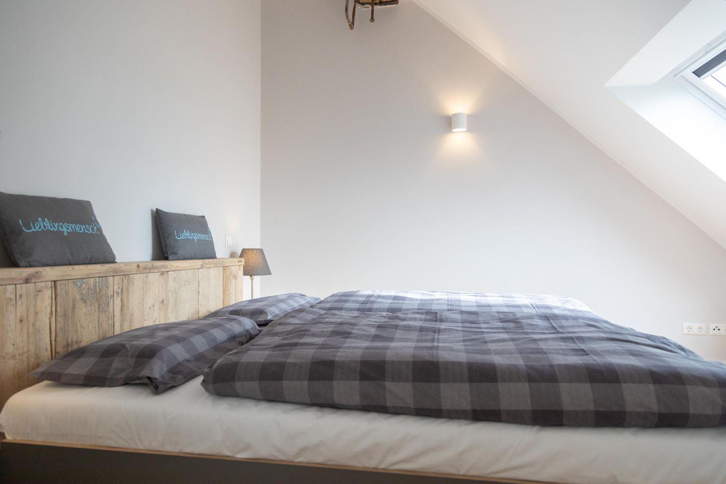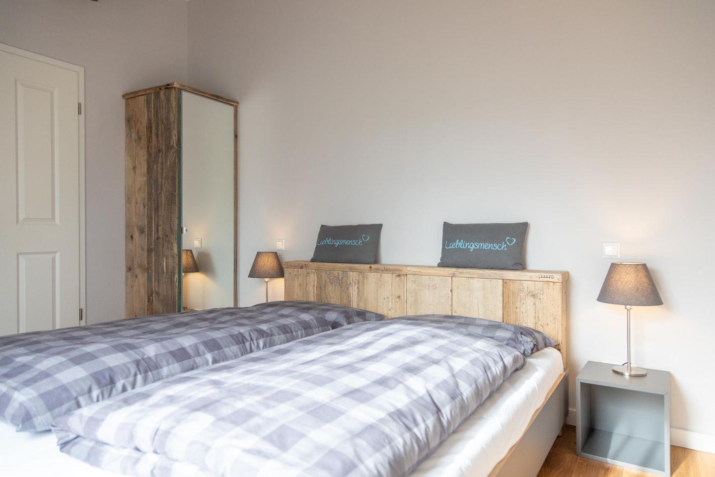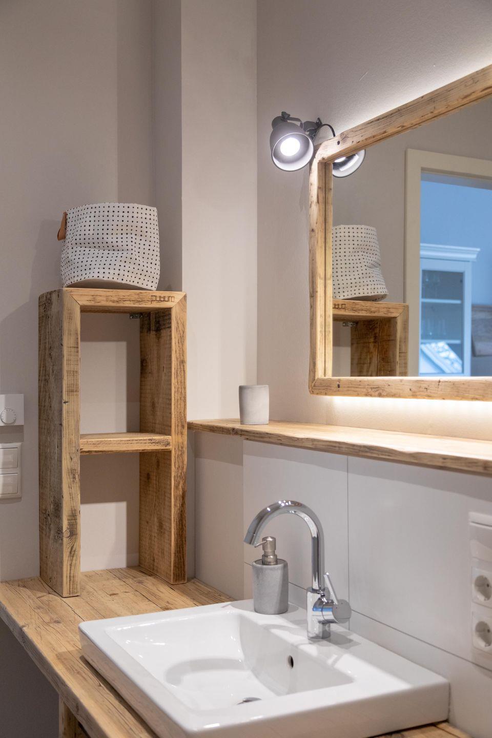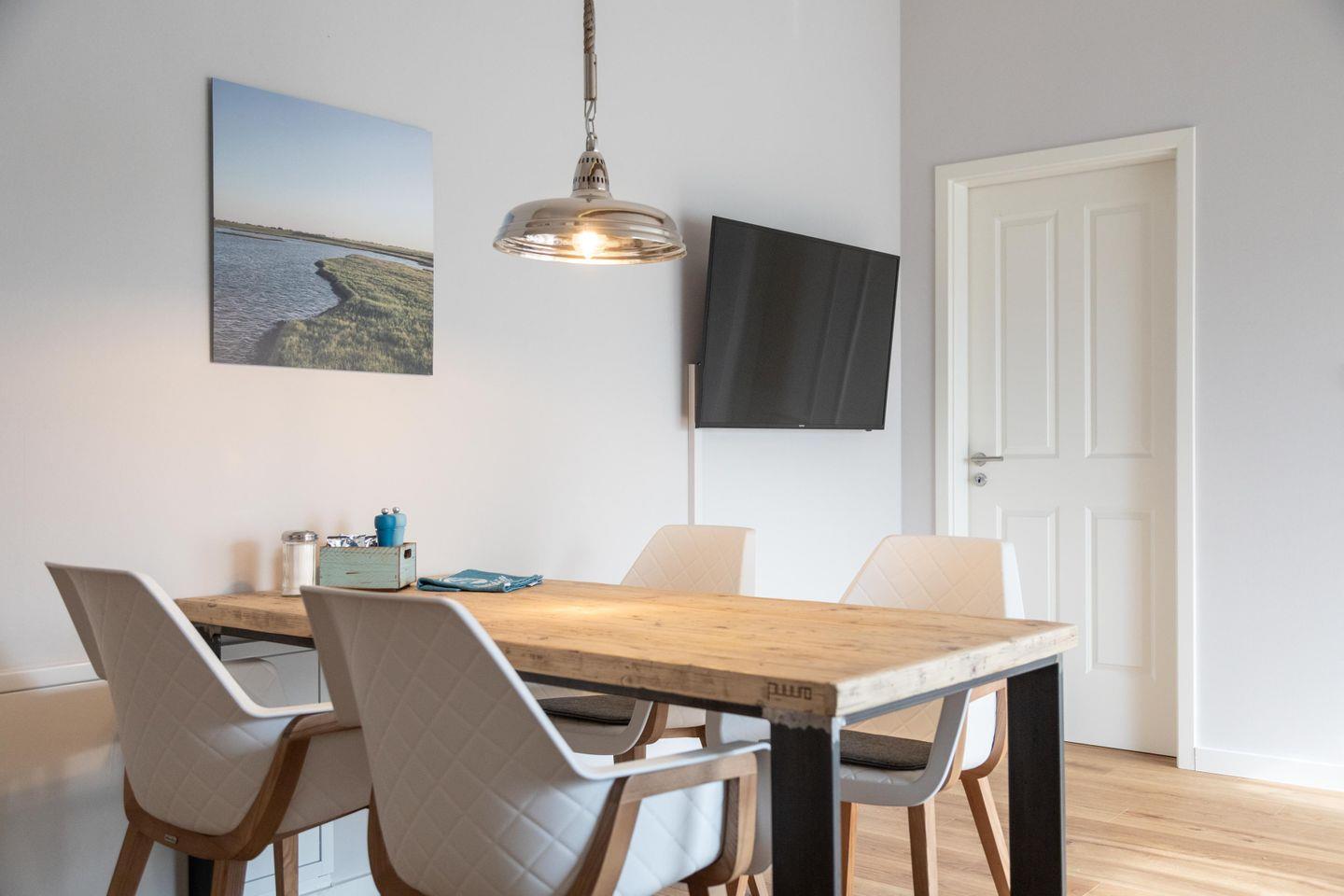 Tammo – das ist eine Ferienwohnung, die pure Gemütlichkeit ausstrahlt, ohne dabei den Sinn für das Besondere zu vergessen. Die Wohnung im Obergeschoss ist über die Scheune zugänglich und bietet mitten im wohltuenden Reizklima der nahe Nordsee einen fantastischen Blick ins Grüne. Genießt auf 61 qm zu viert eine wohltuende Auszeit in einer schönen Umgebung und nachts von den Schlafzimmern aus einen romantischen Blick in den Sternenhimmel. Wie in der gesamten Wohnung wurden auch im Bad mit Dusche und WC ausschließlich hochwertige Materialien verwendet. Das Badezimmer ist ein Ort zum Wohlfühlen und bietet ausreichend Ablagemöglichkeiten für Kosmetika und Co.