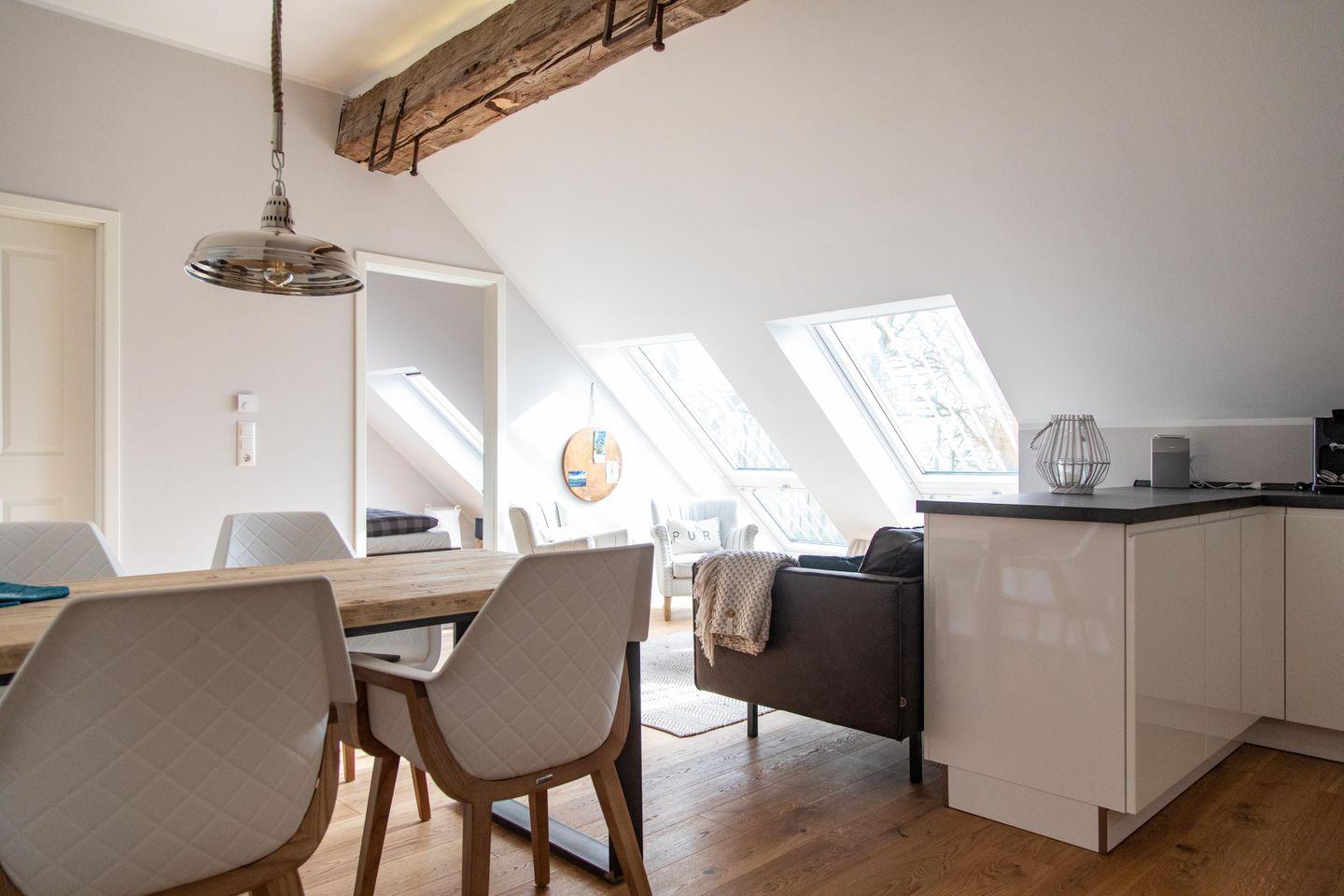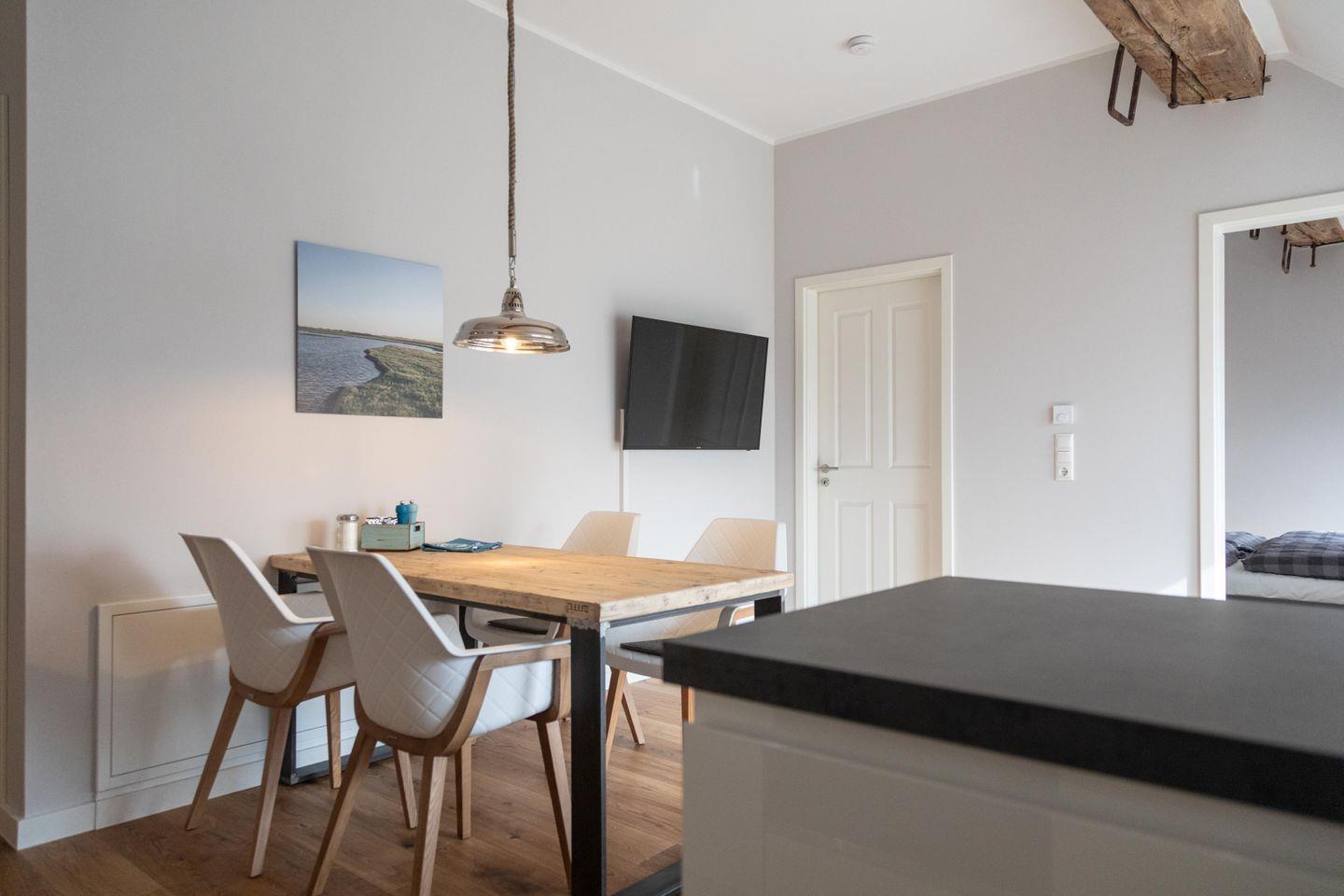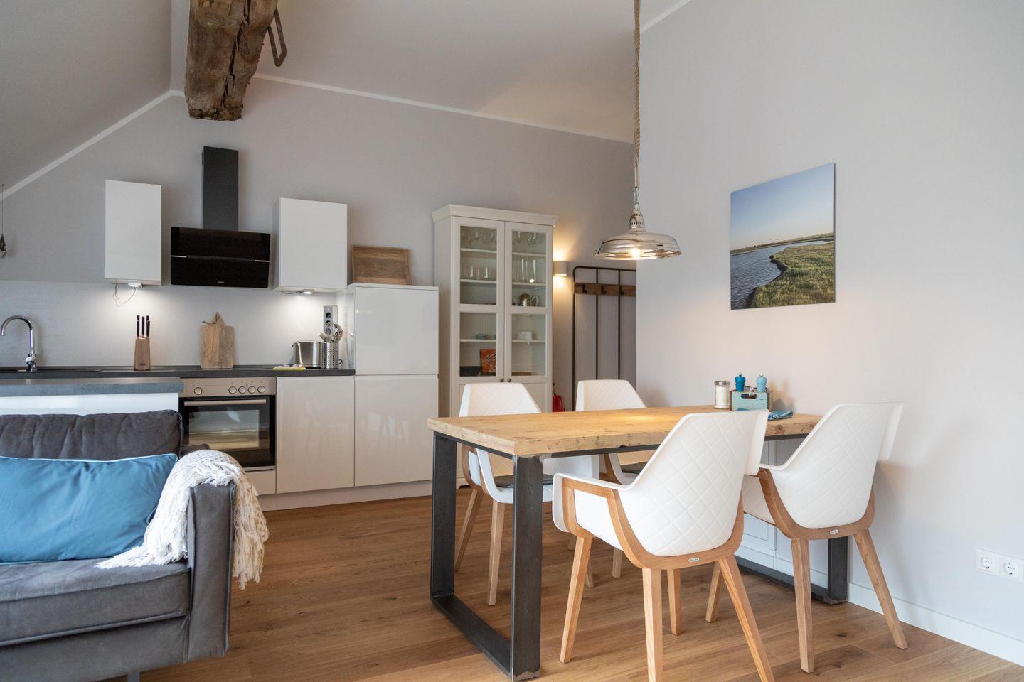 Der Clou an der Ferienwohnung Tammo sind die Fenster im Wohn- und Schlafzimmer, die sich beim Öffnen in einen kleinen Balkon verwandeln. Den Mittelpunkt der Wohnung bildet der offene Wohn-, Ess- und Küchenbereich. Luftig und zugleich urgemütlich lädt er zum Verweilen mit der ganzen Familie ein. Trefft euch am handgefertigten Esstisch oder zieh dich zum Relaxen mit einem guten Buch oder Musik oder aus der Bose-Soundbar auf die bequeme Ledercouch zurück. In der vollausgestatteten Küche wird das Kochen zu einem geselligen Vergnügen.