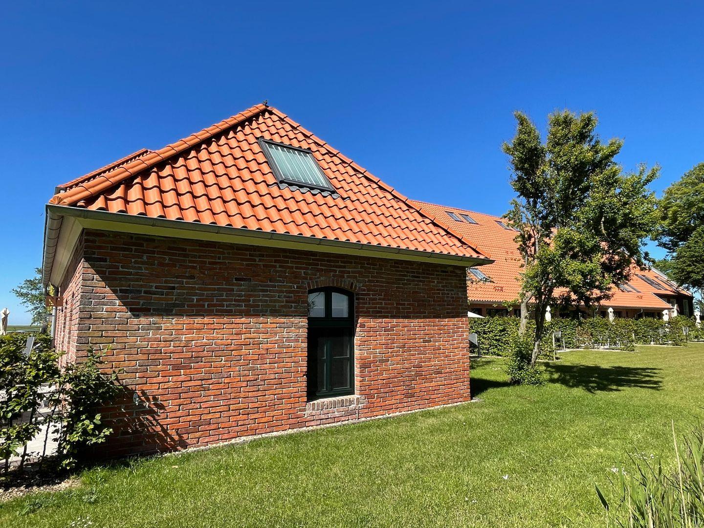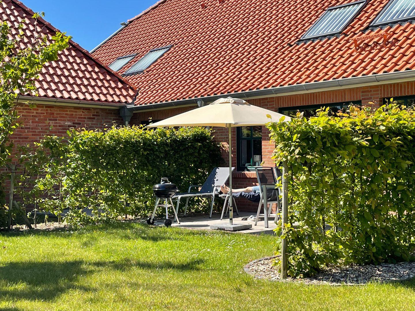 Gemütliche Ferienwohnung Gulfhof Dreybült 8 Tammo in Neßmersiel mit Terrasse und Garten für erholsamen Nordseeurlaub.