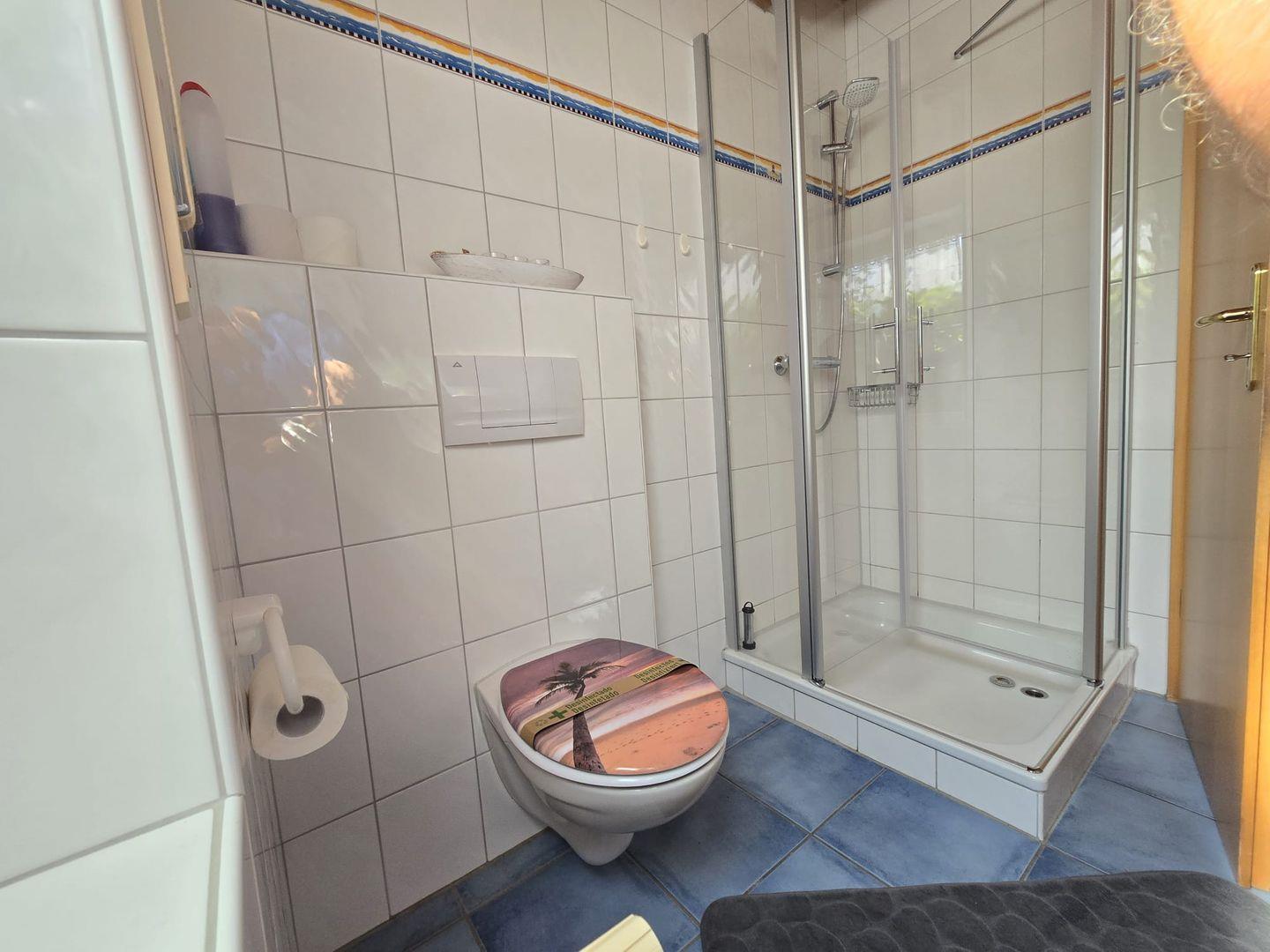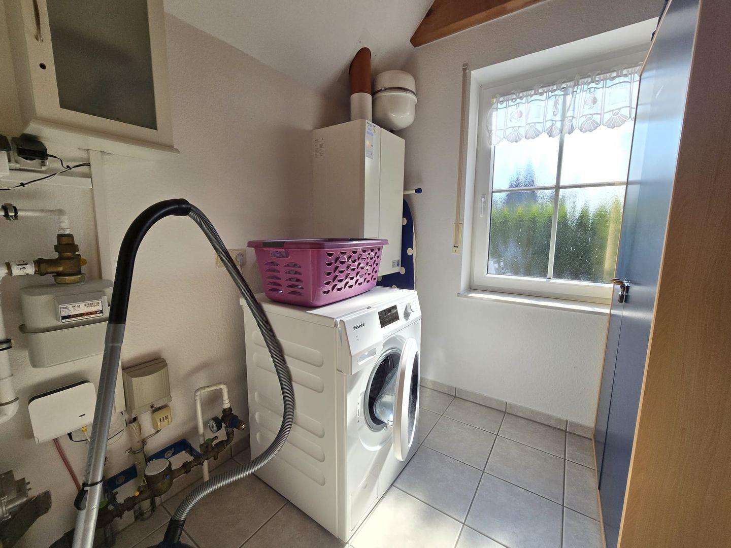 Ein Schlafzimmer mit Doppelbett und hellem Kiefernholz-Kleiderschrank befindet sich ebenfalls im Erdgeschoss. Der warme Korkparkettboden sorgt für eine angenehme Atmosphäre. Alle Fenster sind mit Rollläden ausgestattet, die eine vollständige Verdunkelung ermöglichen. Das Tageslichtbad verfügt über Dusche und WC. Neben dem Badezimmer liegt ein separater Hauswirtschaftsraum mit Waschmaschine.