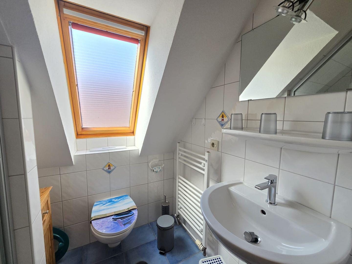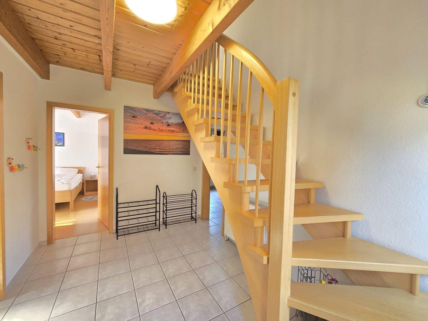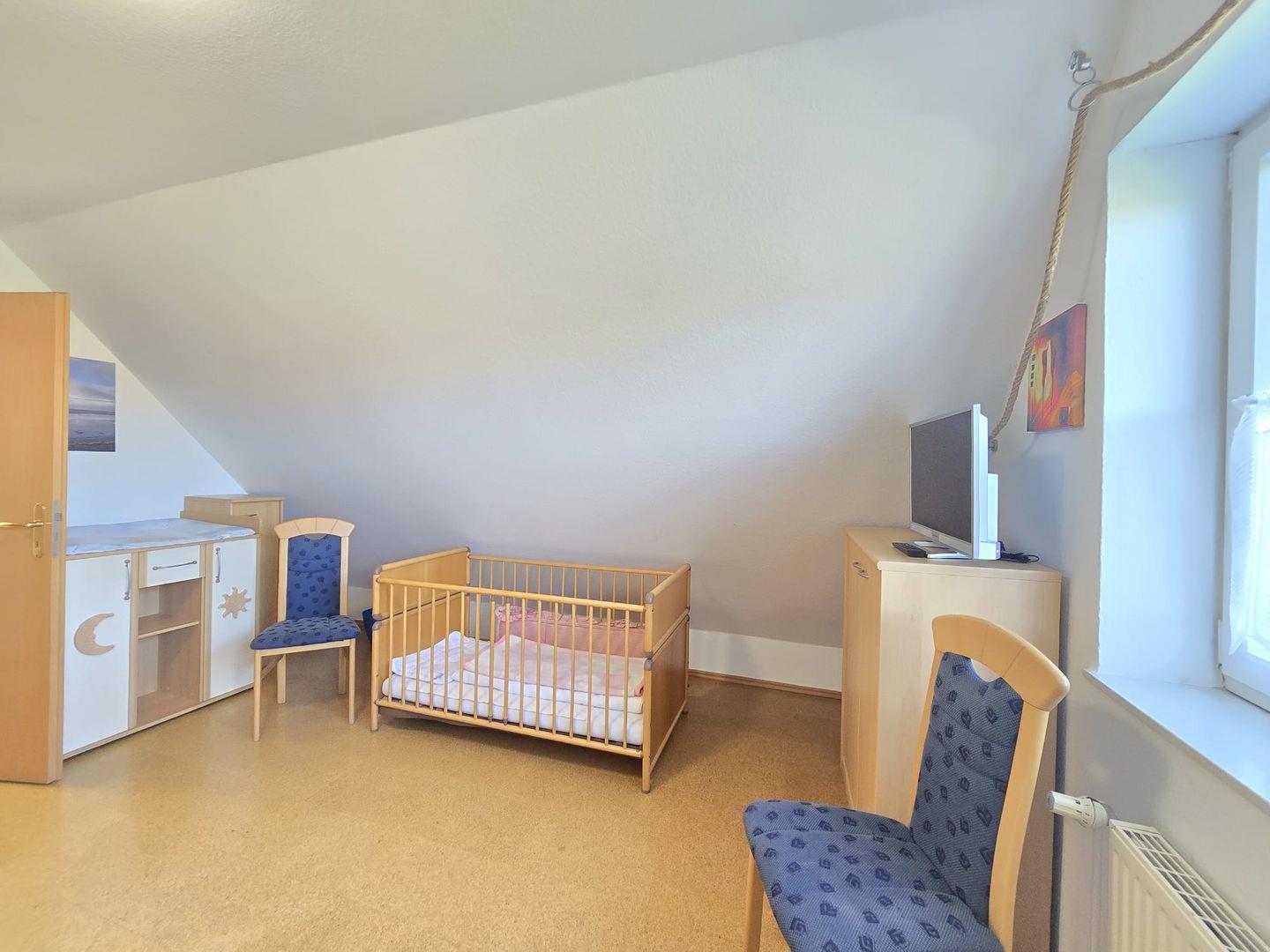 Im Obergeschoss befinden sich ein weiteres Elternschlafzimmer, ein Kinderzimmer sowie ein kleines, kindgerecht ausgestattetes Badezimmer. Beide Schlafzimmer sind ebenfalls mit Korkparkett ausgelegt und bieten dank Rollläden die Möglichkeit zur vollständigen Verdunkelung. Die Betten sind für Allergiker geeignet, weshalb Haustiere im gesamten Haus nicht erlaubt sind. Das zusätzliche Badezimmer verfügt über Dusche und WC sowie über kindgerechte Extras wie Toilettensitz und Tritthocker. Bettwäsche und Handtücher können gegen Aufpreis hinzugebucht werden.