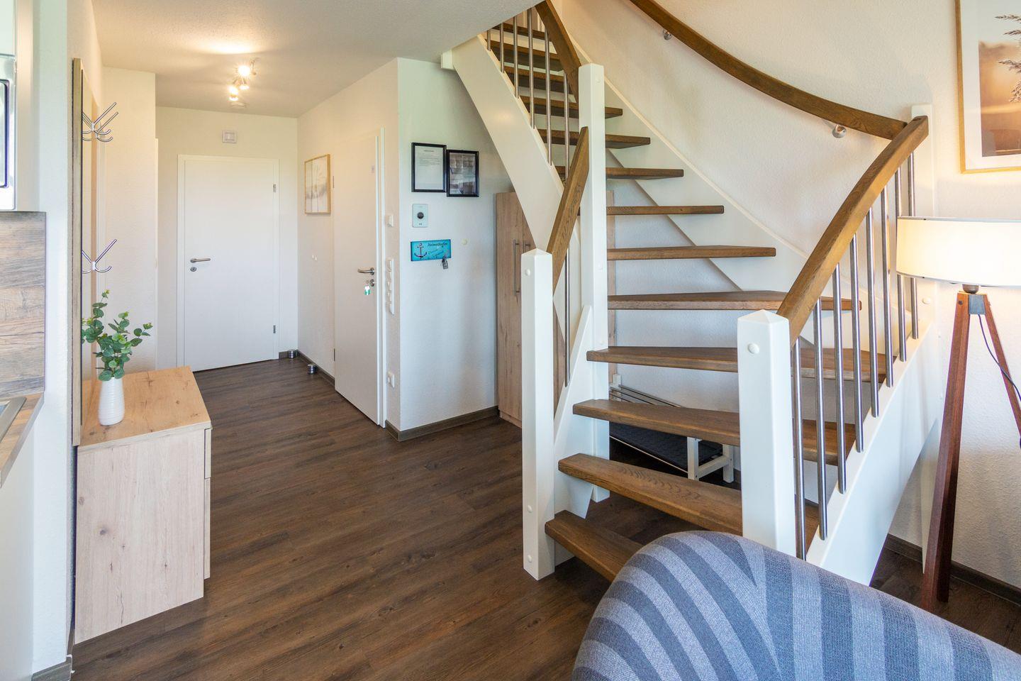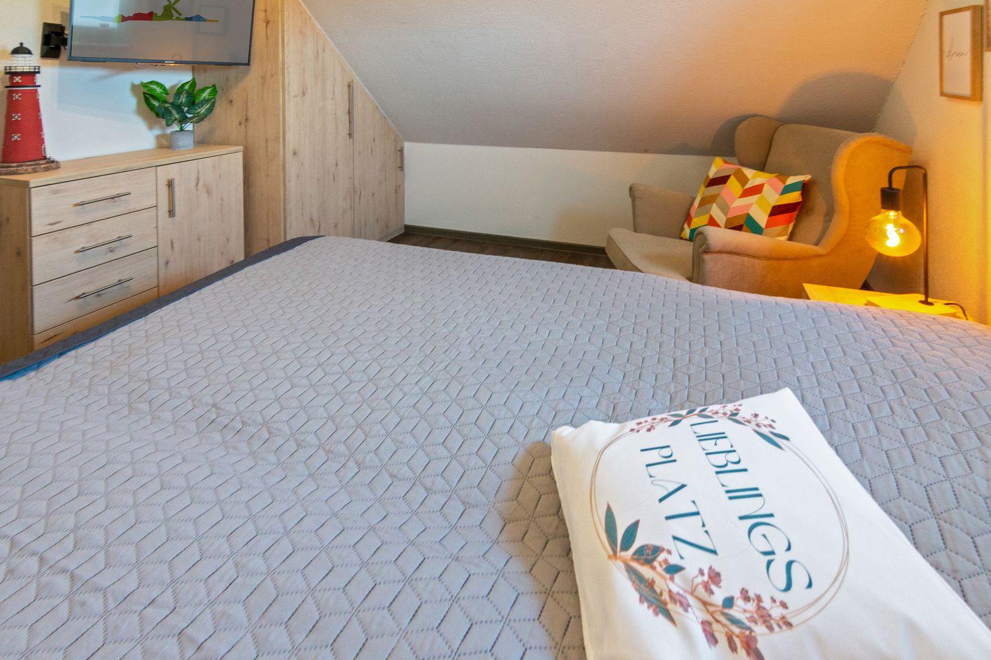 Die Wohnung erstreckt sich über zwei Etagen und verfügt über zwei gemütliche Schlafzimmer, die Ihnen einen erholsamen Schlaf garantieren. Die Betten im Dachgeschoss können nach Wunsch aufgestellt werden, um den Raum nach Ihren Bedürfnissen zu gestalten. Das lichtdurchflutete Wohnzimmer, ausgestattet mit einem komfortablen Sofa und Unterhaltungsmöglichkeiten wie einem TV, Radio und WLAN, ist der perfekte Ort, um es sich nach einem langen Tag am Meer gemütlich zu machen. Für laue Abende steht Ihnen außerdem ein einladender Balkon mit Gartenmöbeln zur Verfügung, auf dem Sie die frische Meeresluft genießen können.