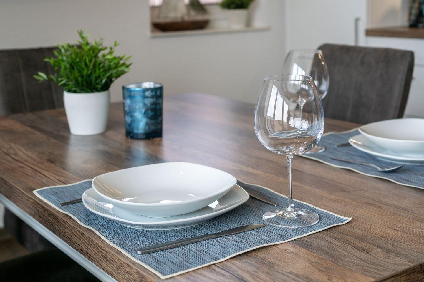 Die voll ausgestattete offene Küche mit modernen Geräten und hochwertigen Küchenutensilien lässt keine Wünsche offen. Hier können Sie Ihrer Kreativität beim Kochen freien Lauf lassen. Ein großzügiger Esstisch bietet Platz für gesellige Mahlzeiten mit Familie und Freunden. Darüber hinaus sorgen Annehmlichkeiten wie eine Spülmaschine, ein Elektrogrill und ein Kühlschrank mit Gefrierfach dafür, dass Sie sich wie zu Hause fühlen.