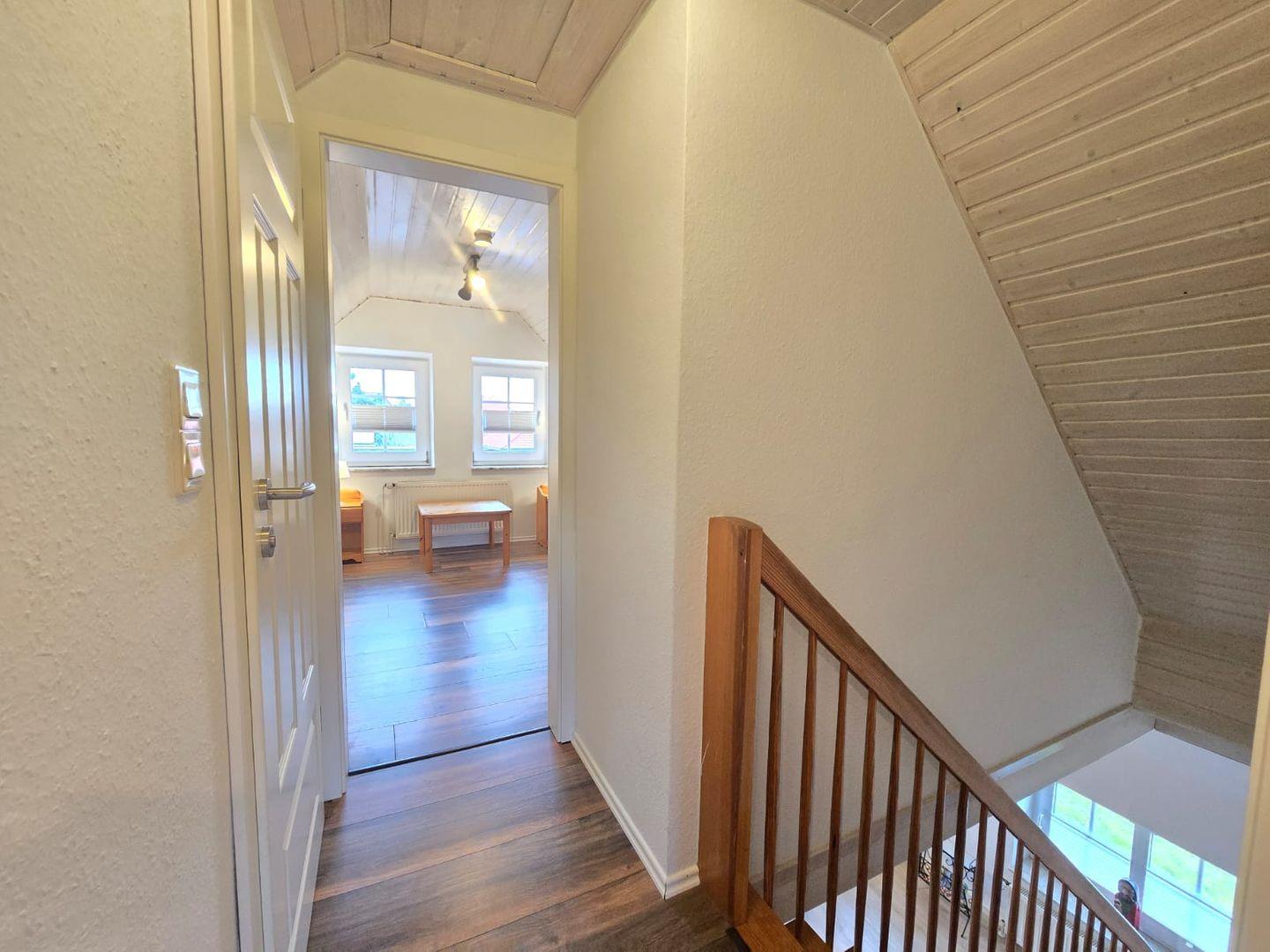 Über die offene Holztreppe erreichen Sie das Obergeschoss. Hier befinden sich: