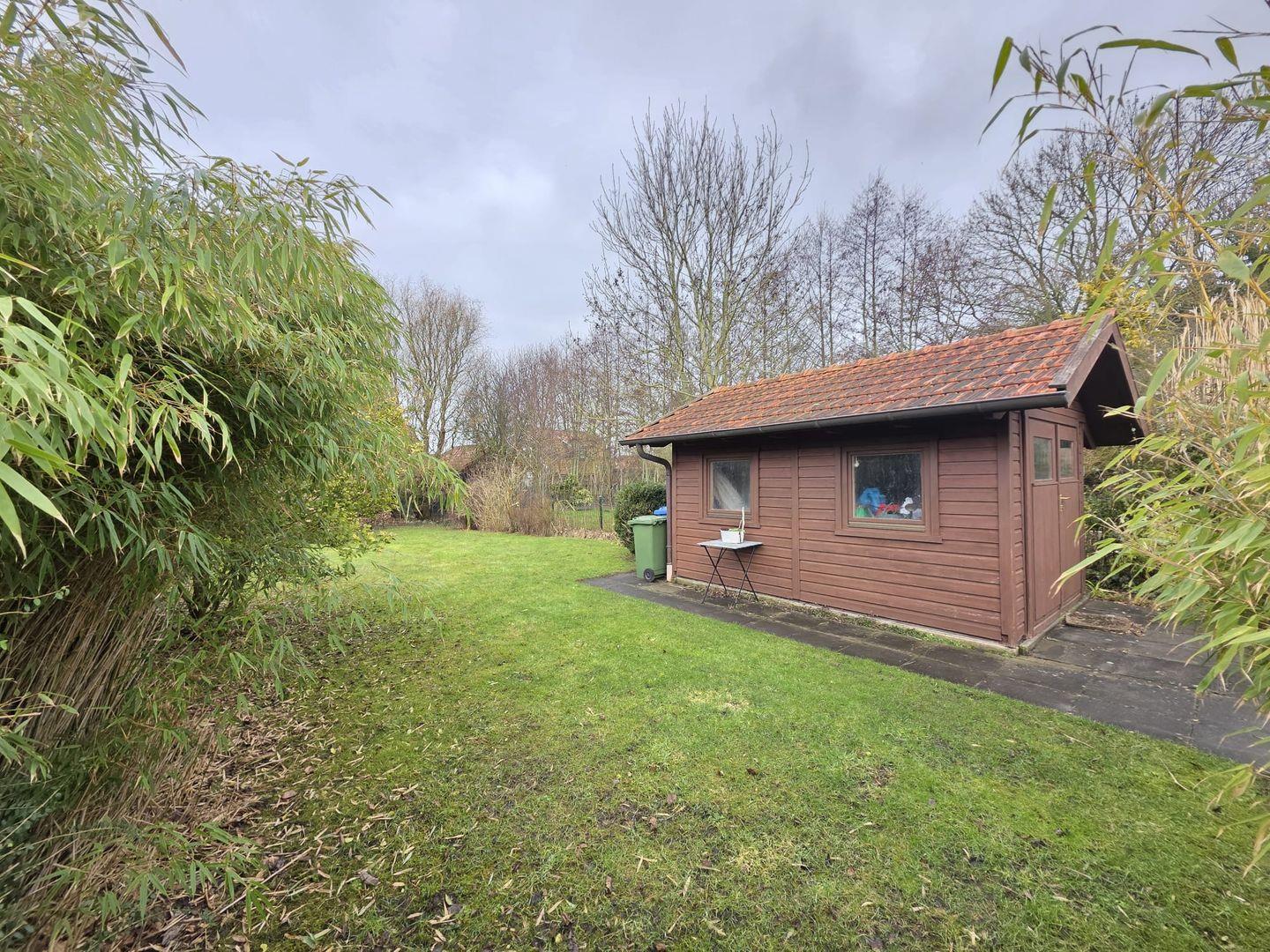 Hinter der Terrasse erstreckt sich der geschmackvoll angelegte, sichtgeschützte Garten – ein kleines Refugium der Erholung. In dem abschließbaren Gartenhaus können Fahrräder sicher untergestellt werden; außerdem finden Sie dort weiteres Kinderspielzeug.