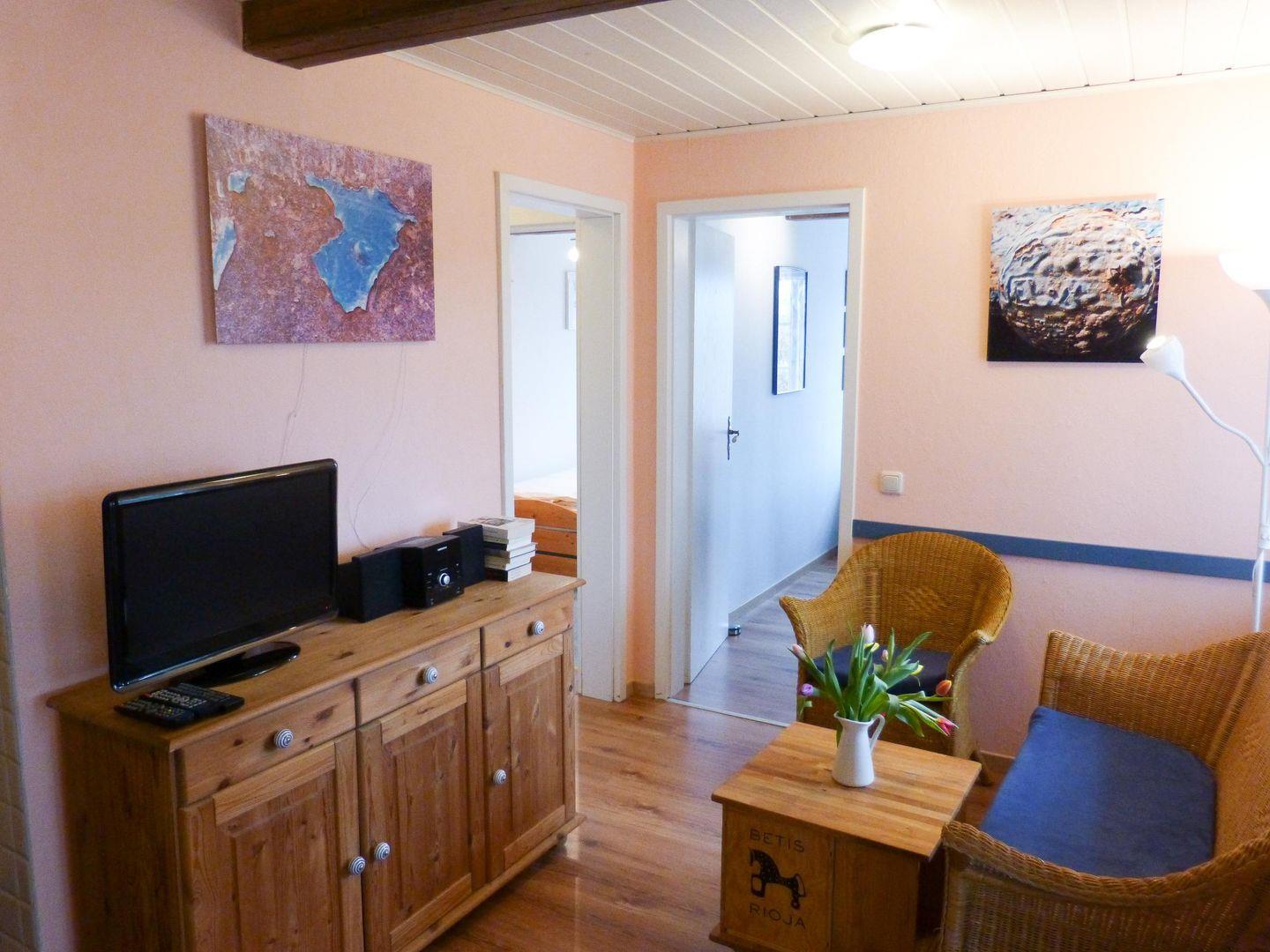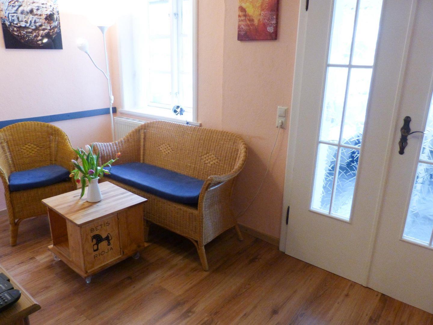 Die Wohnung verfügt über 1 Wohnraum mit WLAN, Sat-TV und offener Küche, 2 Schlafzimmer, 1 Badezimmer mit Dusche und WC; Wintergarten mit Esstisch, Garten mit Gartenmöbeln (April bis Oktober) zur Gemeinschaftsnutzung.