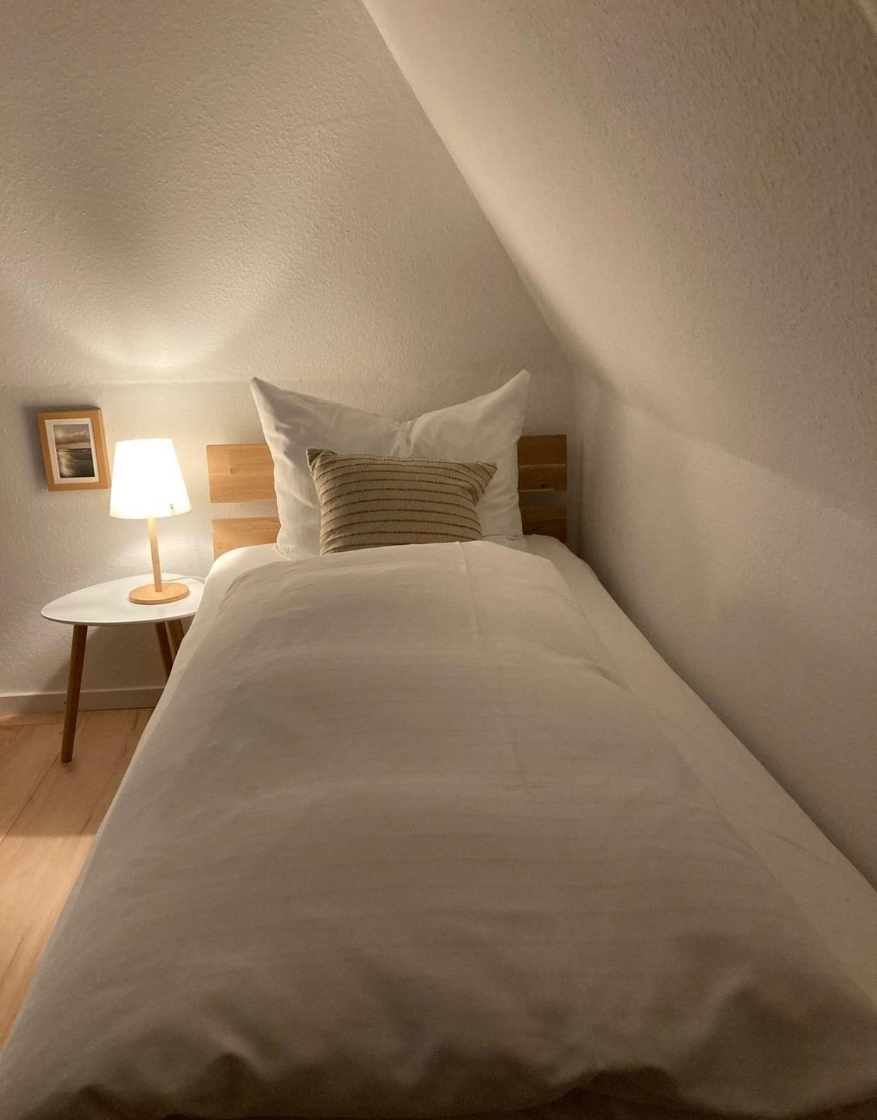 Die Ferienwohnung bietet eine komfortable und gut ausgestattete Unterkunft für erholsame Tage. Sie verfügt über ein Schlafzimmer mit einem Doppelbett und einem Einzelbett, ideal für Familien oder Paare. Das Duschbad ist modern und funktional.