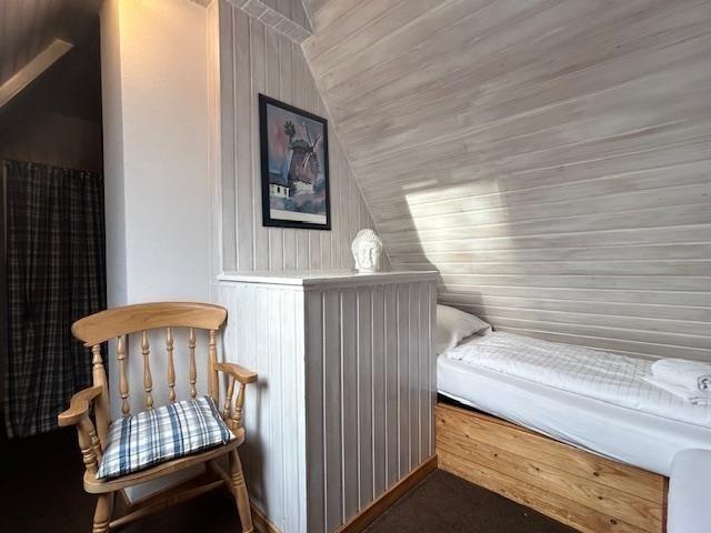 Das Haus Dünenrose in Nebel - Westerheide bietet eine gemütliche Maisonettwohnung im Obergeschoss für bis zu 4 Personen. Die helle und freundliche Atmosphäre wird durch weiße Holzvertäfelungen unterstrichen. Die Einrichtung erfolgt mit stilvollen Eichenmöbeln im Bauernstil. Die Raumaufteilung umfasst ein Badezimmer mit Dusche (Einstieg 24 cm) und WC sowie zwei Schlafzimmer, die über eine steile Raumspartreppe zugänglich sind. Schlafzimmer 1 verfügt über ein Doppelbett mit seitlichem Einstieg und Dachschrägen, während Schlafzimmer 2 mit zwei Einzelbetten ausgestattet ist. Gästen steht ein großer Gemeinschaftsgarten zur Verfügung, ebenso wie ein überdachter Radständer und ein Parkplatz am Haus. Zudem sind Waschmaschine und Trockner kostenfrei nutzbar. Hunde sind herzlich willkommen, jedoch gegen Aufpreis.