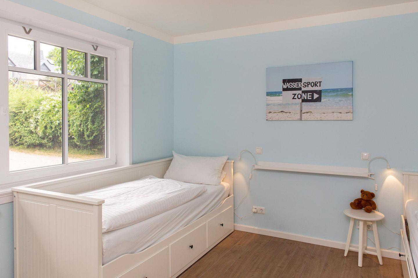 Das Kinderzimmer ist liebevoll dekoriert und mit zwei Einzelbetten ausgestattet. Die Betten können ausgeklappt werden, sodass in diesem Zimmer bis zu 4 Kinder Platz finden.