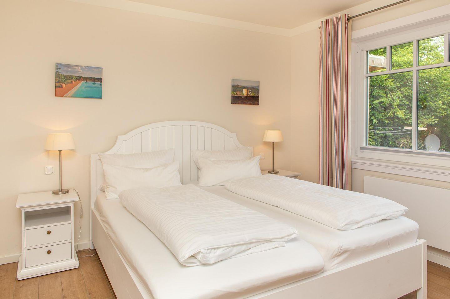 Im ersten Schlafzimmer steht für Sie ein Doppelbett mit orthopädischen Matratzen bereit.