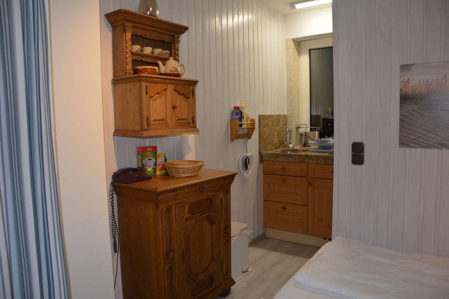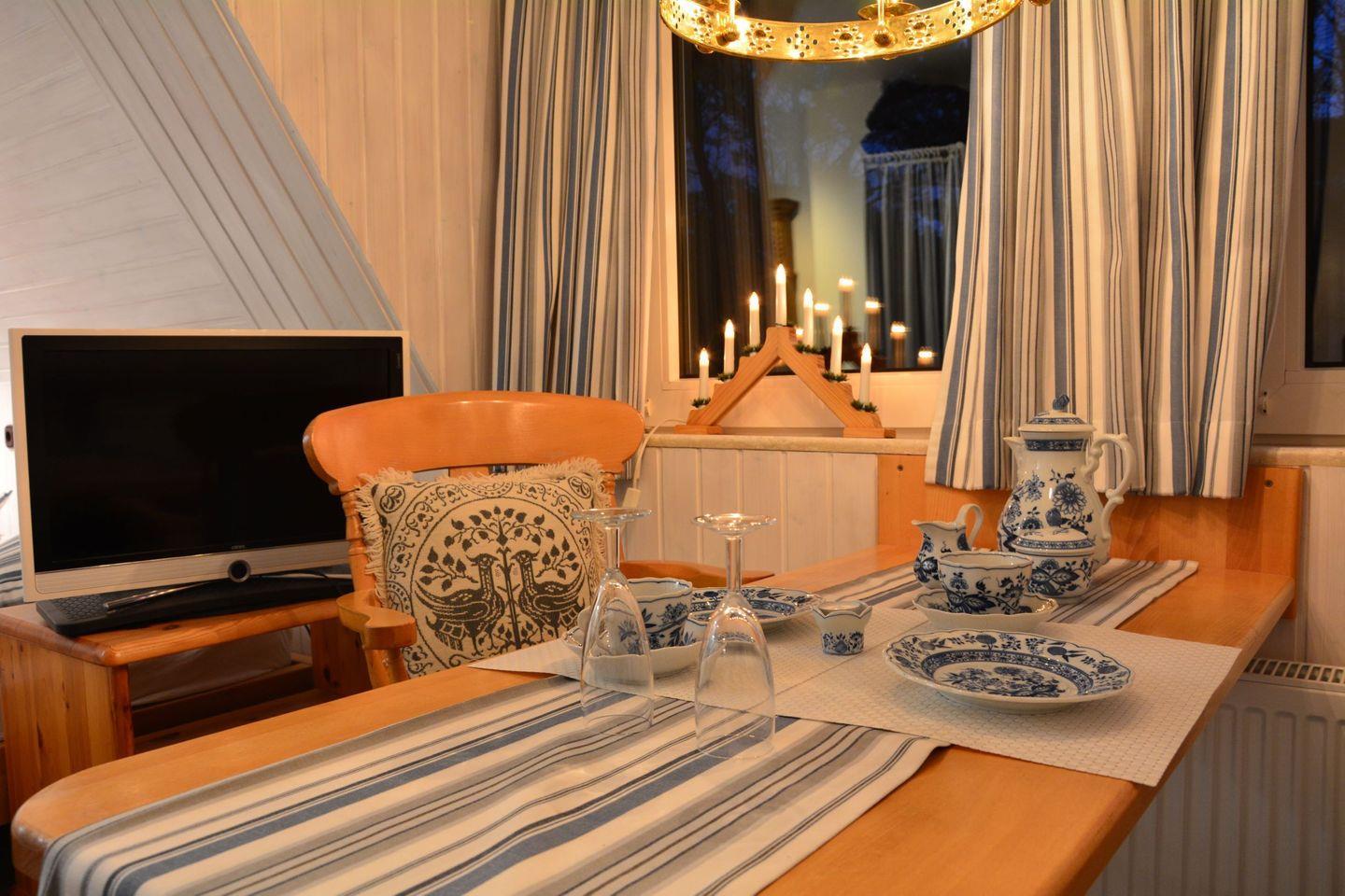 Stilvolle Wohnung für bis zu 2 Personen im Obergeschoß des Hauses mit gemütlicher Einrichtung.Die behagliche Essecke mit Friesenporzellan lädt zum Genießen ein.