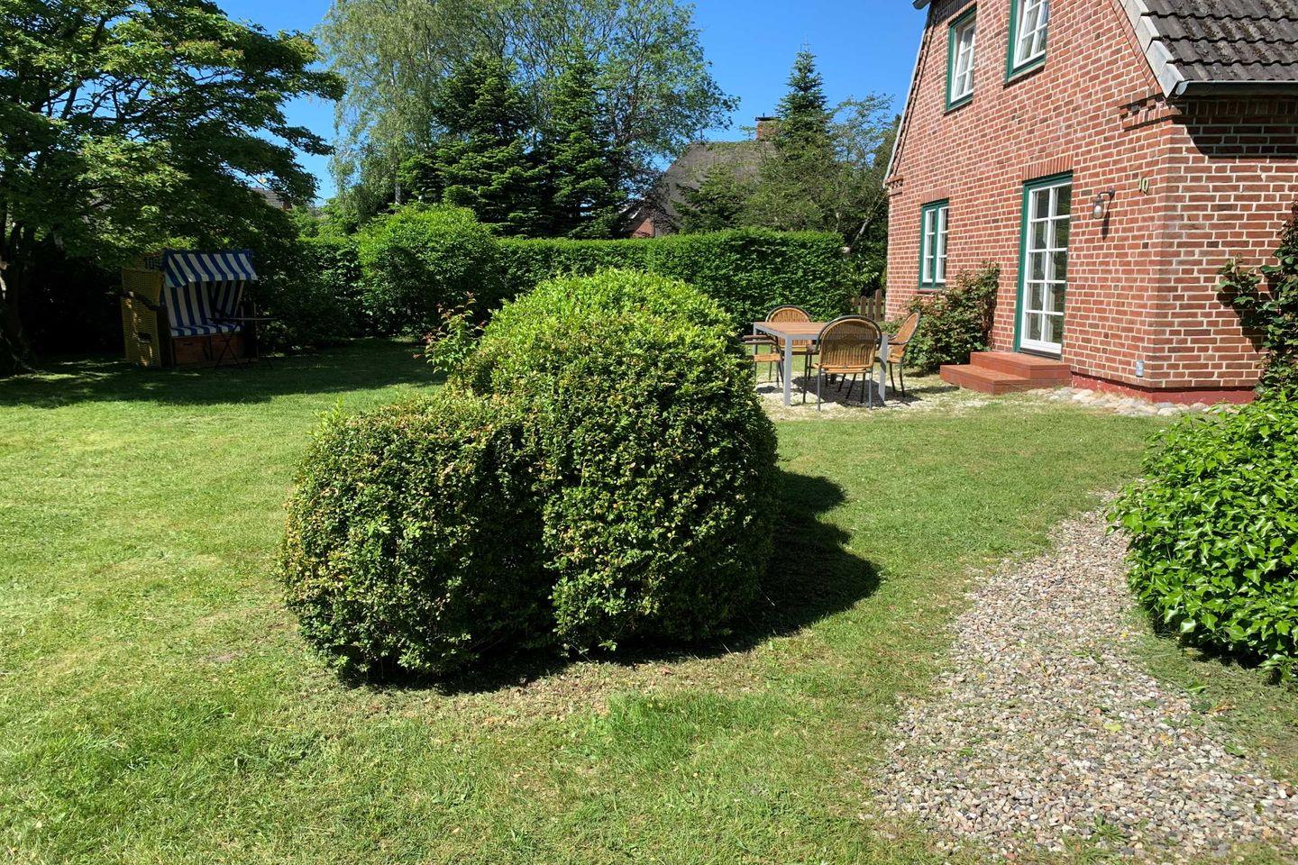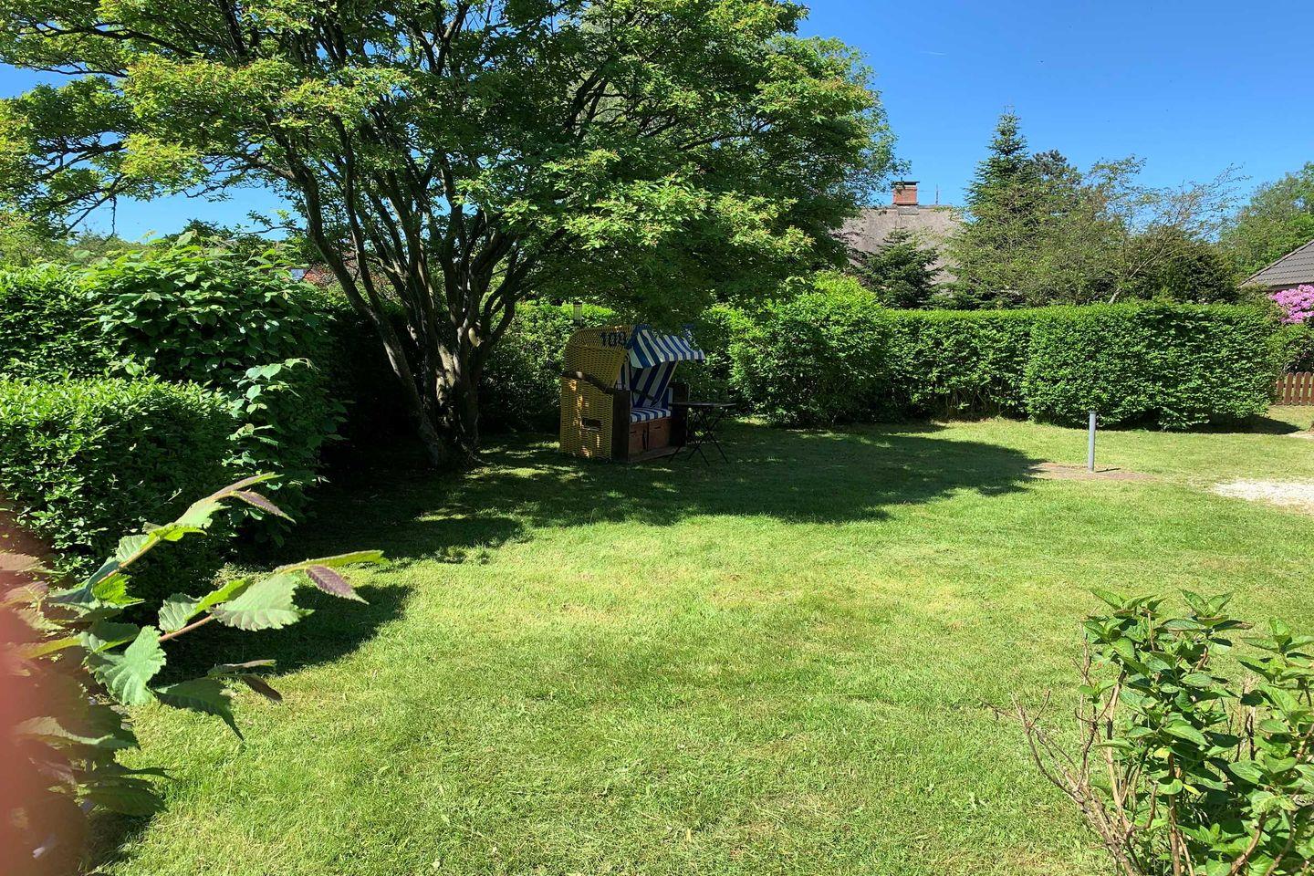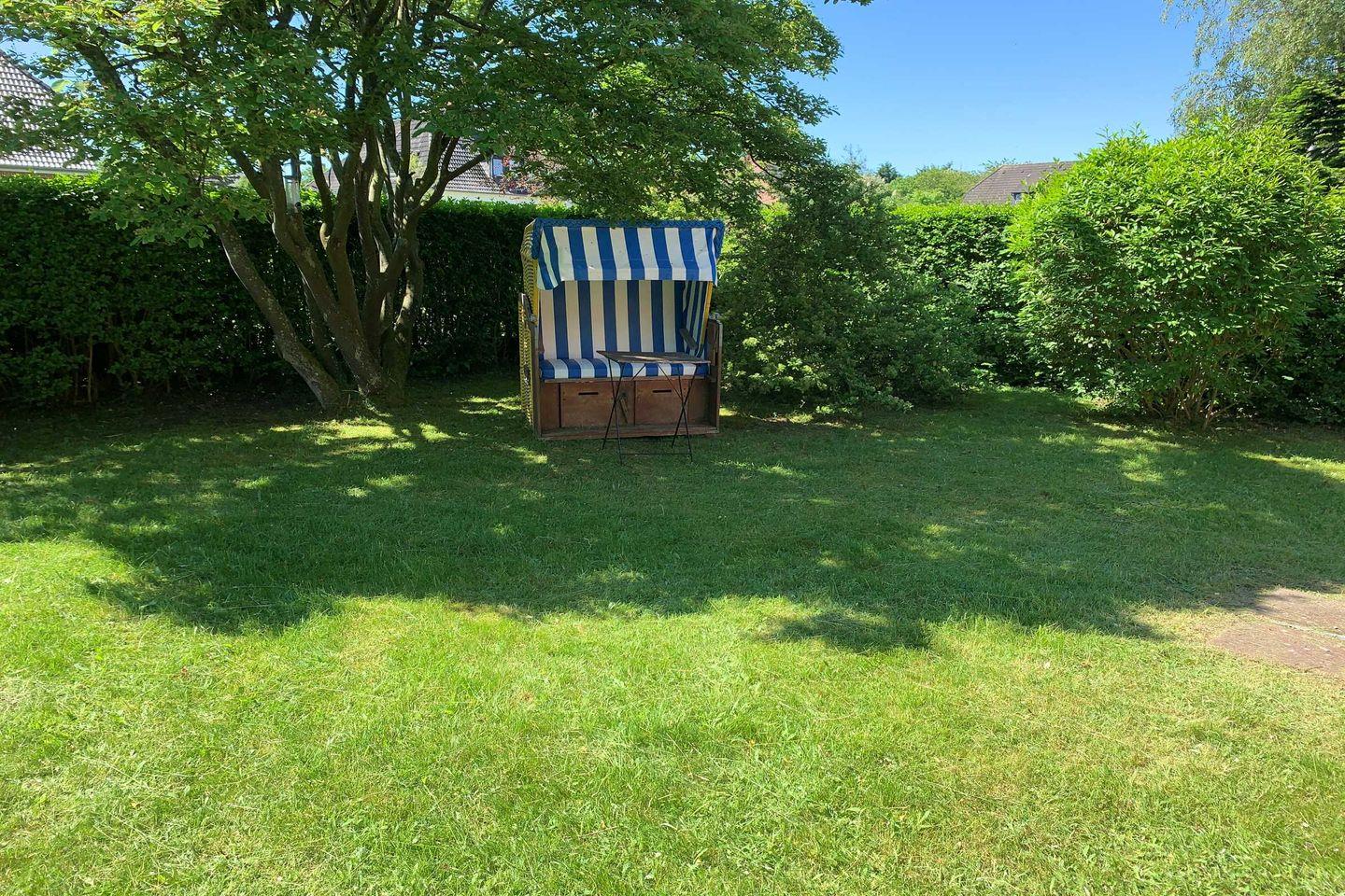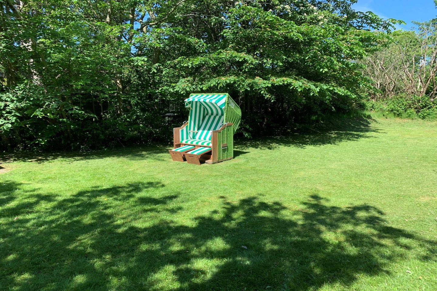 Garten mit Sonnen- und Schattenplätzen und Strandkörben auf 1.700 m² großem Grundstück, Bollerwagen für den Weg zum Strand. Unterstellplätze für Fahrräder und Stellplatz für Auto am Haus.