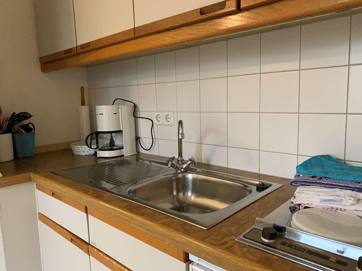 Die Gartenwohnung liegt direkt am Garten mit Terrasse. Sie hell und komfortabel ausgestattet. Das Wohnzimmer hat einen Laminatboden, eine bequemes kleines Sofa, sowie einen kleinen Eßbereich. Von der Küche kommen sie direkt in den Garten. Das helle moderne Tageslichtbad erreichen sie über den kleinen Eingangsflur. Das zweckmässig ausgestattete Schlafzimmer mit Doppelbett liegt neben dem Wohnzimmer.