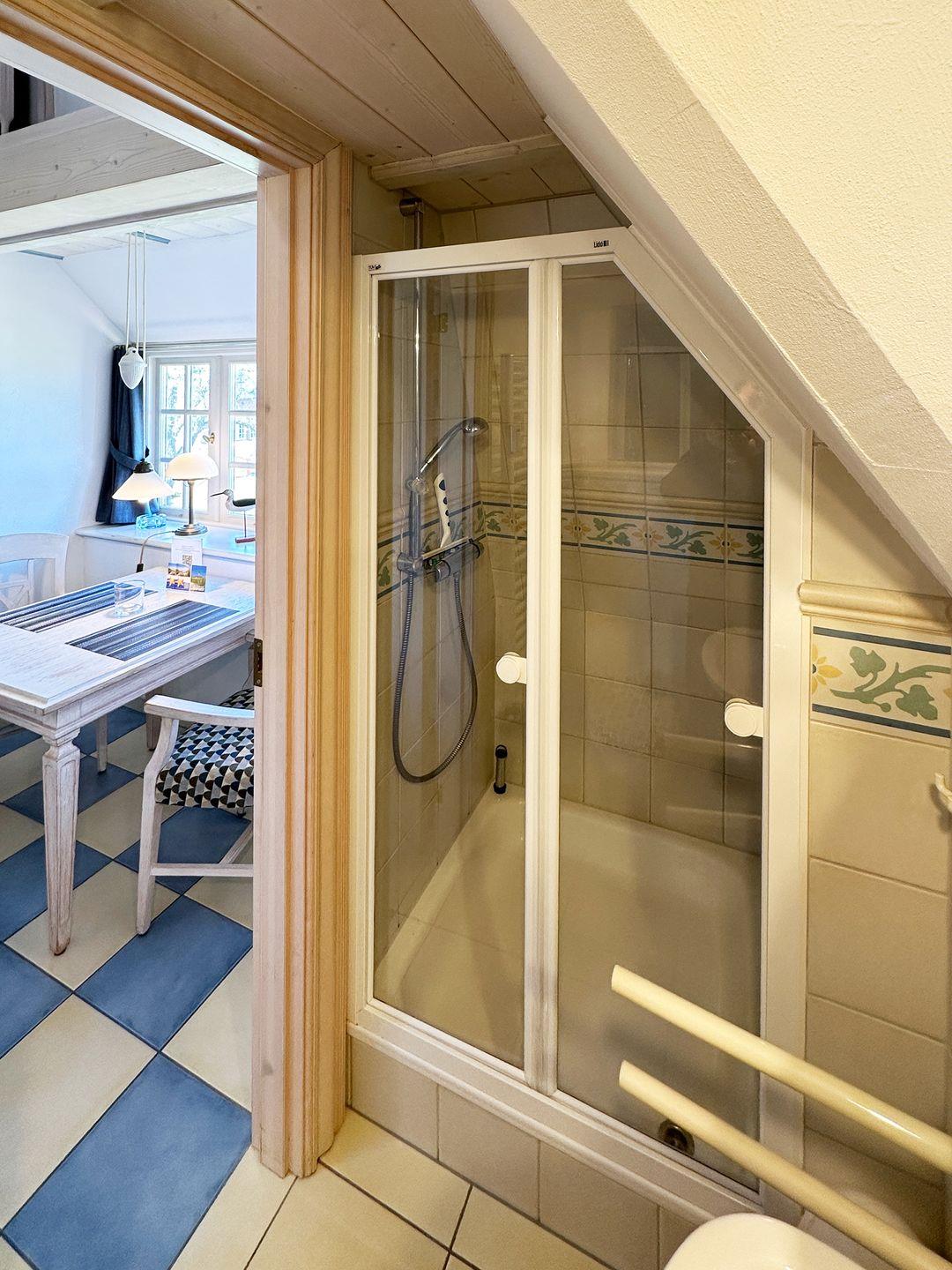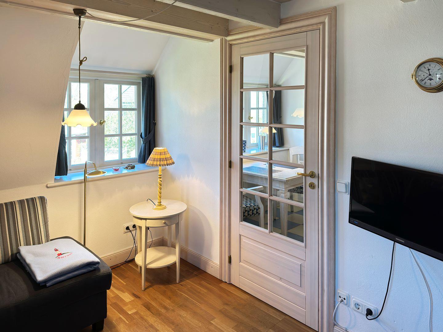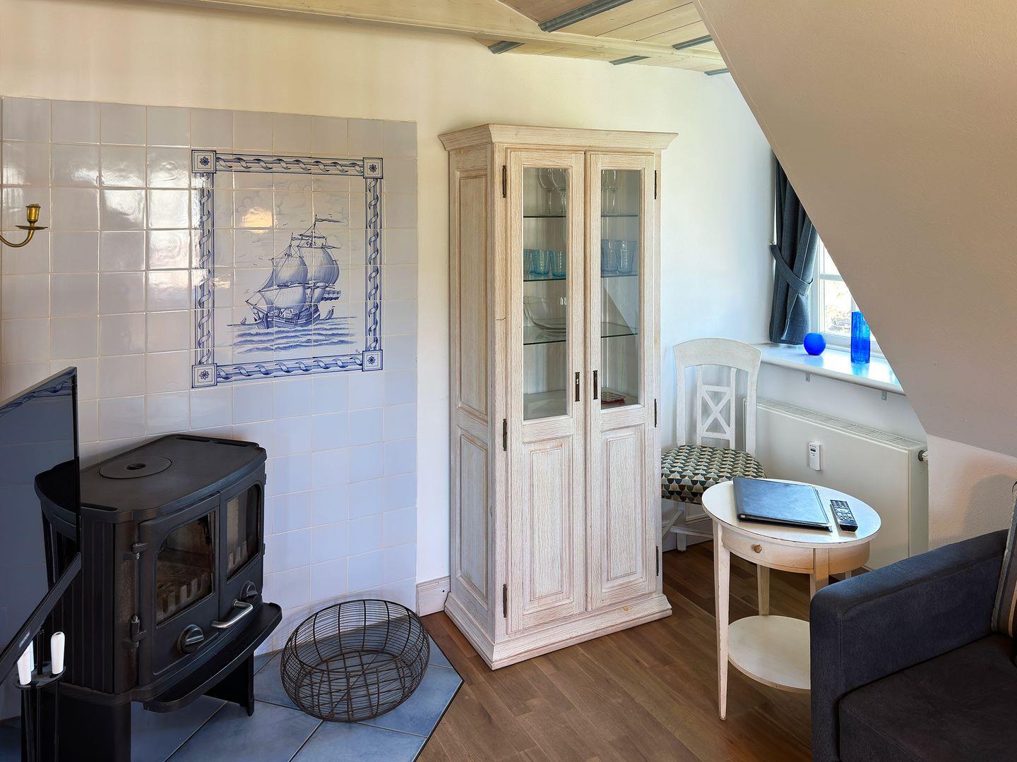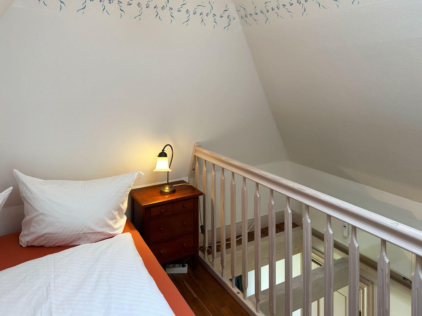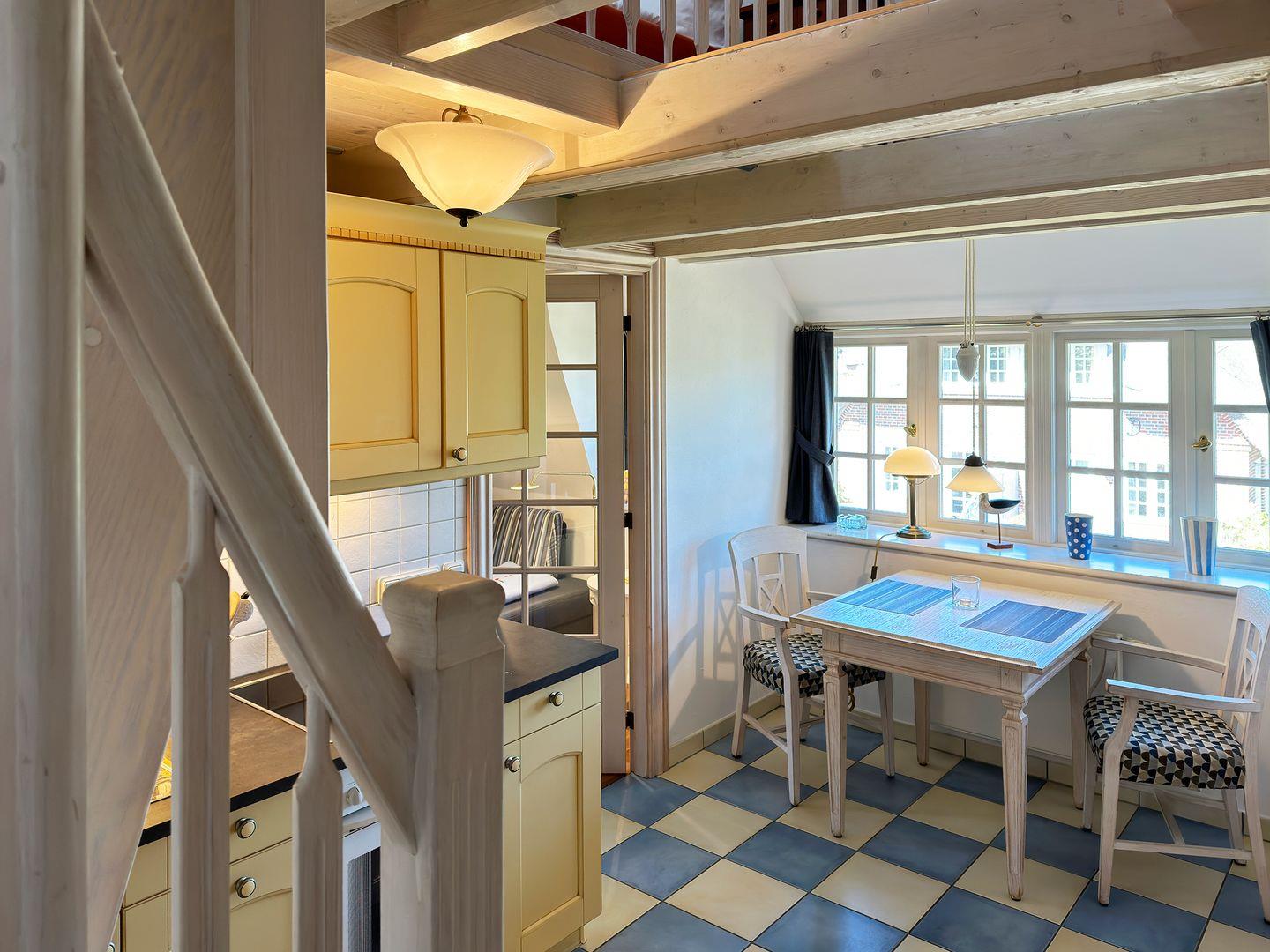 Die Ferienwohnung 9 im Haus Hafis (Friesenhof) in Nebel auf Amrum ist eine 1,5-Zimmer-Maisonette-Ferienwohnung unter Reet (ca. 29 qm Wohnfläche) mit Schlafmöglichkeiten für 1 bis 2 Personen. Die Ferienwohnung befindet sich im 1. Ober- und Dachgeschoss.