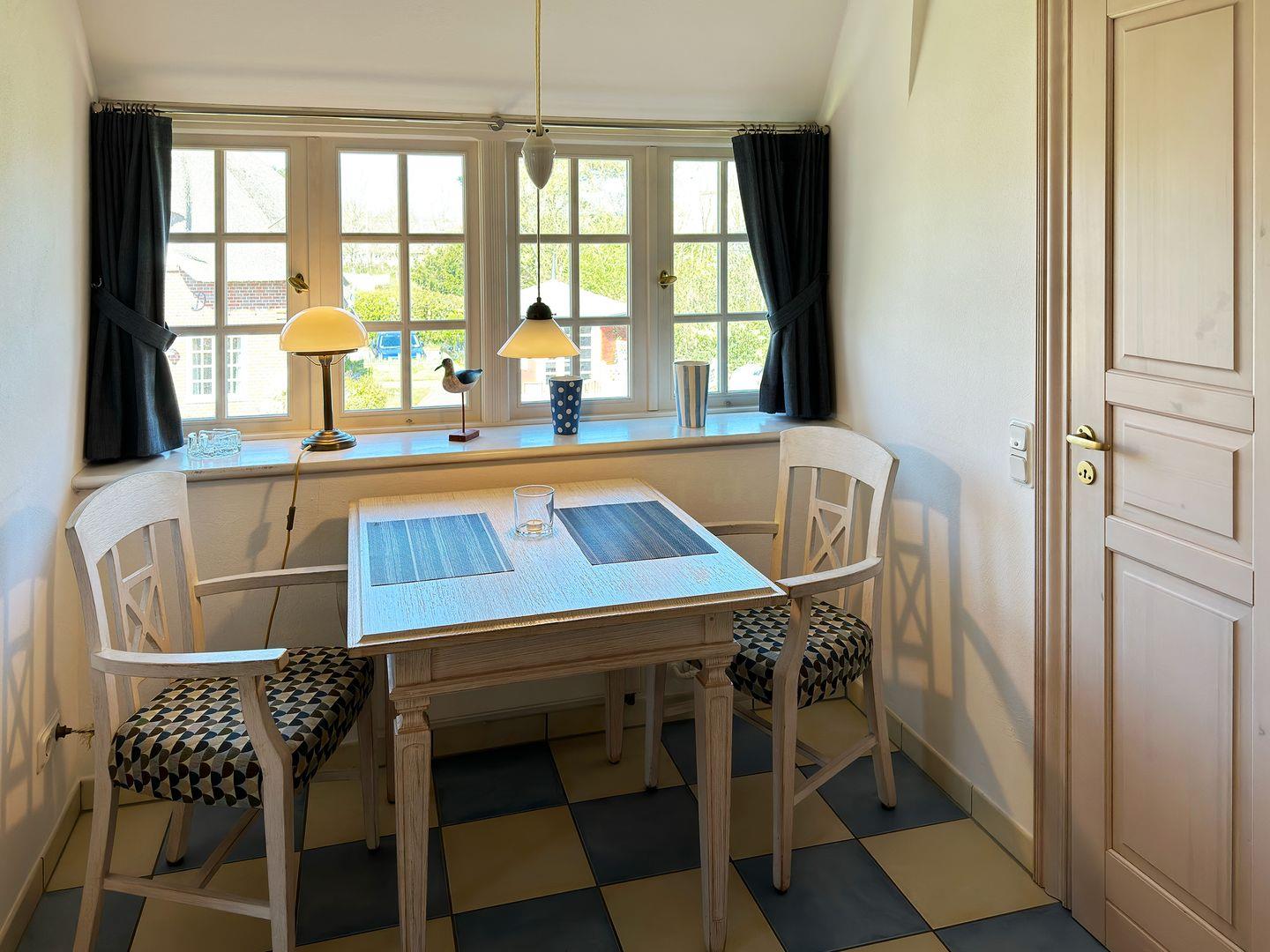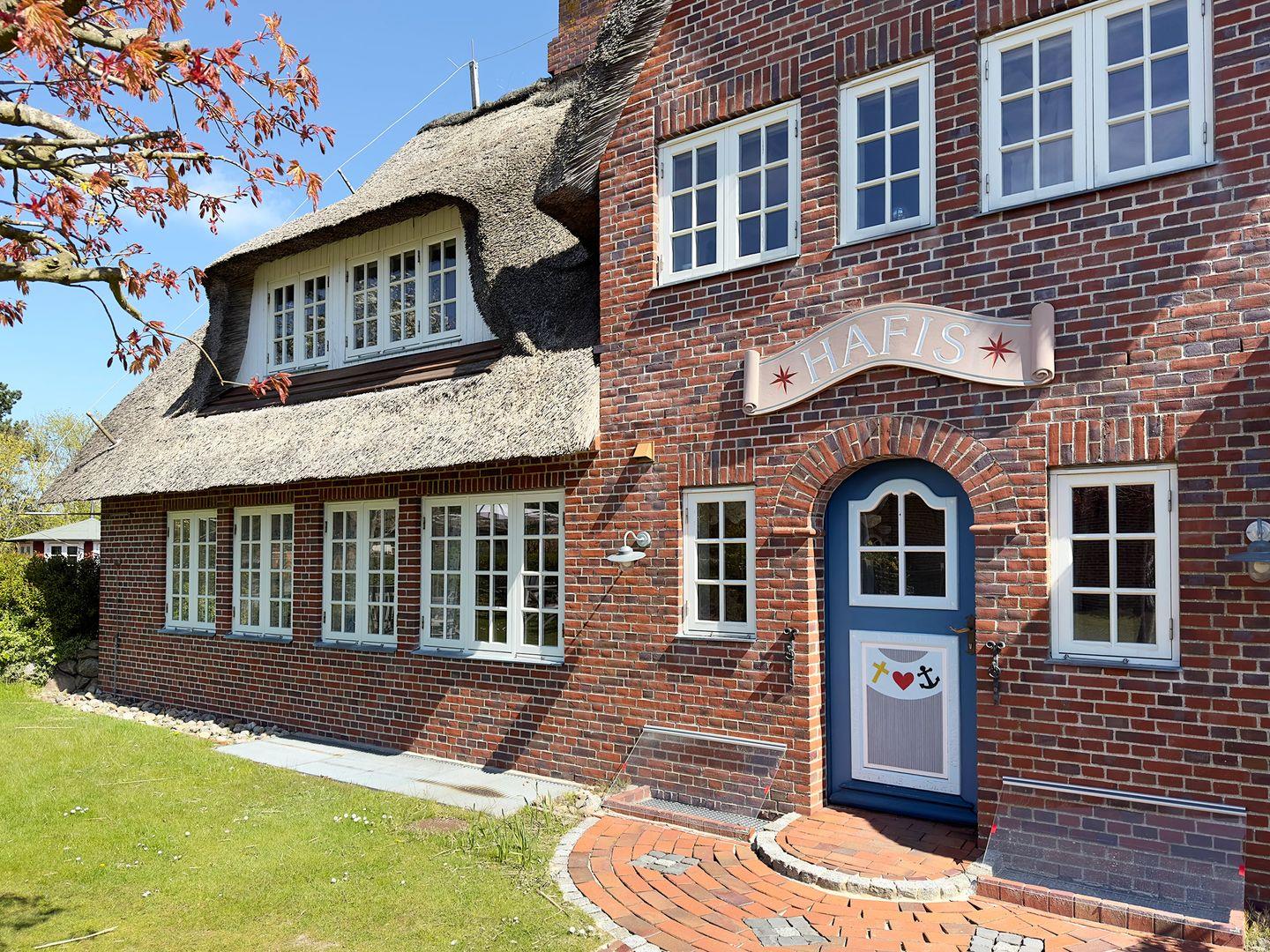 Die Ferienwohnung 9 im Haus Hafis (Friesenhof) in Nebel auf Amrum ist eine 1,5-Zimmer-Maisonette-Ferienwohnung unter Reet (ca. 29 qm Wohnfläche) mit Schlafmöglichkeiten für 1 bis 2 Personen. Die Ferienwohnung befindet sich Eingang linke Seite im 1. Ober- und Dachgeschoss.