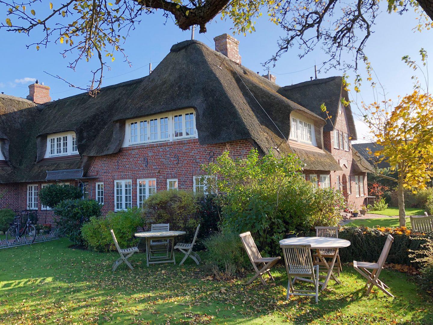 Charmante Maisonette-Ferienwohnung unter Reet mit Gartenblick in Nebel auf Amrum, nur 800 m vom Strand entfernt.