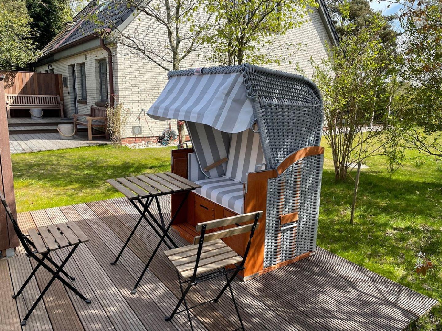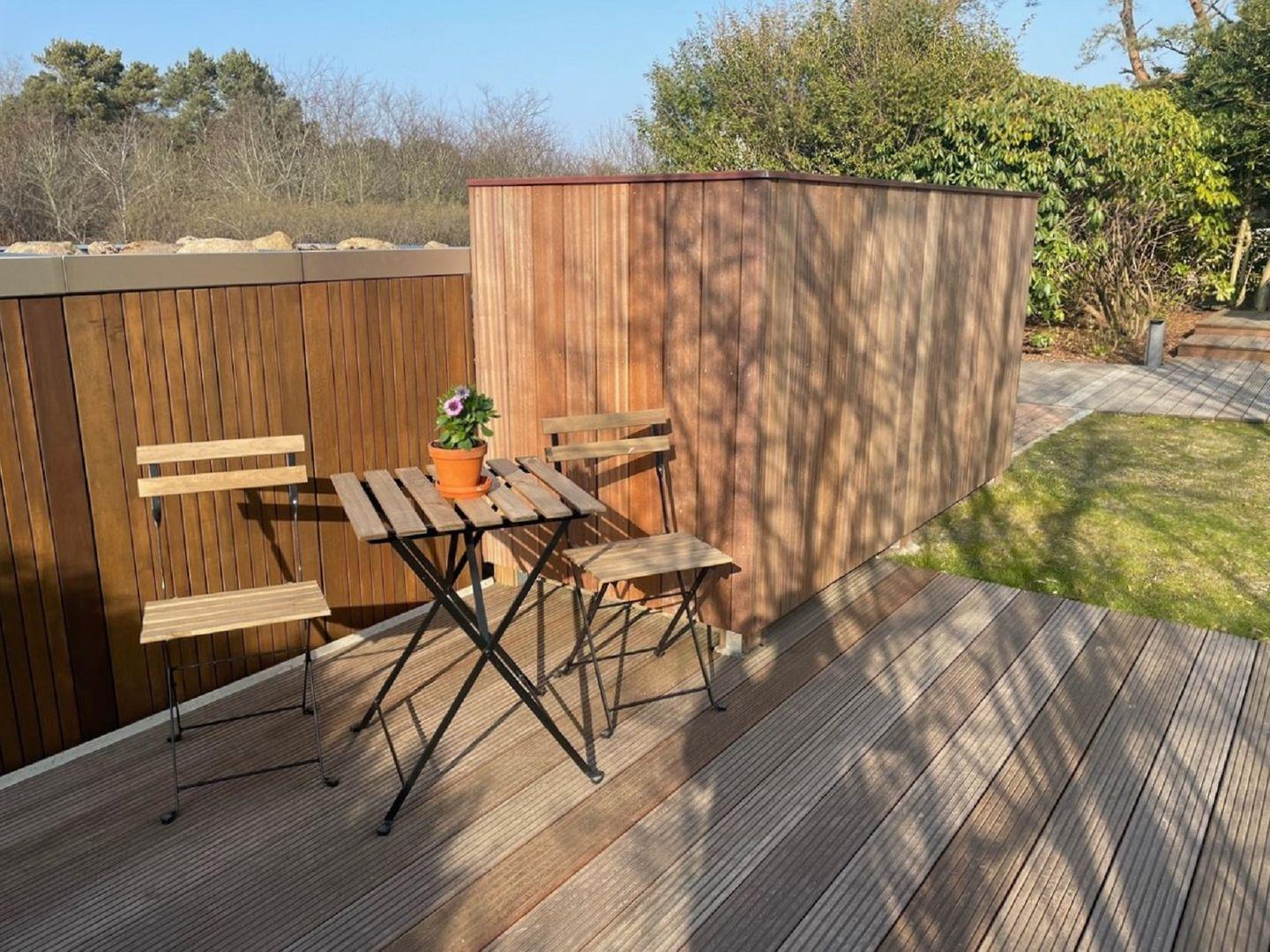 Im Außenbereich steht eine Sitzecke mit Bangkirai-Dielen und Gartenmöbeln für Sie bereit.