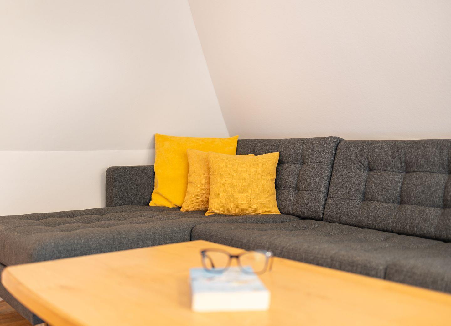 - Wohnzimmer mit Sofa, Sessel, Flachbild-TV und Essecke
