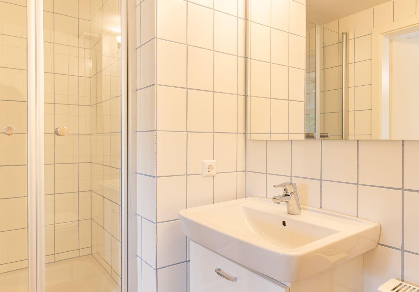 - Badezimmer mit WC, Waschbecken, Spiegel, Dusche und Fön
