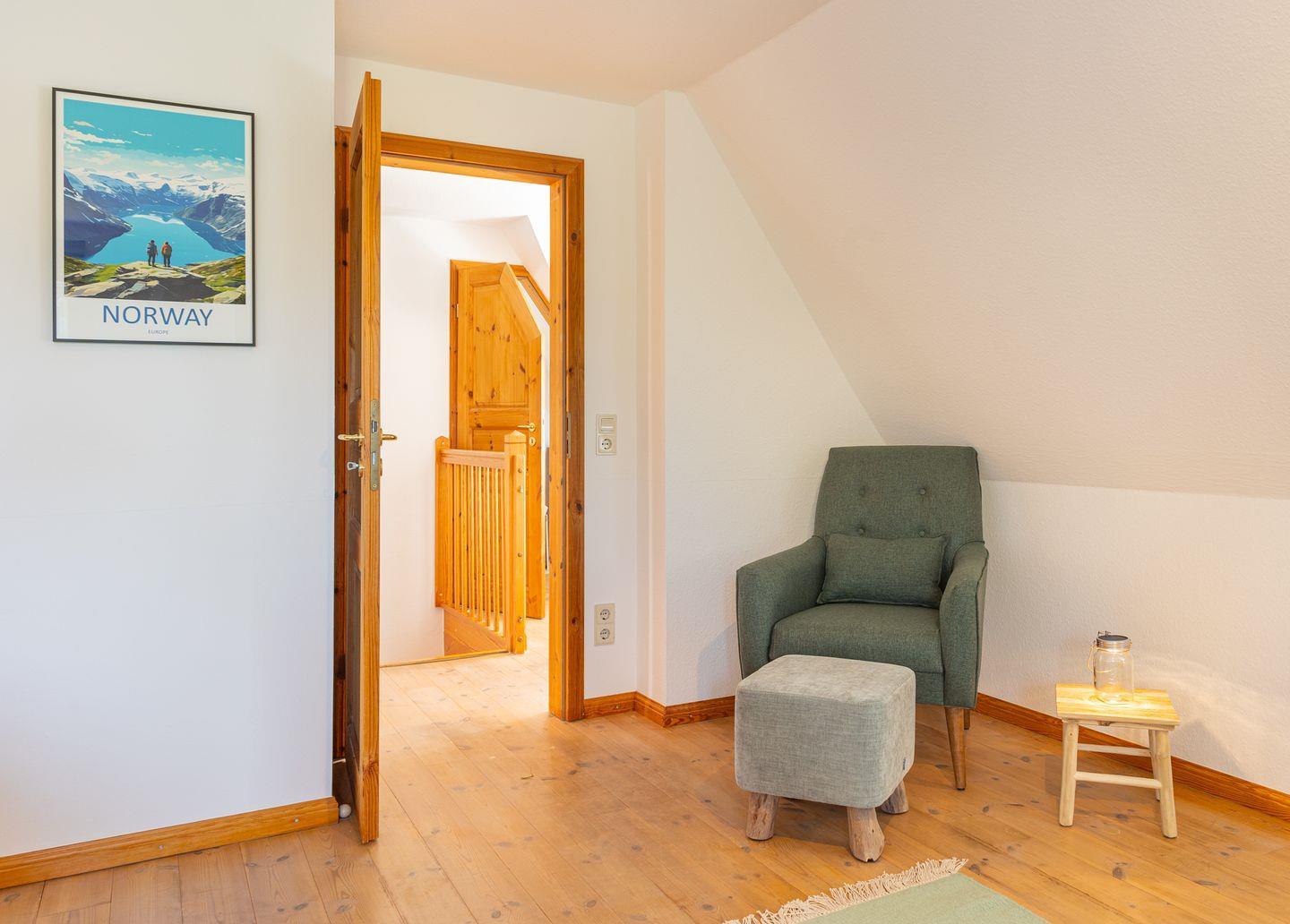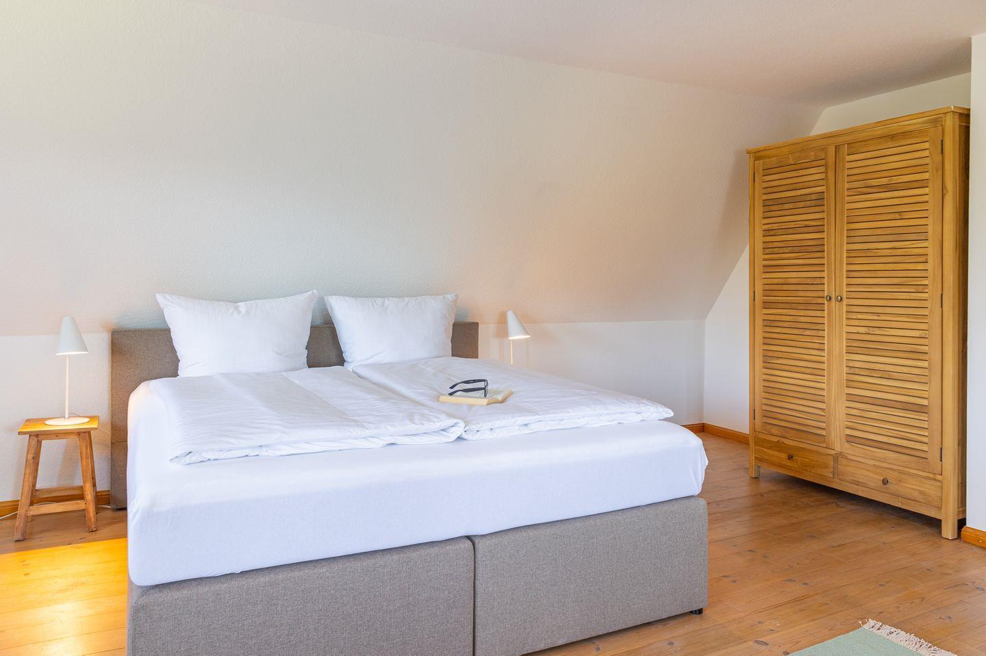 Im ersten Stockwerk finden sich die zwei Schlafzimmer. Sie sind jeweils mit einem 1,80 m breiten Boxspringbett ausgestattet. In jedem Zimmer befindet sich ein Schrank. Das Bad mit Badewanne ist ebenfalls im ersten Obergeschoß. Im Flur steht Ihnen außerdem ein Schreibtisch zur Verfügung.