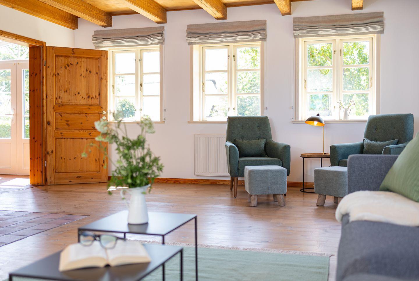 Die Räume im Friesenhaus teilen sich auf in einem großen Flur im Erdgeschoß, eine große separate Küche mit Esstisch und ein großes Wohnzimmer mit vielen gemütlichen Sitzplätzen. Im Erdgeschoß befindet sich zusätzlich ein Hauswirtschaftsraum mit einer Waschmaschine und einem Trockner.