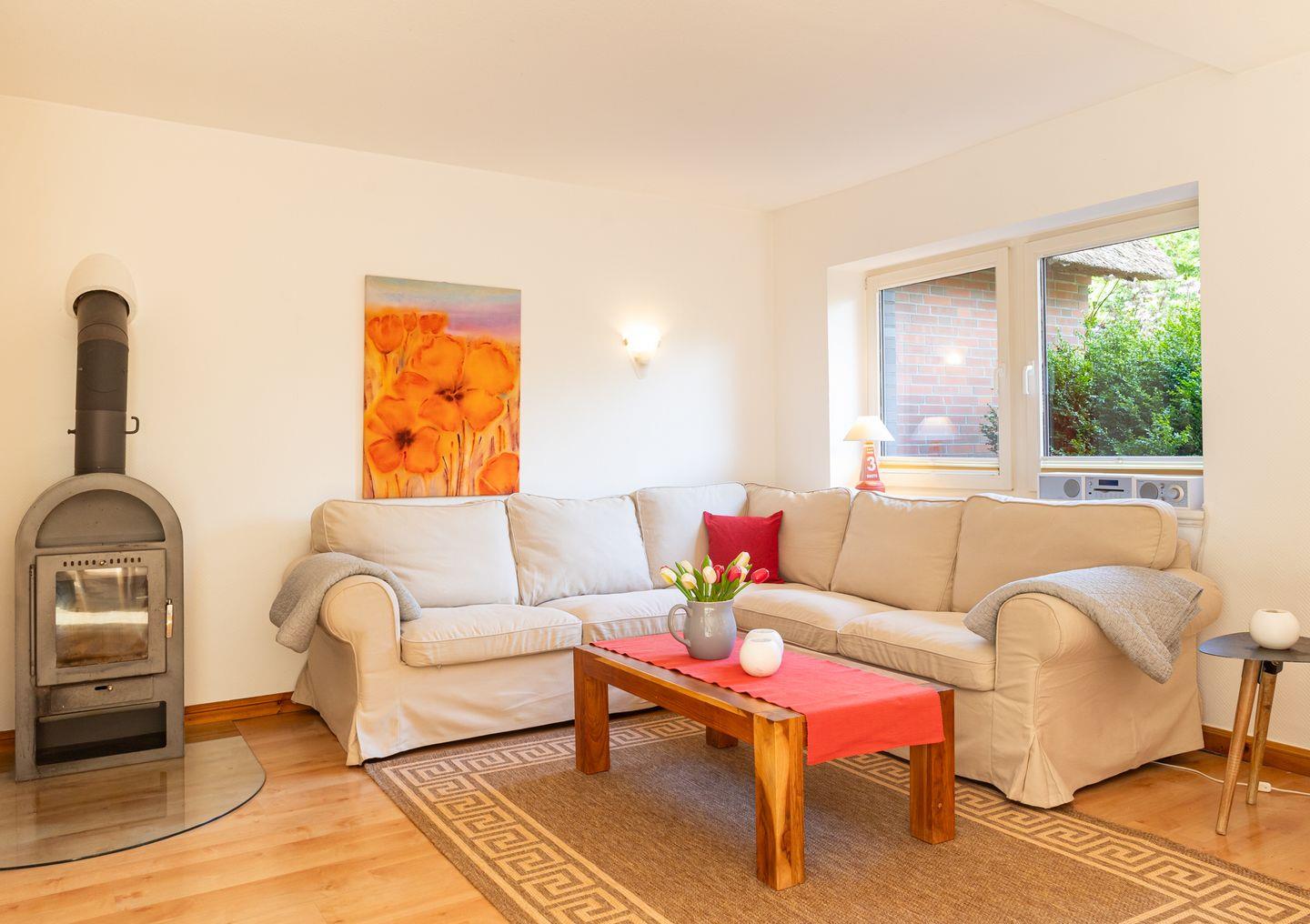 Das 4-Sterne-Haus bietet Ihnen allen Komfort für bis zu 4 Personen mit Wohnzimmer, Küche, Bad, Gäste WC, zwei separaten Schlafzimmern und einem gemütlichen dänischen Ofen.