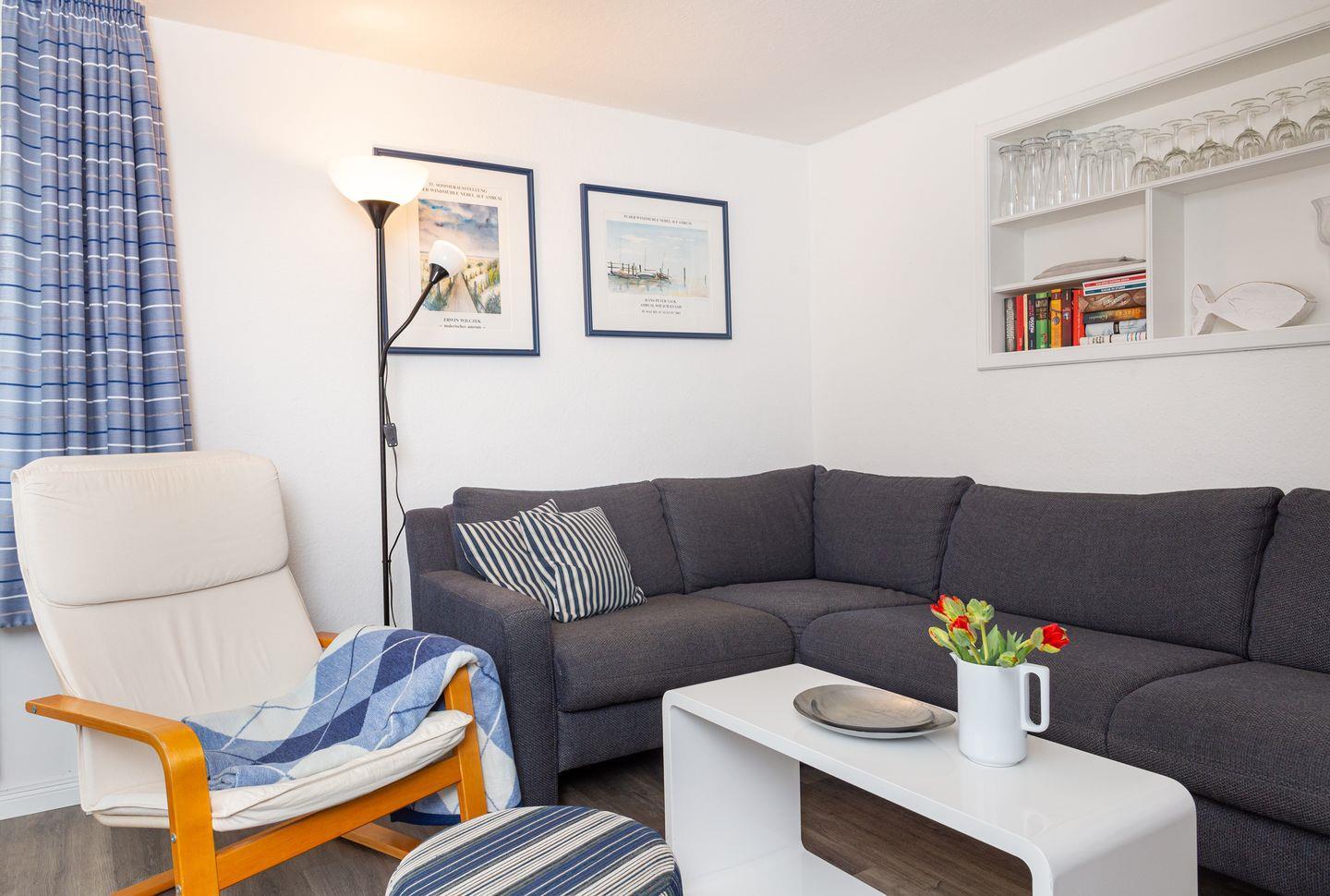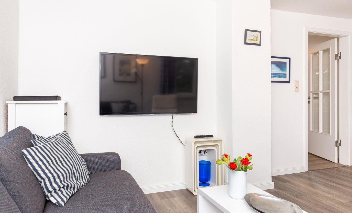 - Wohnzimmer mit Sofa, Sessel, Flachbild-TV und Essecke