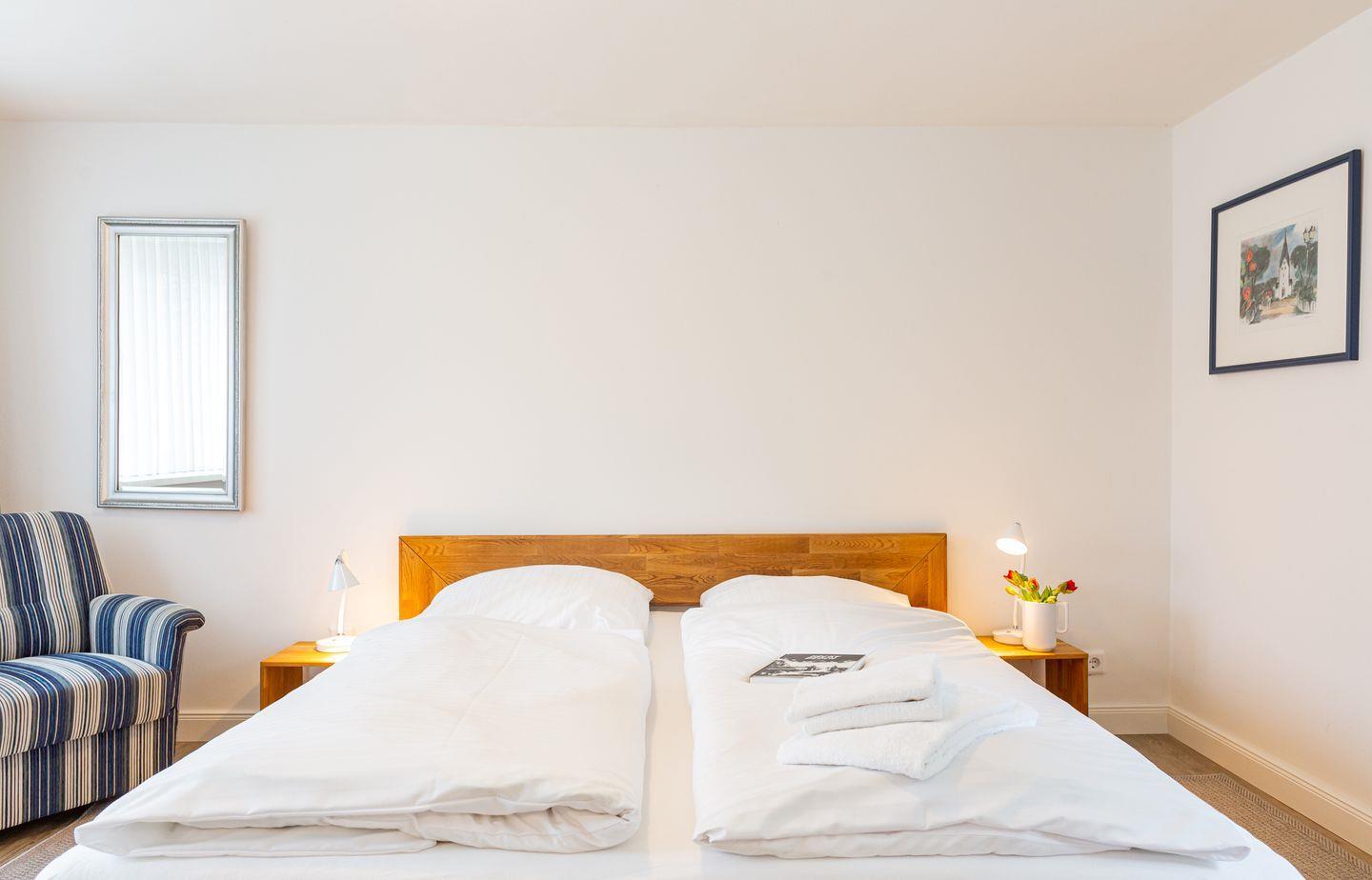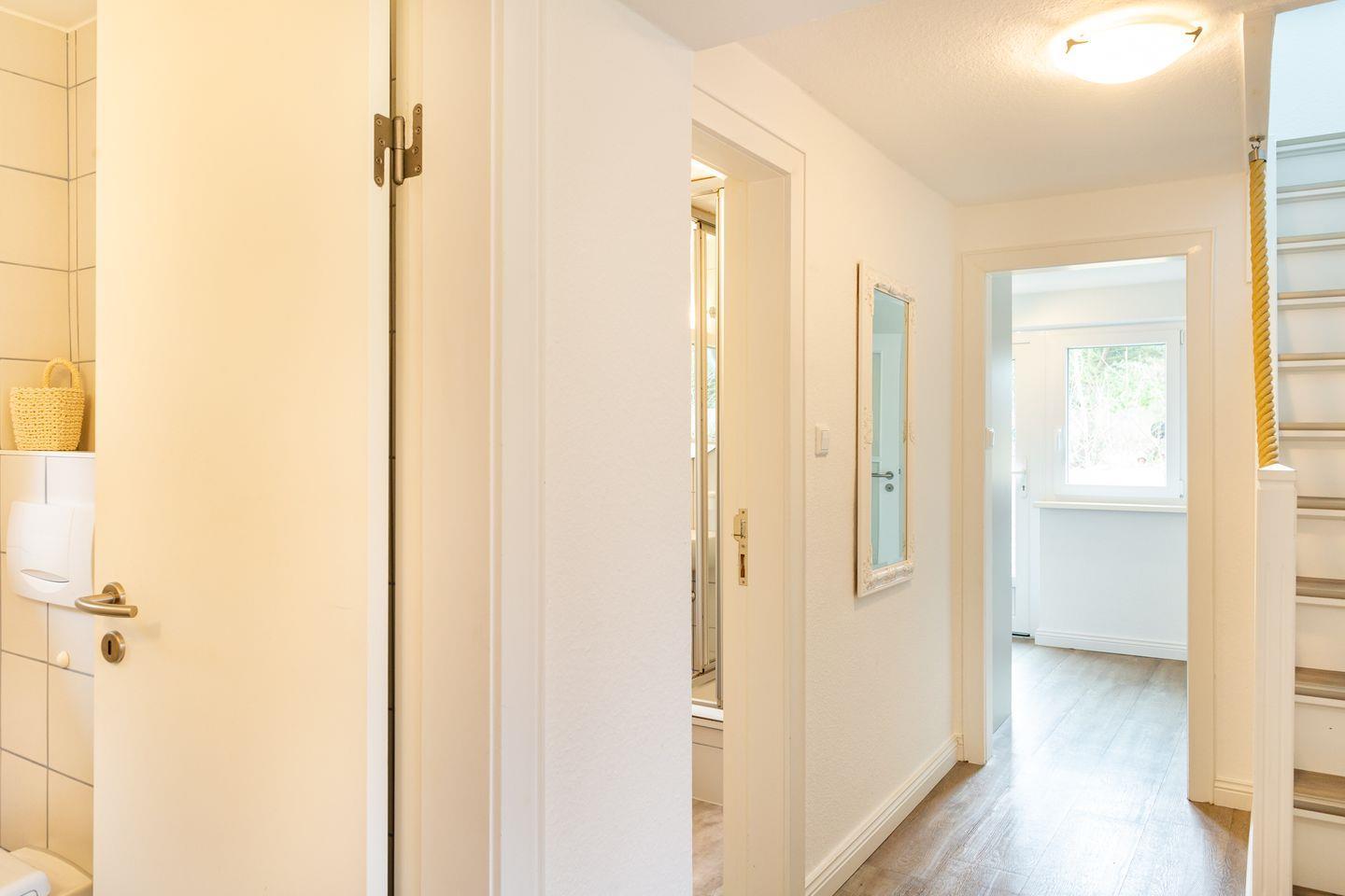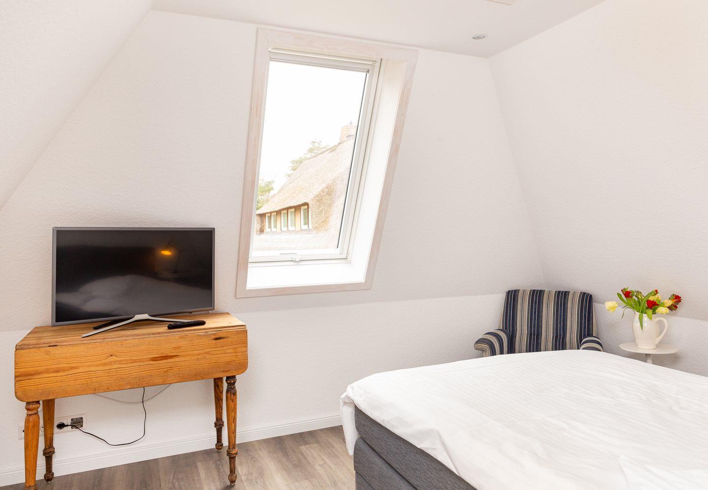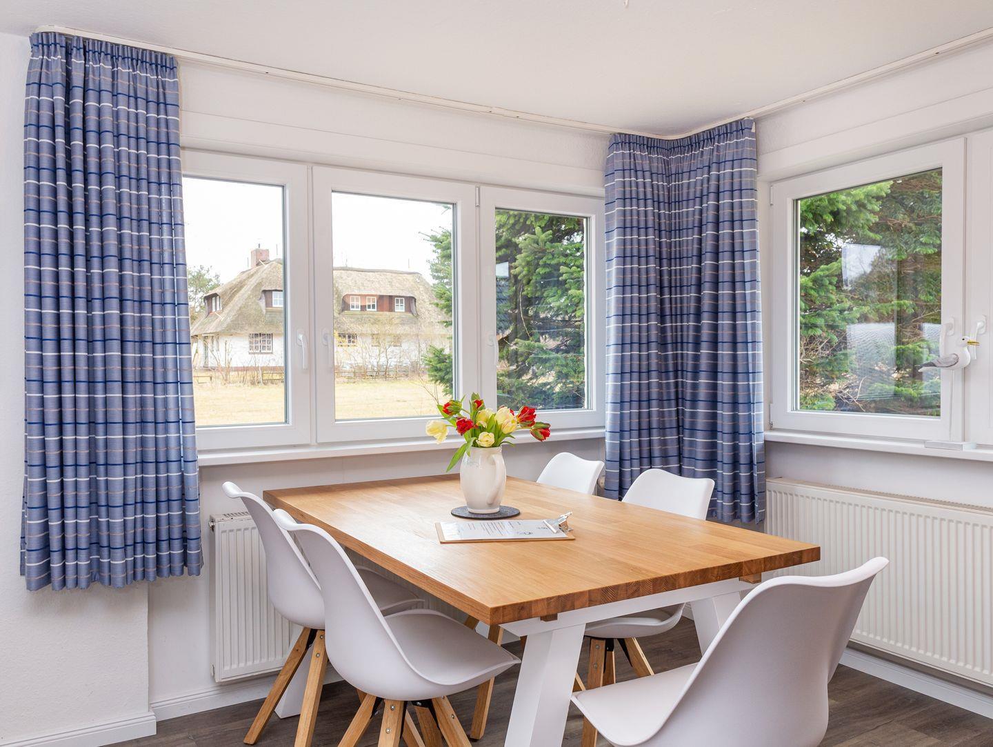 Das kleine Haus der Familie Petersen liegt in Nebel im Ortsteil Westerheide. Dort machen Sie Urlaub in unmittelbarer Nähe zum Wald der Nordseeinsel Amrum. Es ist von einem großen Garten umgeben, der Ihnen zur Verfügung steht. In diesem süßen Ferienhaus können Sie mit 5 Personen Ihren Urlaub verleben. Es verfügt über ein Doppelbettschlafzimmer, zwei separate Schlafzimmer, Gäste WC, Bad, eine Küche mit Terrasse und ein Wohnzimmer. Im kleinen Haus verbringen Sie Ihren Urlaub auf zwei Ebenen. Das Wohnzimmer mit einem Sofa, einem Sessel und einem Flachbild TV, sowie einem schönen Essplatz ausgestattet. Die separate Küche ist mit einem 4-Platten-Ceran-Kochfeld, einem Backofen, Kühlschrank, Spülmaschine und Toaster, Kaffeemaschine, Wasserkocher und Küchenutensilien ausgestattet. Im Bad finden Sie das WC, eine Dusche, Waschbecken und einen Fön. Es gibt im kleinen Haus ein zusätzliches Gäste WC. In der oberen Etage befinden sich zwei weitere Schlafzimmer. Eines ist mit einem Einzelbett möbliert. Das zweite Schlafzimmer ist mit einem Doppelbett ausgestattet.
