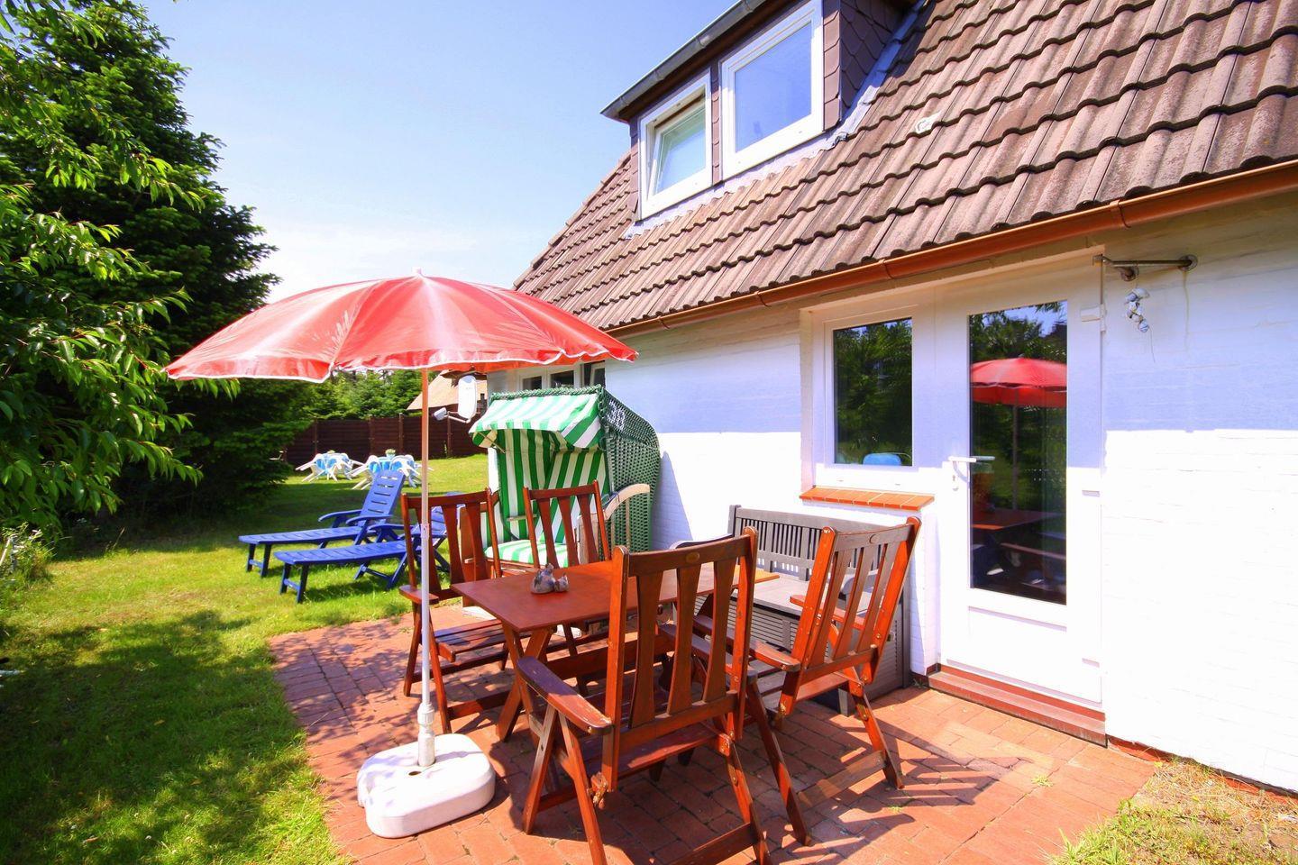 Das kleine Haus - ein süßes kleines Haus mit Garten, herrlichem Landschaftsblick in Nebel auf Amrum - WLAN, Gartenmöbel, für Familie - 5 Betten, private Terrasse, am Wald und in Strandnähe, Parkplatz, TV, 2 Ebenen