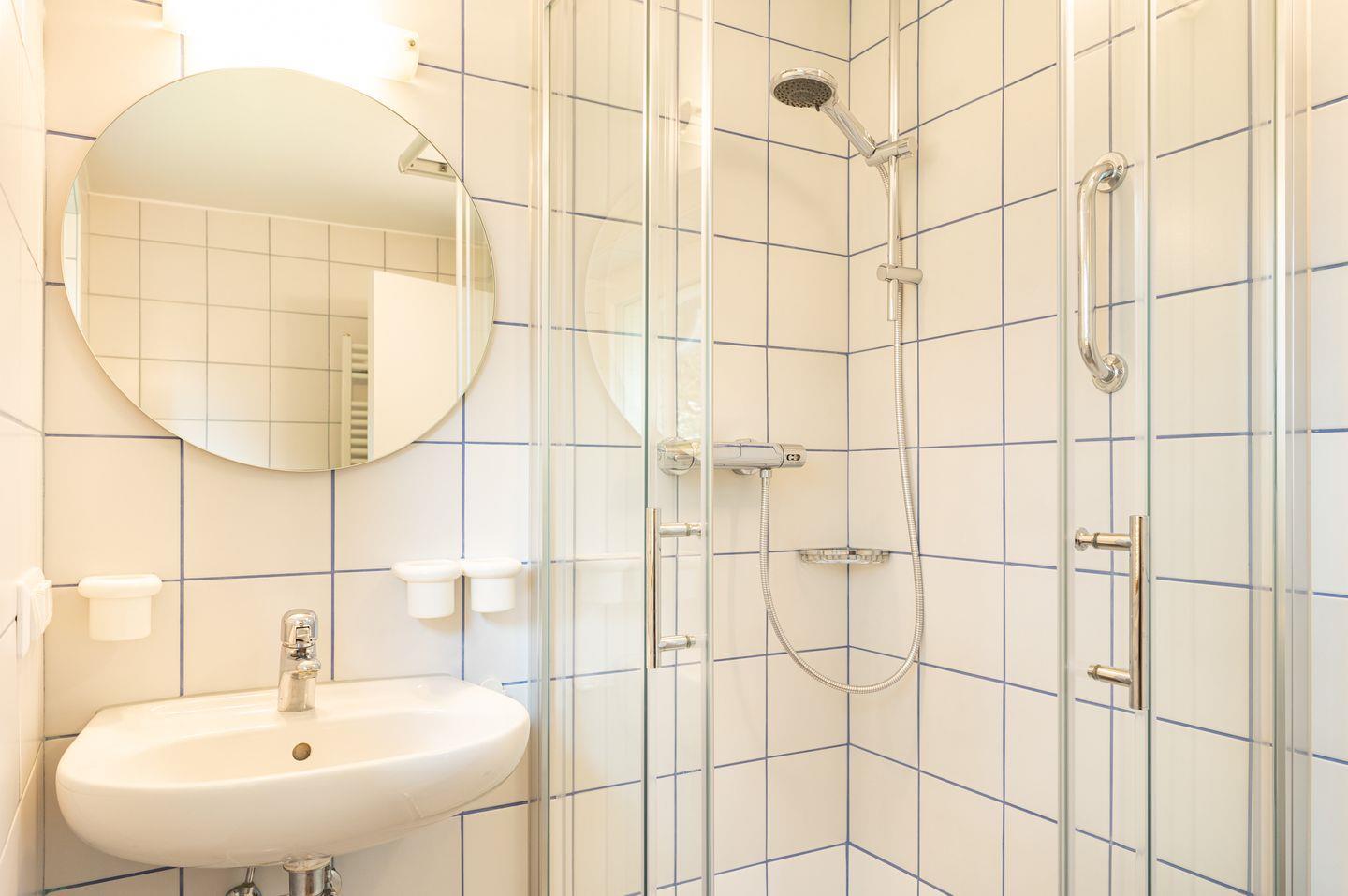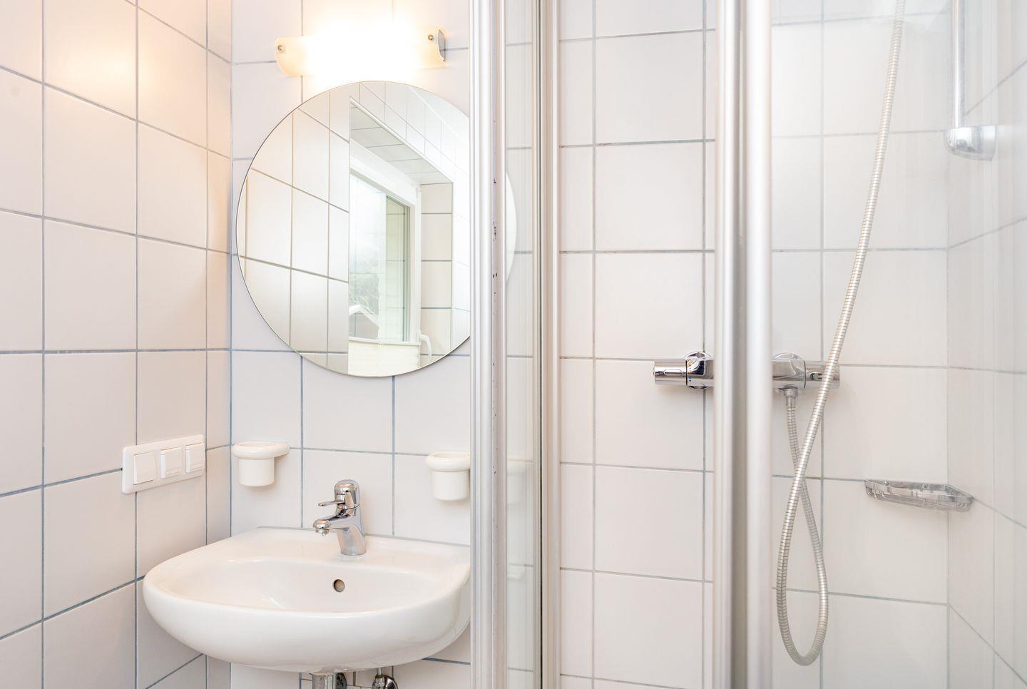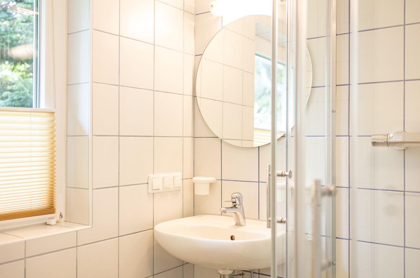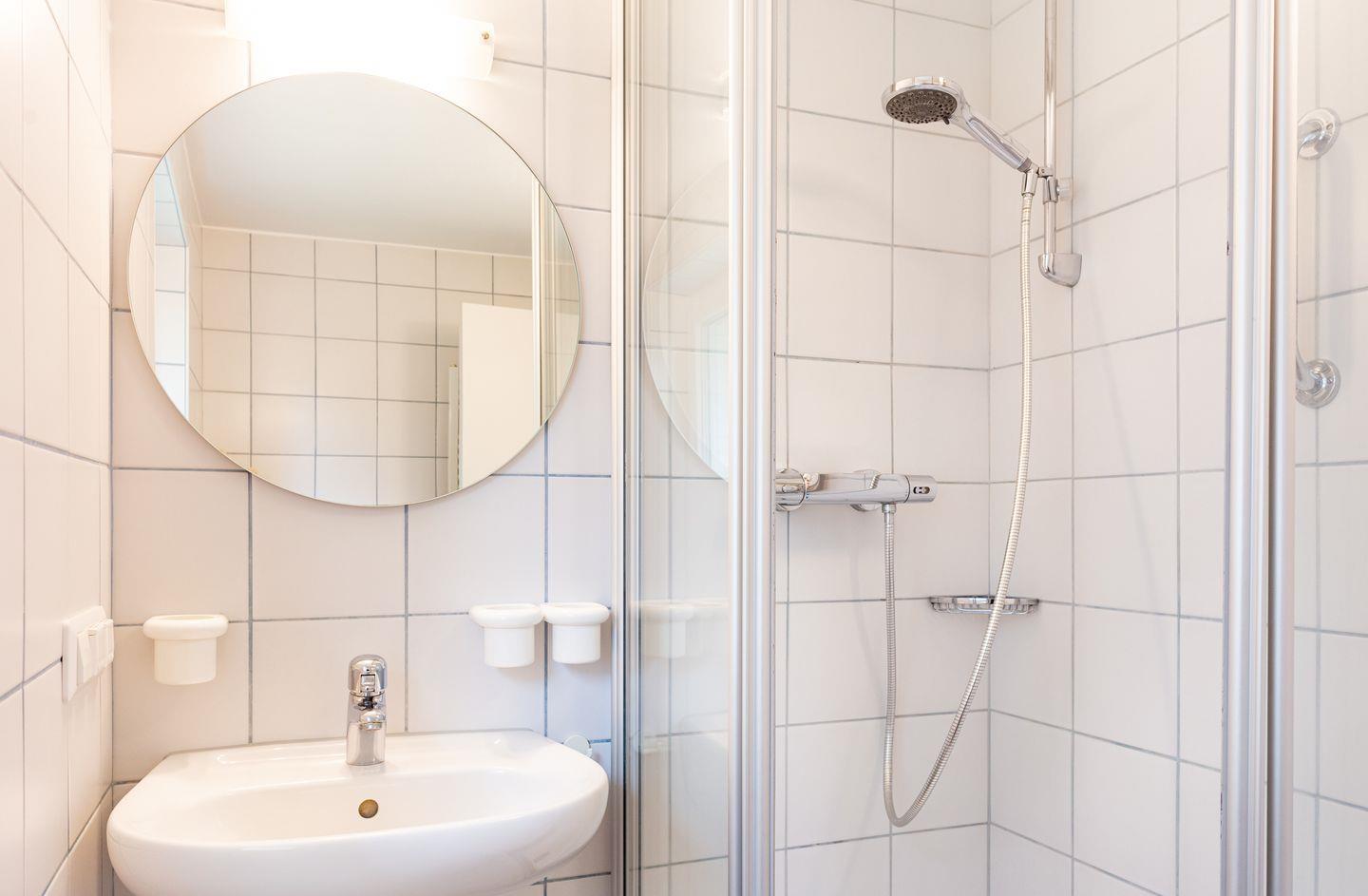 - Badezimmer mit WC, Waschbecken, Spiegel, Dusche und Fön
