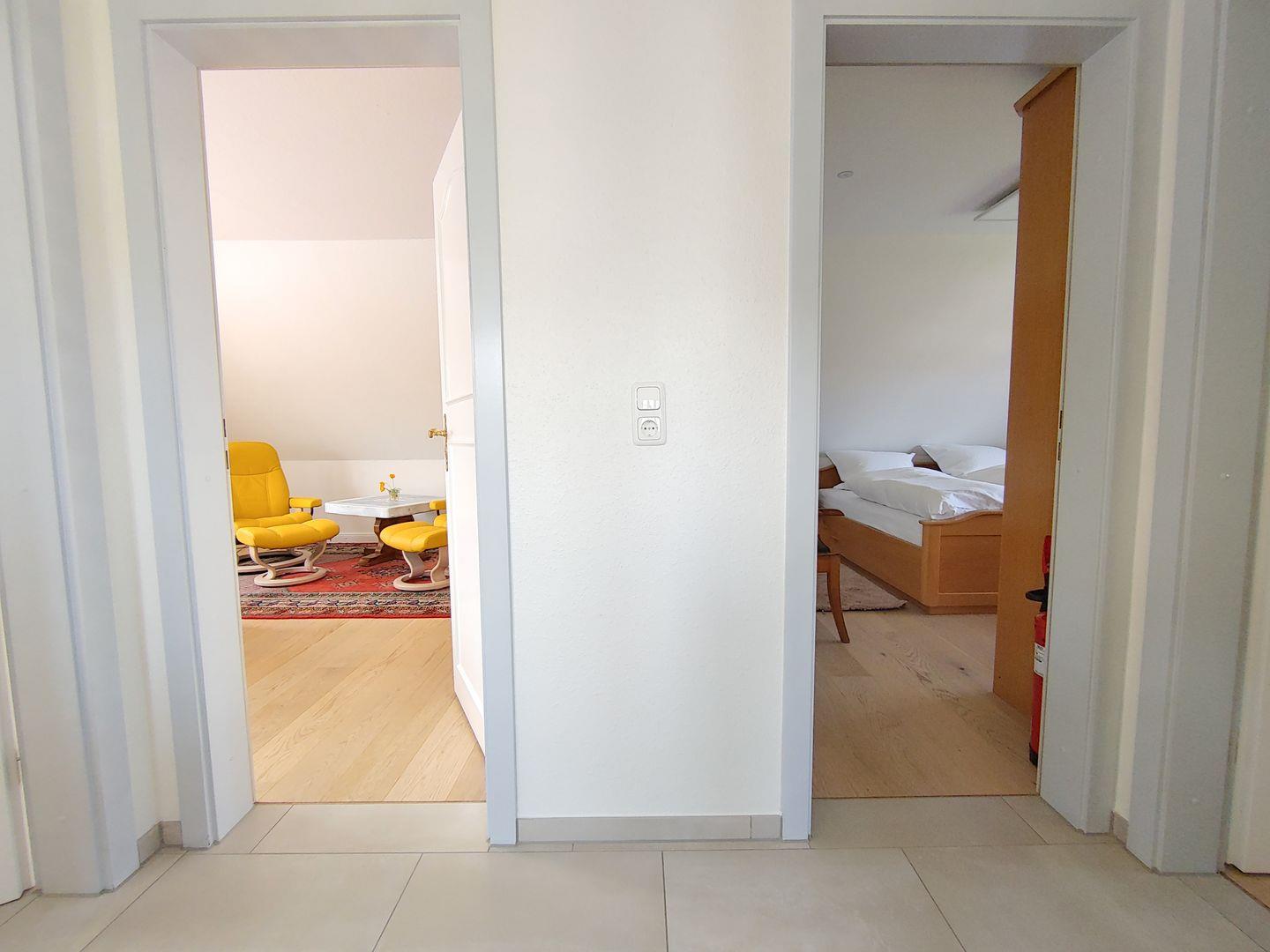Durch eine Zwischentür ist diese Wohnung mit der Ferienwohnung „Blä Waanang" (Friesisch: Blaue Wohnung) verbunden. Bei gleichzeitiger Buchung beider Wohnungen entsteht eine großzügige, gemeinsame Wohneinheit mit 2 Bädern und Schlafmöglichkeiten für bis zu 6 Personen.