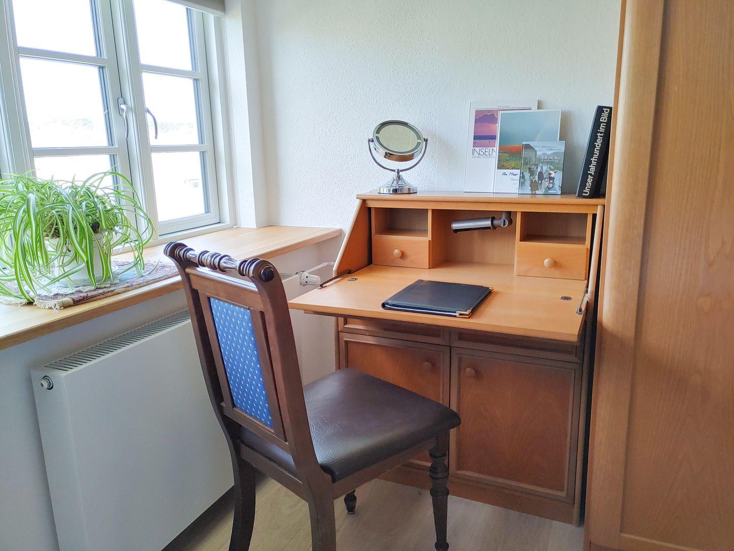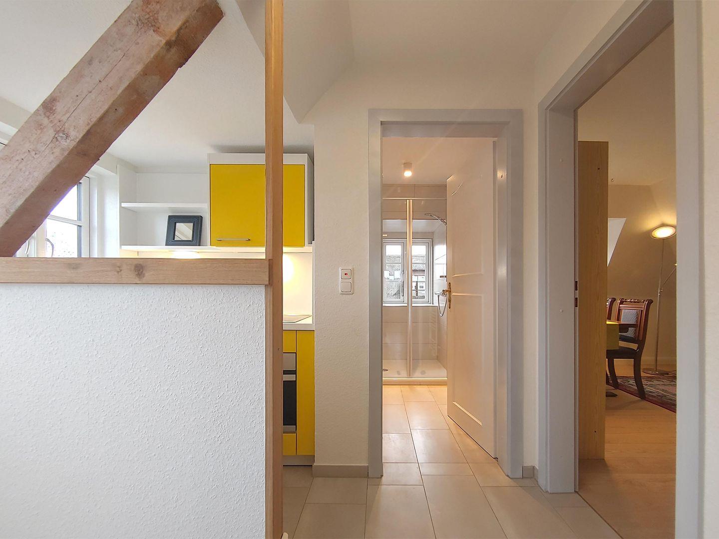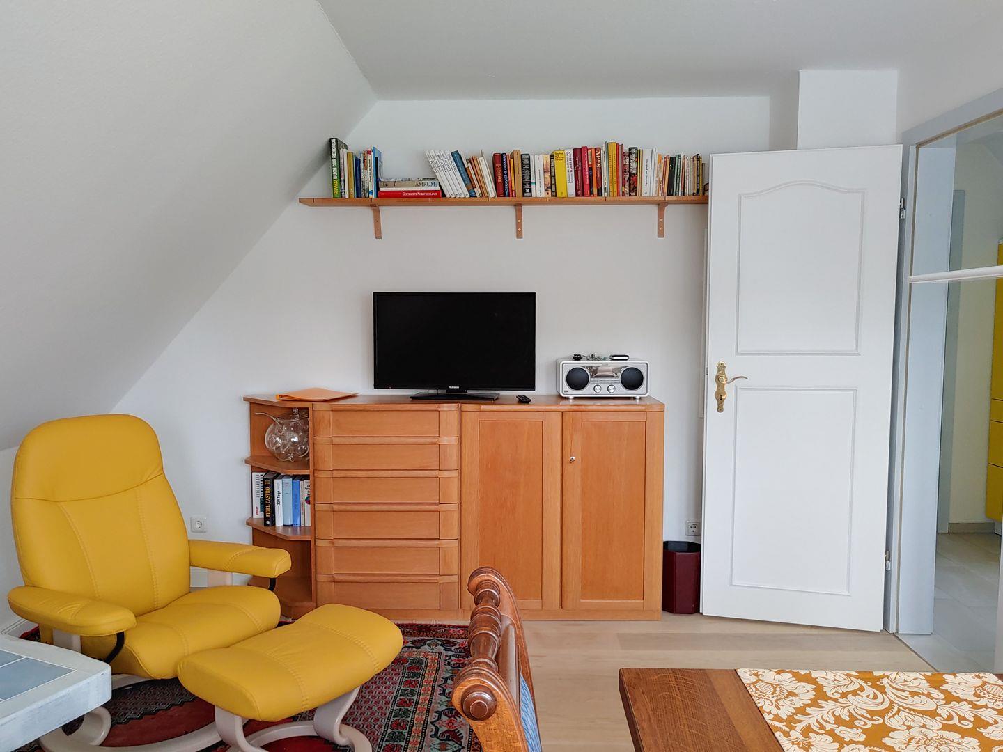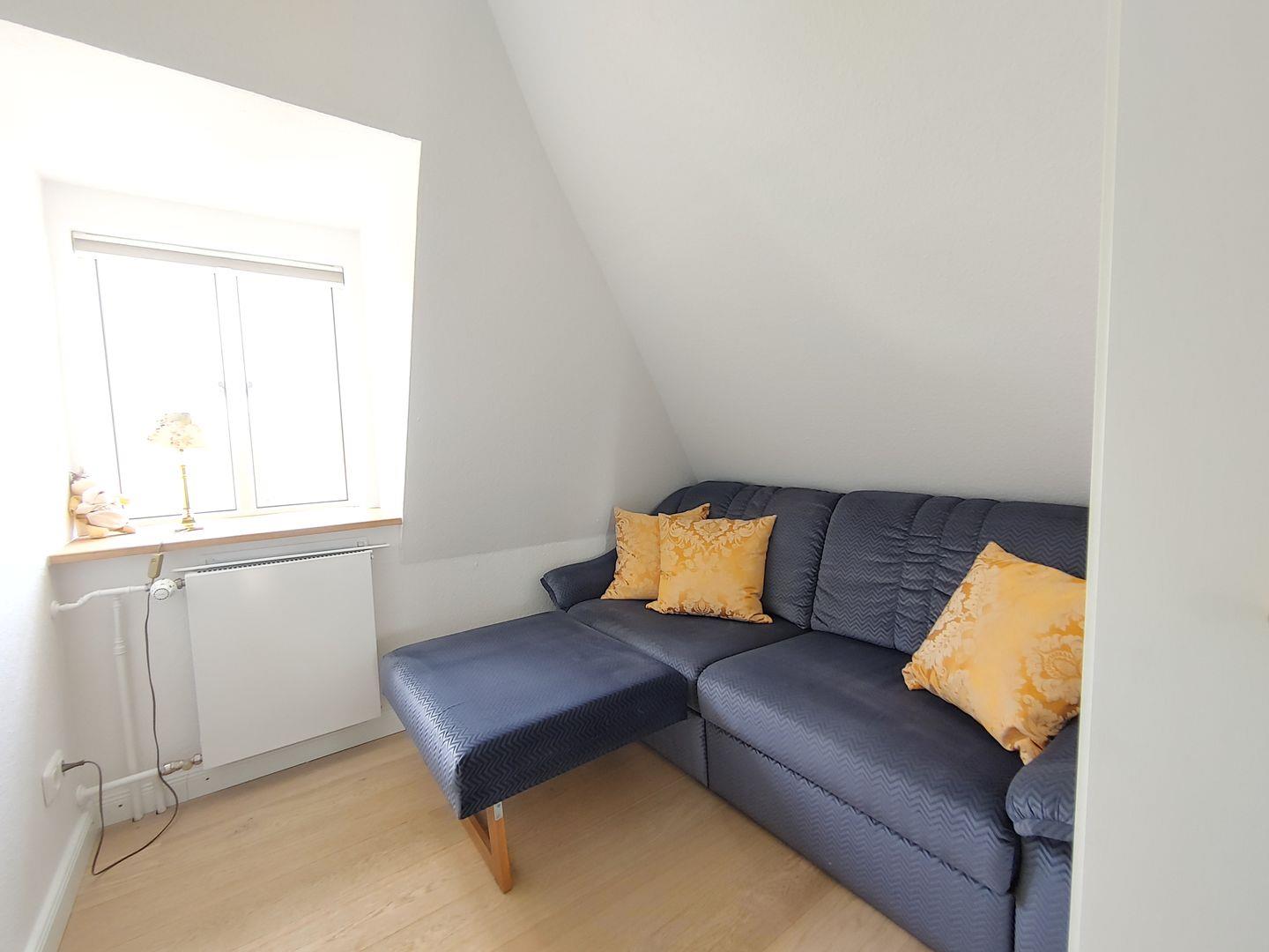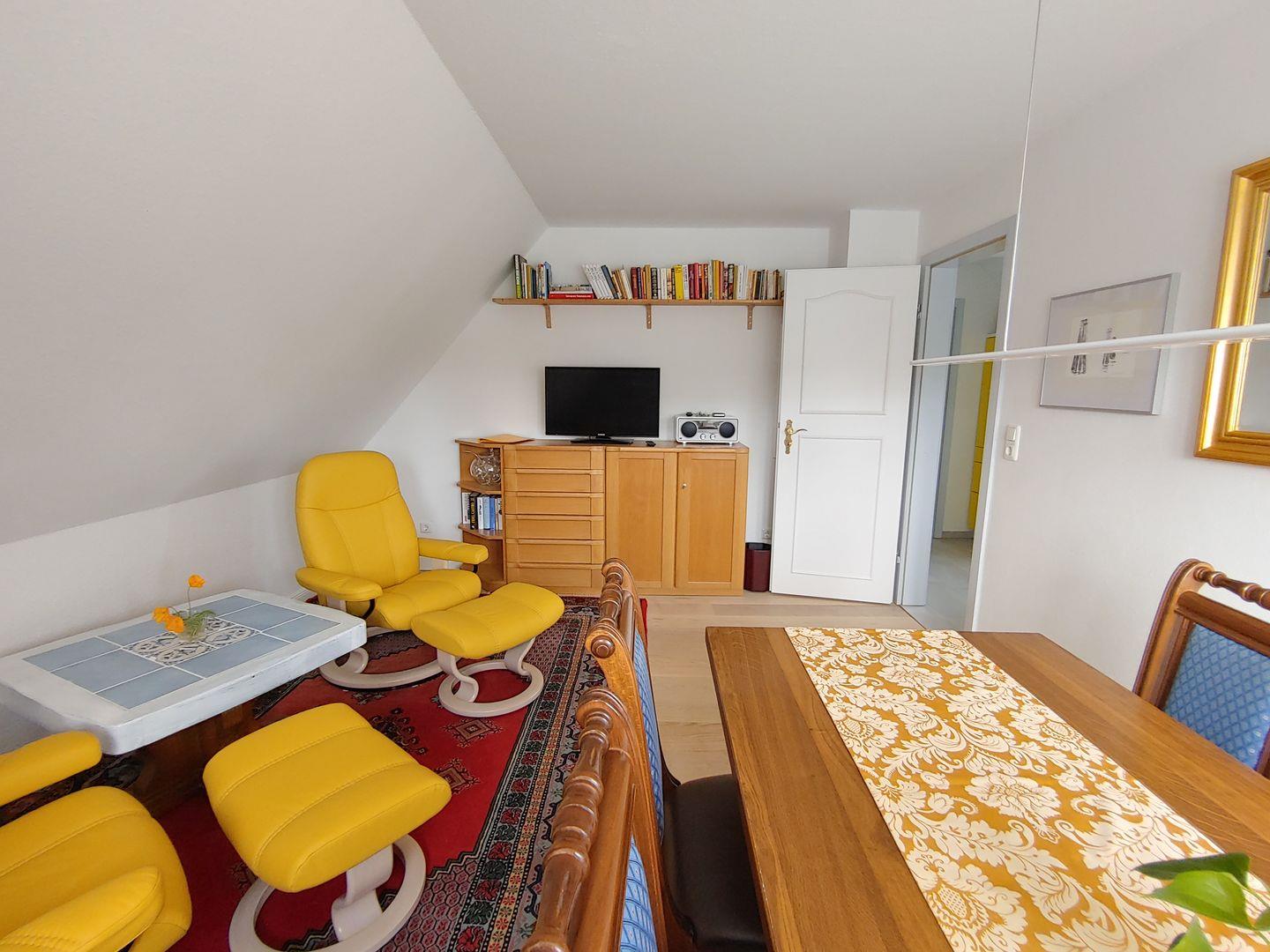 Die Wohnung verfügt über 1 Wohnraum mit WLAN, Smart-TV, Internetradio mit CD und Bluetooth, DVD-Player und offener Küche, 1 Schlafzimmer mit Doppelbett, 1 Schlafzimmer mit Schlafcouch für 2 Personen, 1 Badezimmer mit Dusche und WC. Münzwaschmaschine und -trockner zur gemeinschaftlichen Nutzung im Keller, kleine Nord-West-Terrasse zur Gemeinschaftsnutzung mit Strandkorb