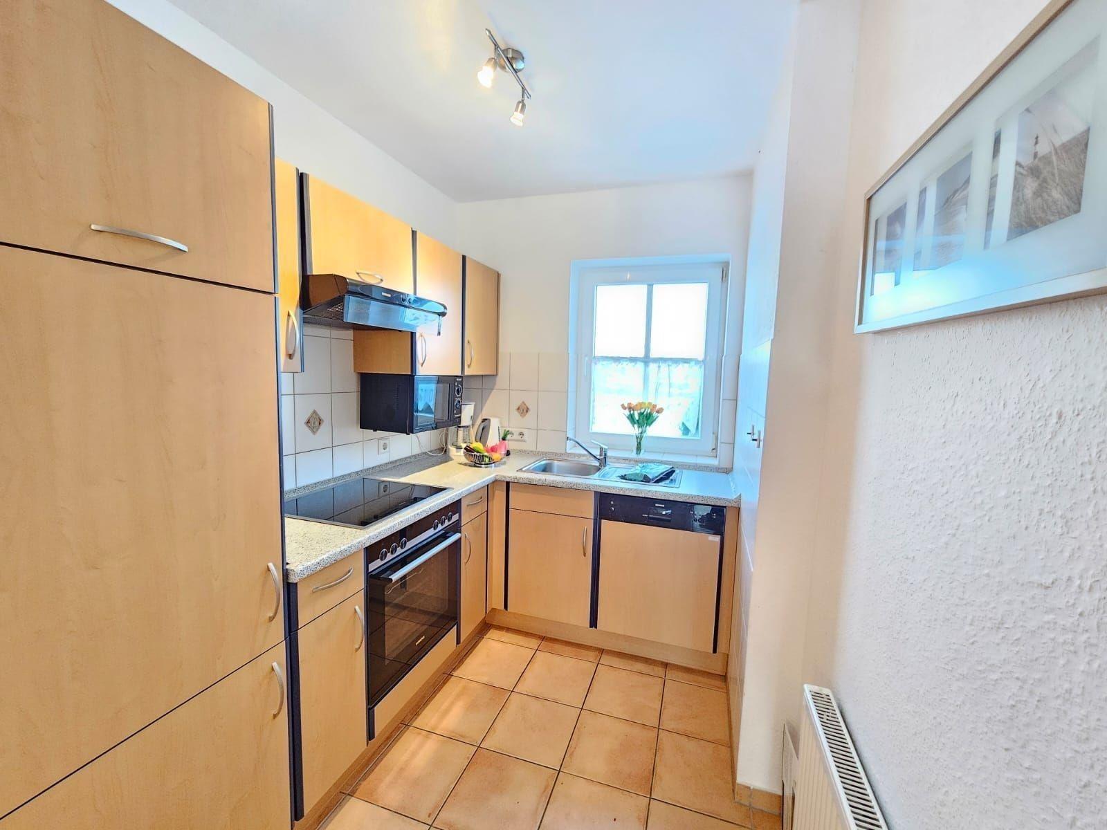 Die offene Küche ist reichhaltig ausgestattet mit einem Elektro-/Gasherd, Geschirrspüler, Backofen, Mikrowelle, Kühlschrank und Gefriermöglichkeit. Des Weiteren stehen eine Kaffeemaschine, ein Wasserkocher und ein Toaster zur Verfügung. Die Wohnung ist allergikergeeignet und bietet WLAN-Internet. Ein gemütliches Wohnzimmer mit Sofa, Sessel und TV lädt zum Entspannen ein.