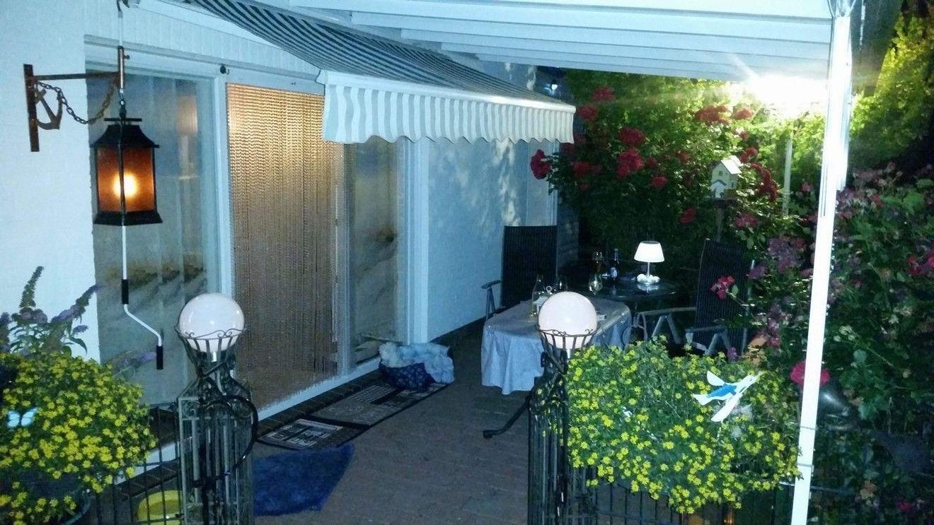 Der Garten ist mit zwei Terrassen, Liege- und Sitzbereich 2020 neu angelegt worden und mit Sichtschutzelementen ausgestattet. Über der Eingangsterrasse befindet sich eine transparente Überdachung mit Sonnenschutz. Eine Sonnenterrasse mit tiefen Stühlen und einem großen Sonnenschirm, lädt zum Chillen ein. Zwei klassische Wasserbrunnen runden das dezente Ambiente ab. Nachts sind die verschiedenen Gartenbereiche mit einer dreiflammigen Laterne und verschiedenen LED Lichtern zeitweise beleuchtet.