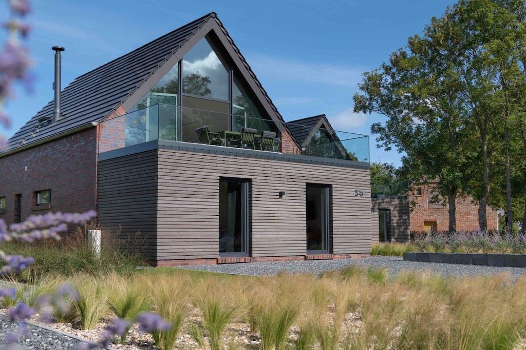 Modernes Ferienhaus Harlepadd 3b in Neufunnixsiel mit Sauna, Kamin und Blick auf die Nordsee.