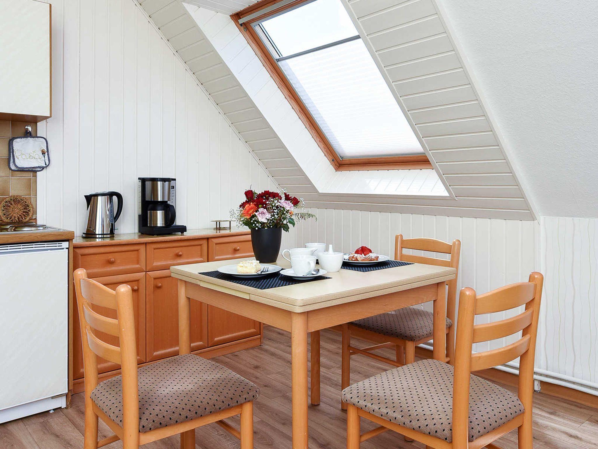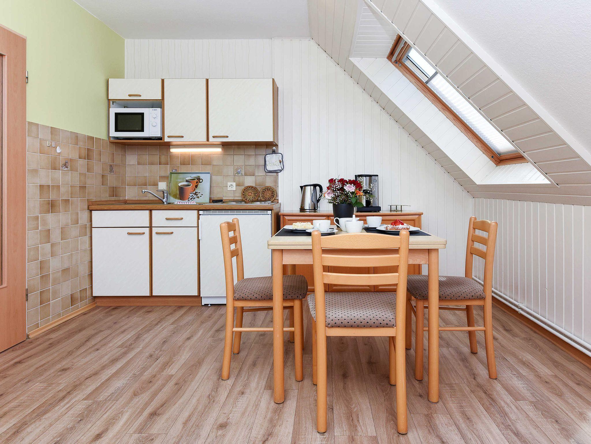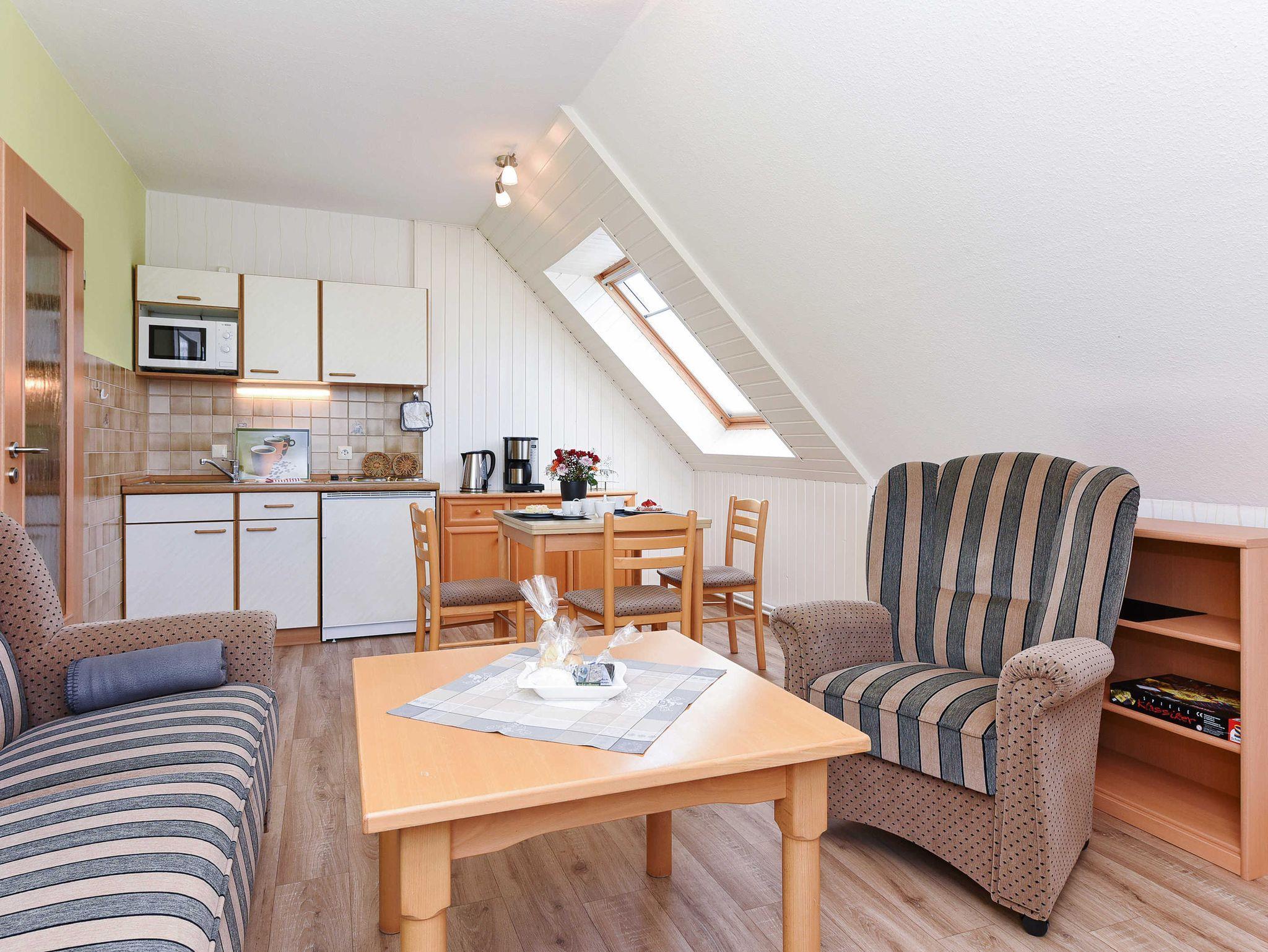 Größe ca. 45 Quadratmeter, Wohnraum mit integrierter Küche und Essgruppe, Schlafzimmer, Badezimmer mit Dusche, Waschtisch und WC, Obergeschoss, optimal für 2 Personen.