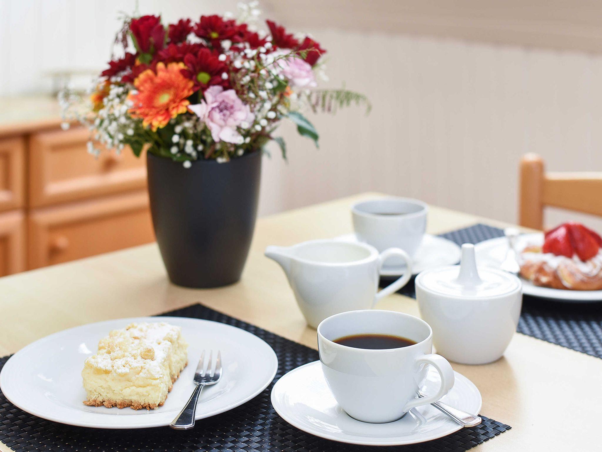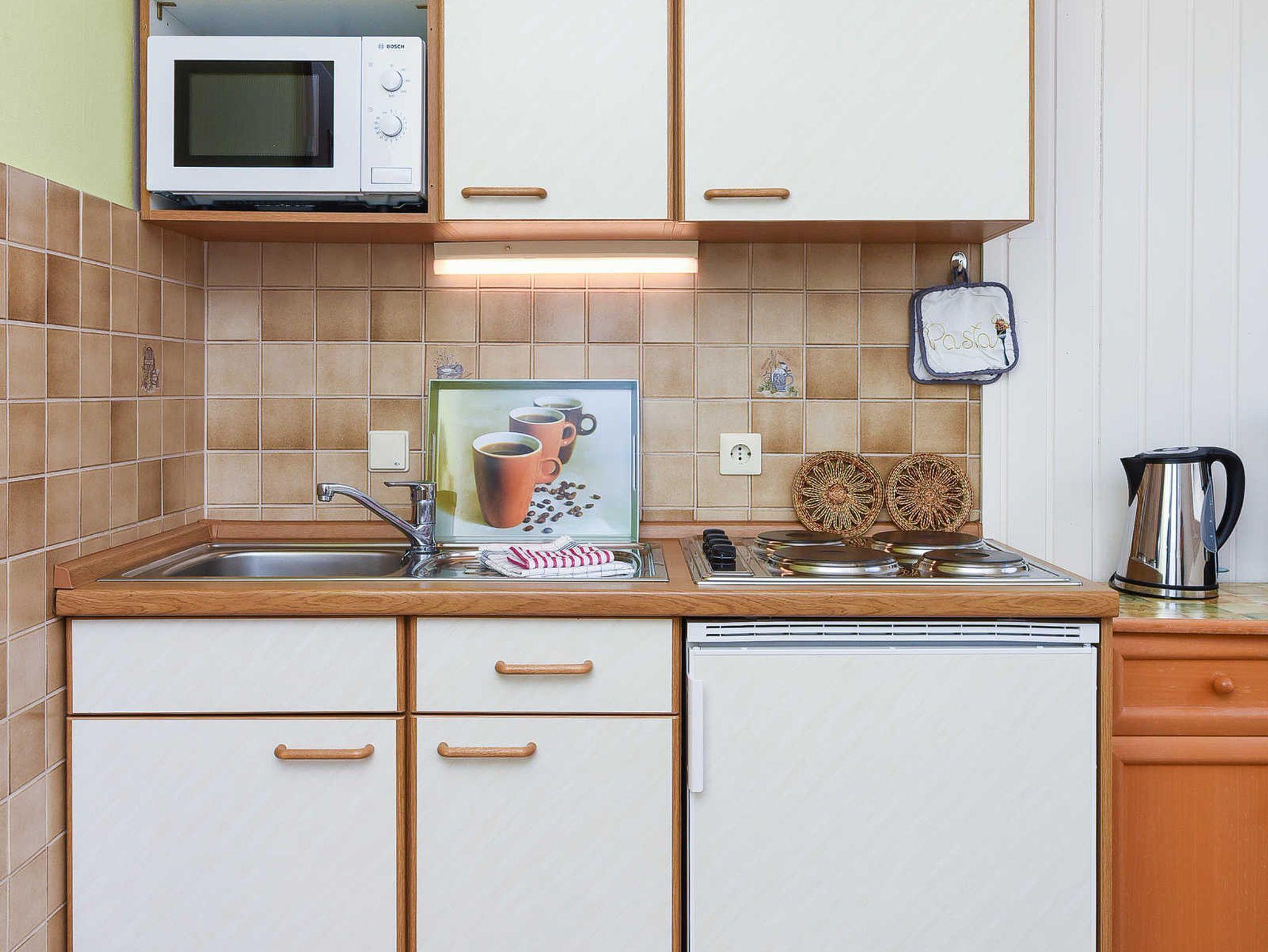 Unsere Wohnung „unten“ hat eine Terrasse. Ein schöner großer Garten steht Ihnen ebenfalls zur Verfügung. Natürlich gibt es in allen Wohnungen voll ausgerüstete moderne Einbauküchen und alles, was man überhaupt im Urlaub benötigen könnte. Jede Wohnung verfügt über eine Mikrowelle, Geschirrspüler ist in der größeren Wohnung vorhanden und Waschmaschine sowie Wäschetrockner stehen für Sie im Waschraum zur Verfügung.