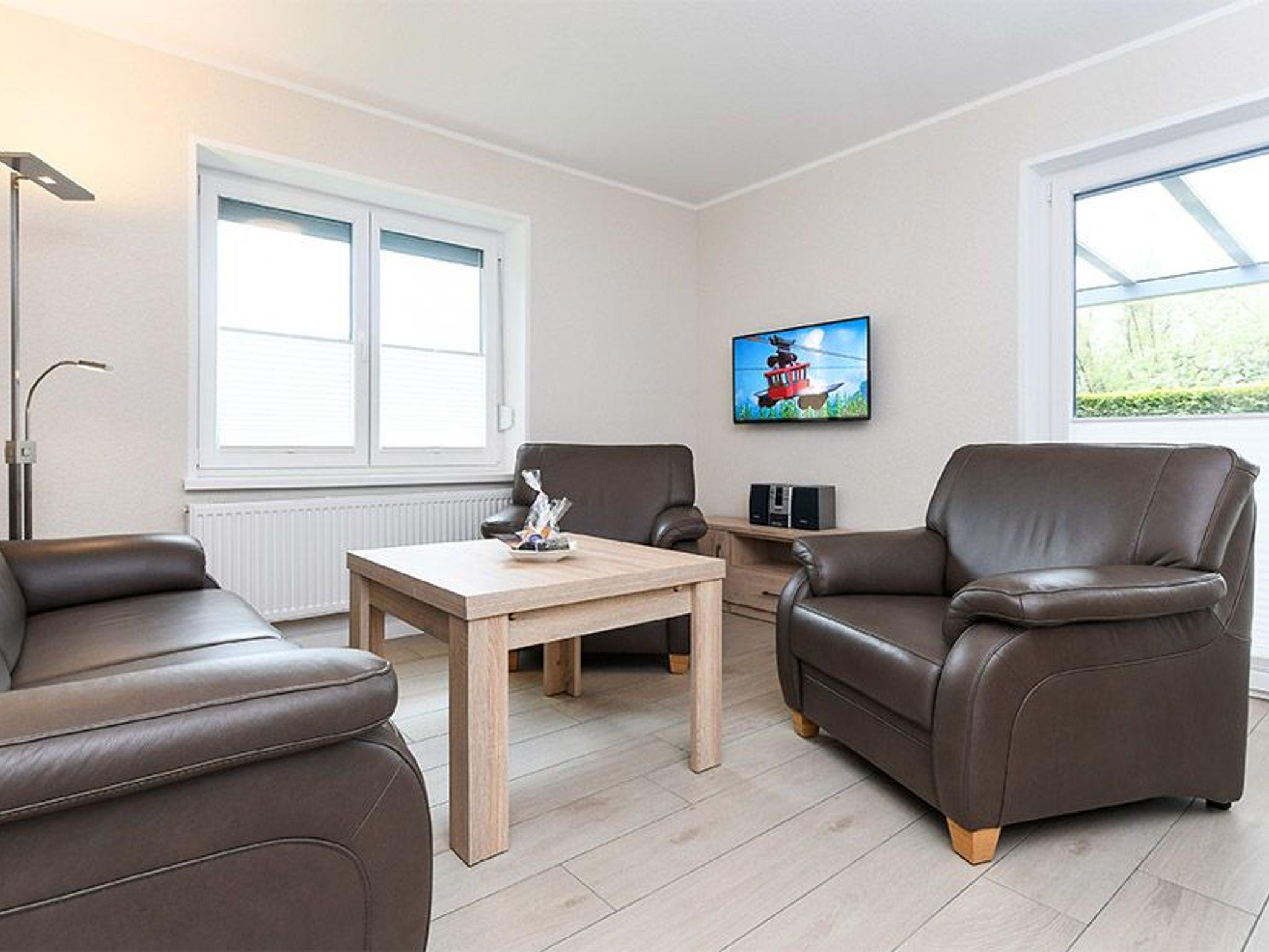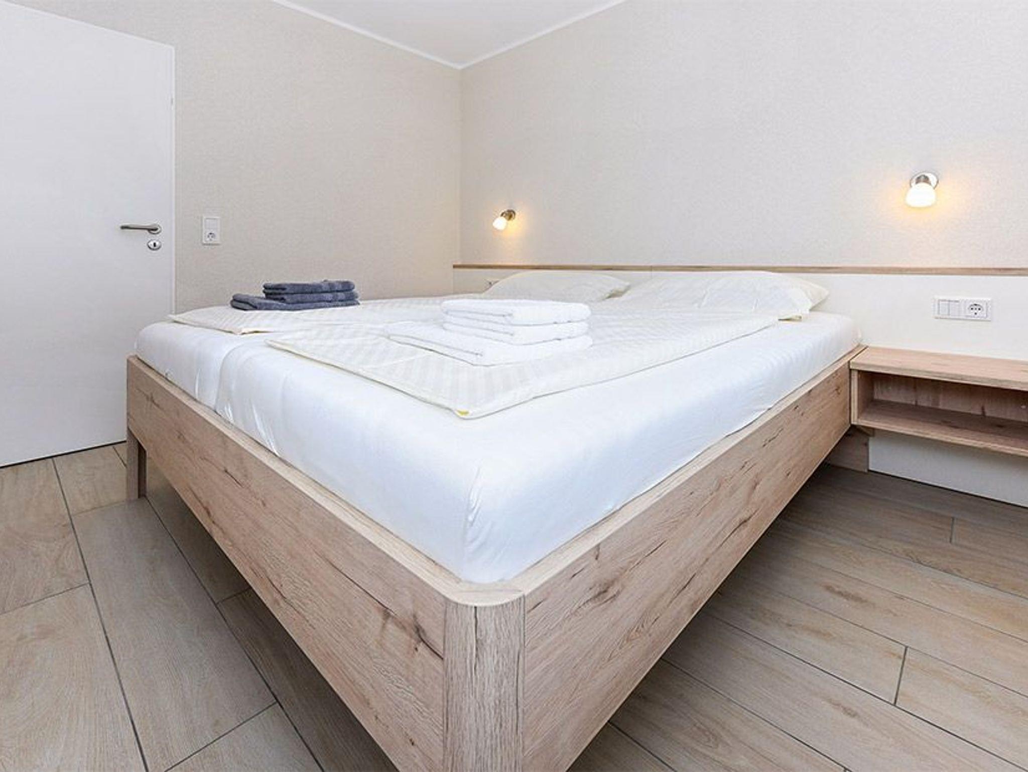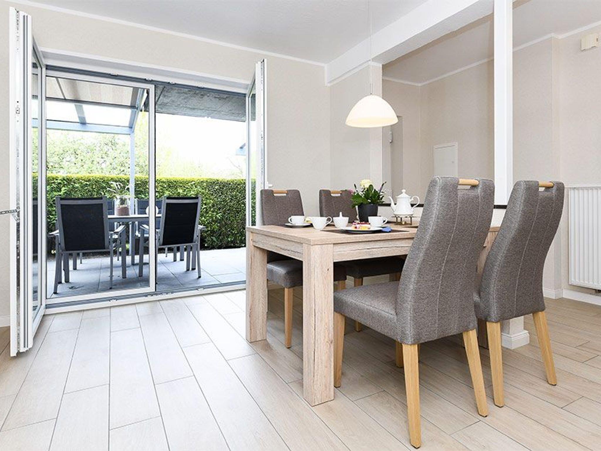 Größe ca. 60 Quadratmeter, Wohnraum mit integrierter Küche und Essgruppe, Schlafzimmer, zweites separates Schlafzimmer, Badezimmer mit Dusche, Waschtisch und WC, Erdgeschoss, Terrasse, optimal für 2 bis 4 Personen und zusätzlich ein Kleinkind.