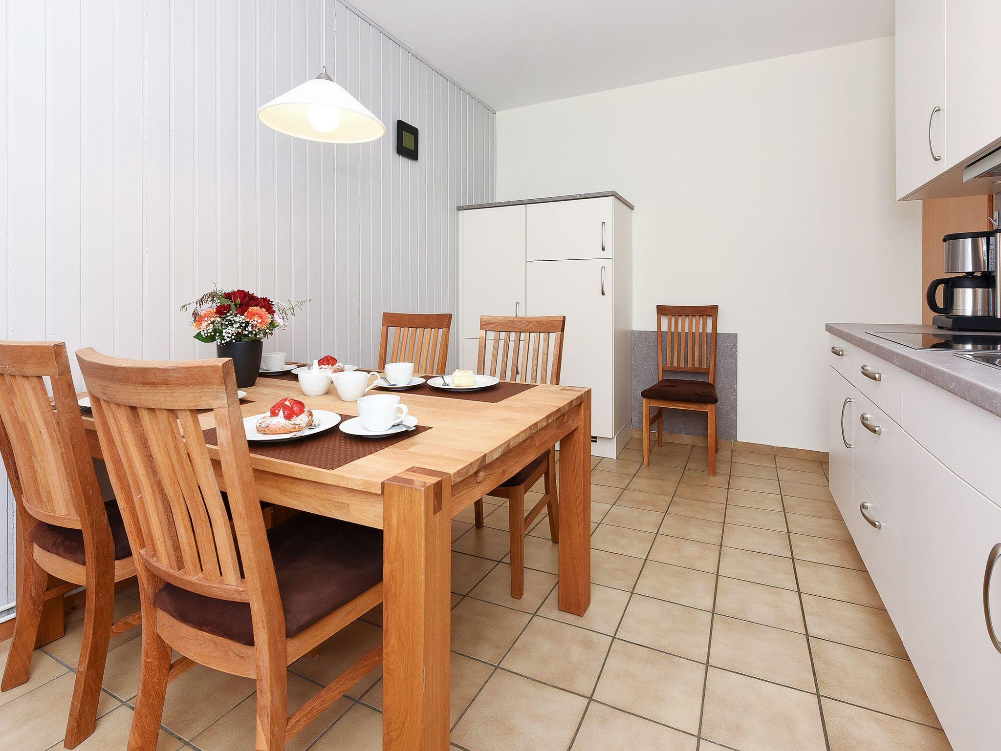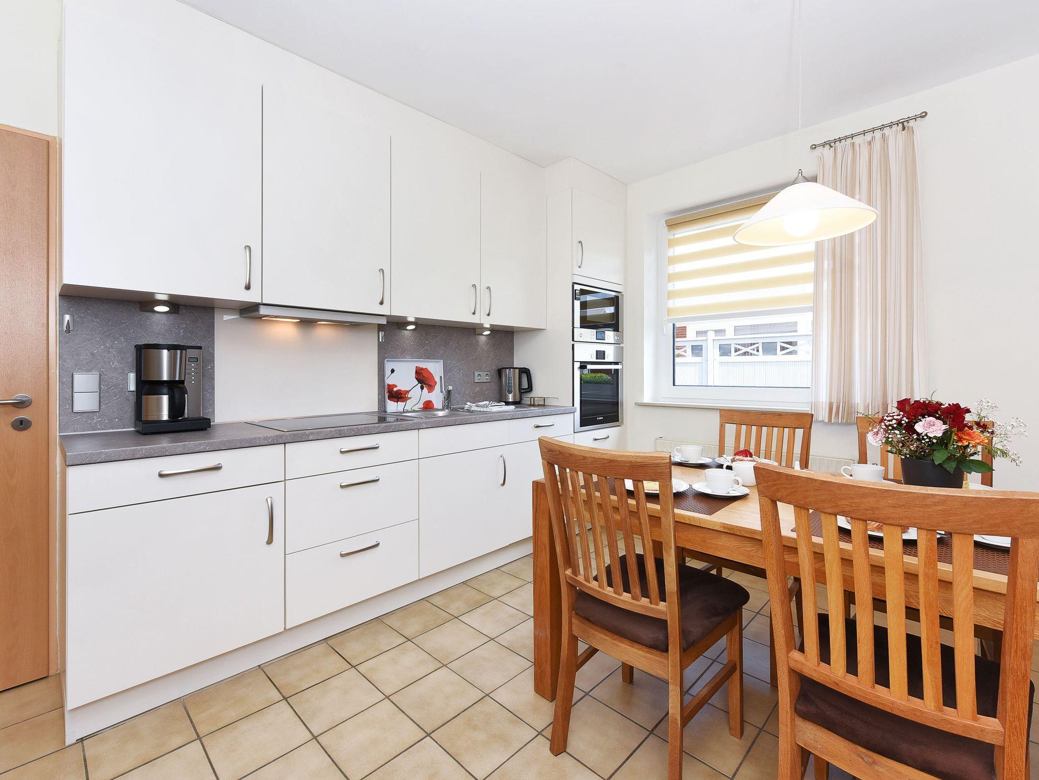 Unsere Wohnung „unten“ hat eine Terrasse. Ein schöner großer Garten steht Ihnen ebenfalls zur Verfügung. Natürlich gibt es in allen Wohnungen voll ausgerüstete moderne Einbauküchen und alles, was man überhaupt im Urlaub benötigen könnte. Jede Wohnung verfügt über eine Mikrowelle, Geschirrspüler ist in der größeren Wohnung vorhanden und Waschmaschine sowie Wäschetrockner stehen für Sie im Waschraum zur Verfügung.
