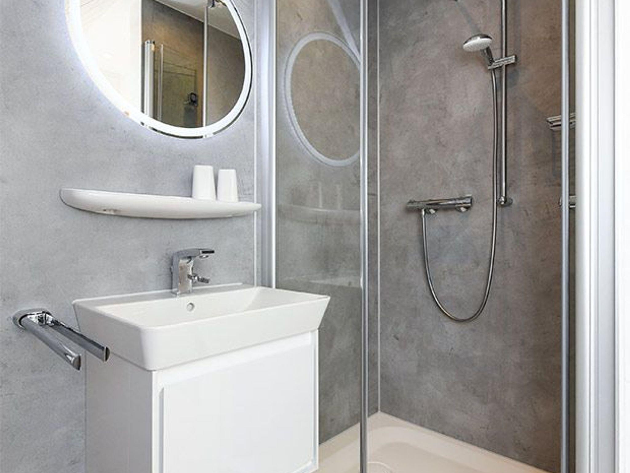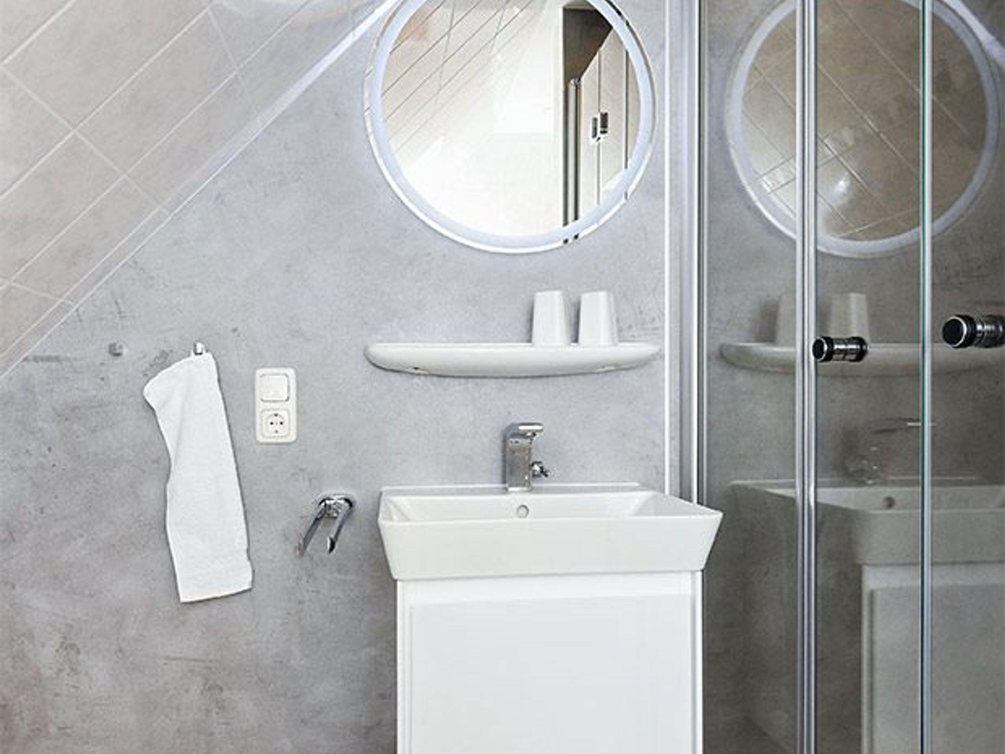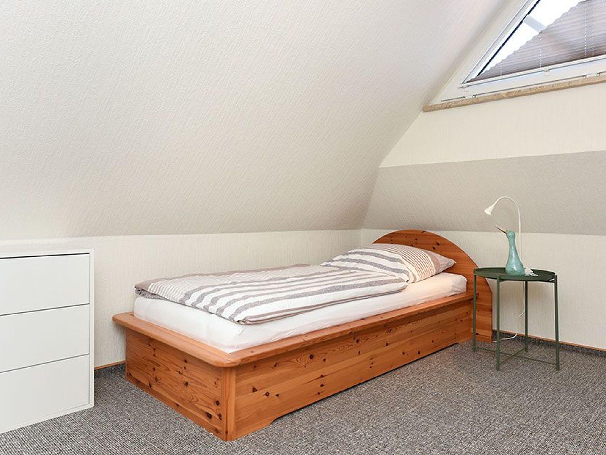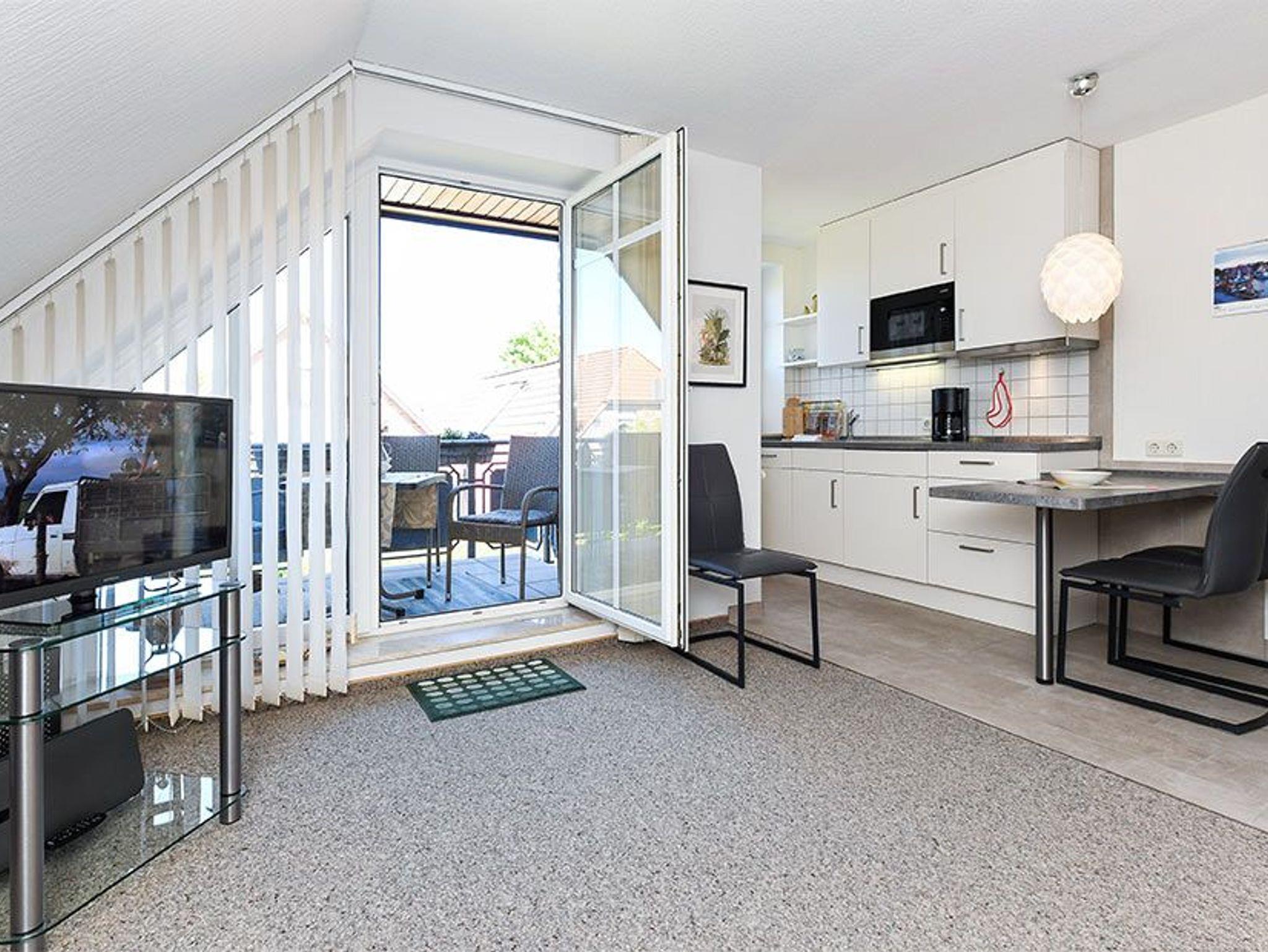 Größe ca. 65 Quadratmeter, Wohnraum mit integrierter Küche, Schlafzimmer, zweites separates Schlafzimmer, Badezimmer mit Dusche, Waschtisch und WC, Obergeschoss, Balkon, optimal für 2 bis 3 Personen.