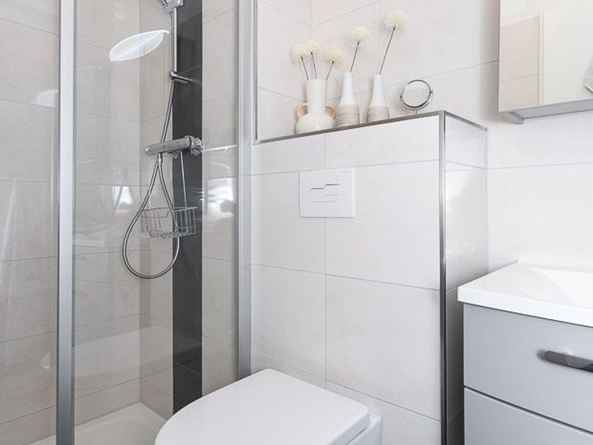 Badezimmer mit Dusche, Waschtisch und WC