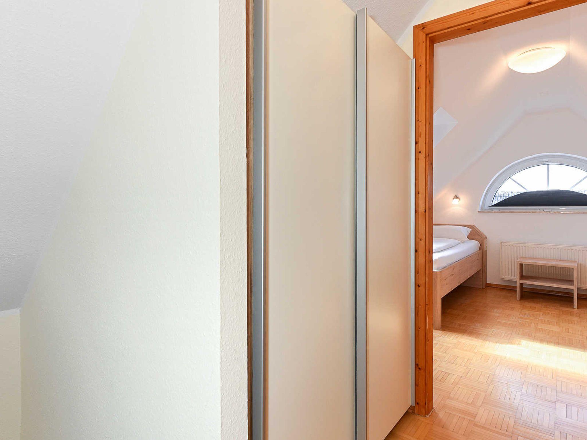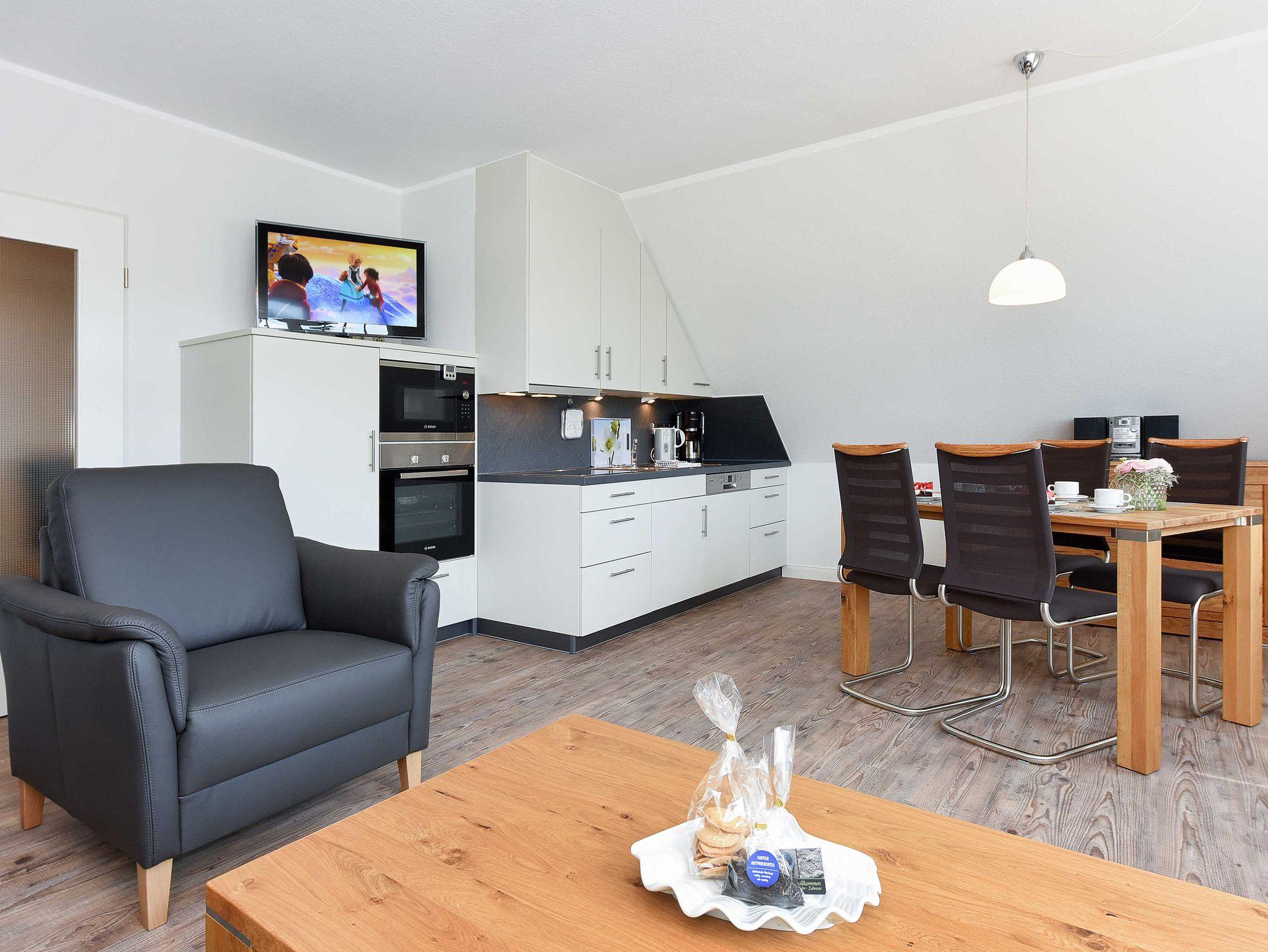 Größe ca. 60 Quadratmeter, Wohnraum mit integrierter Küche und Essgruppe, Schlafzimmer, zweites separates Schlafzimmer/Kinderzimmer, Badezimmer mit Dusche, Waschtisch und WC, Obergeschoss, Balkon, optimal für 2 bis 4 Personen.