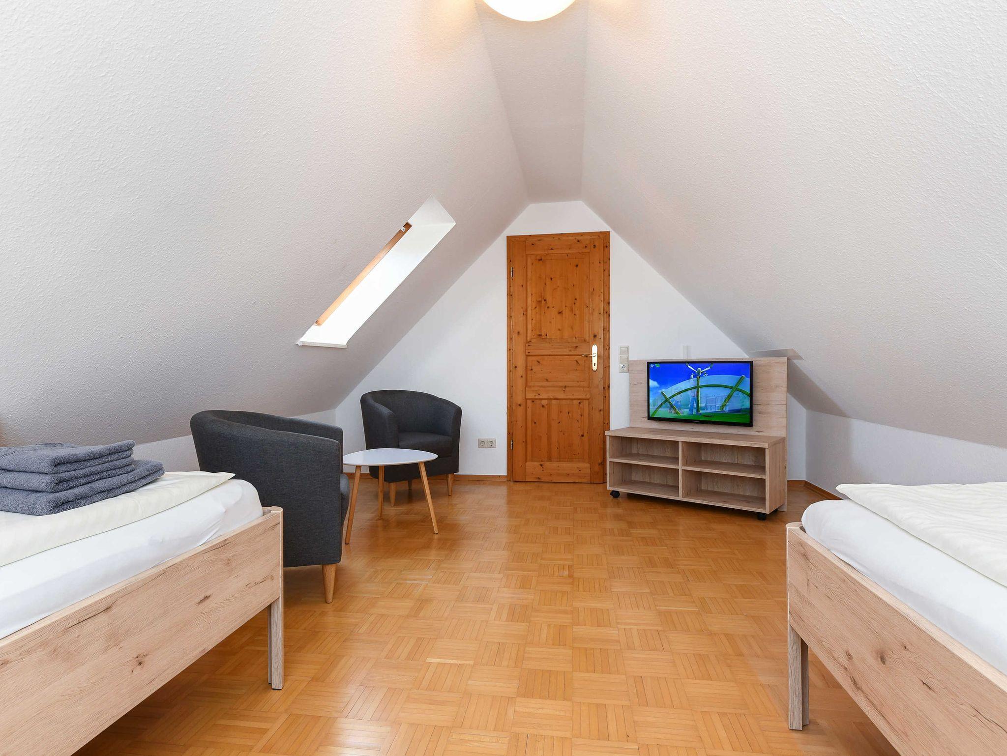 Größe ca. 90 Quadratmeter, Wohnraum mit integrierter Küche und Essgruppe, Schlafzimmer, zweites separates Schlafzimmer/Kinderzimmer, drittes separates Schlafzimmer, Badezimmer mit Dusche, Waschtisch und WC, Obergeschoss, Balkon, optimal für 2 bis 6 Personen und zusätzlich ein Kleinkind.
