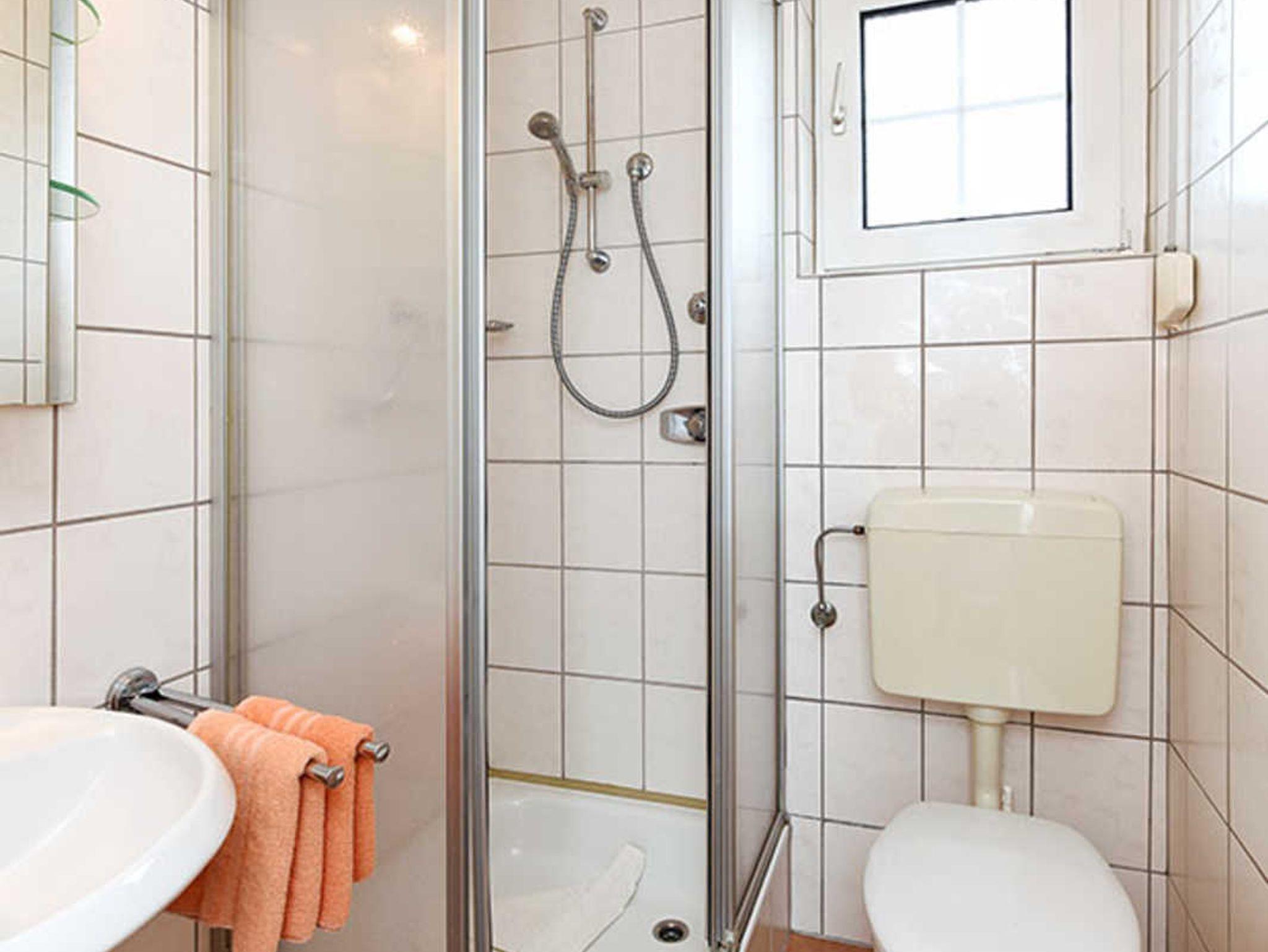 Badezimmer mit Dusche, Waschtisch und WC