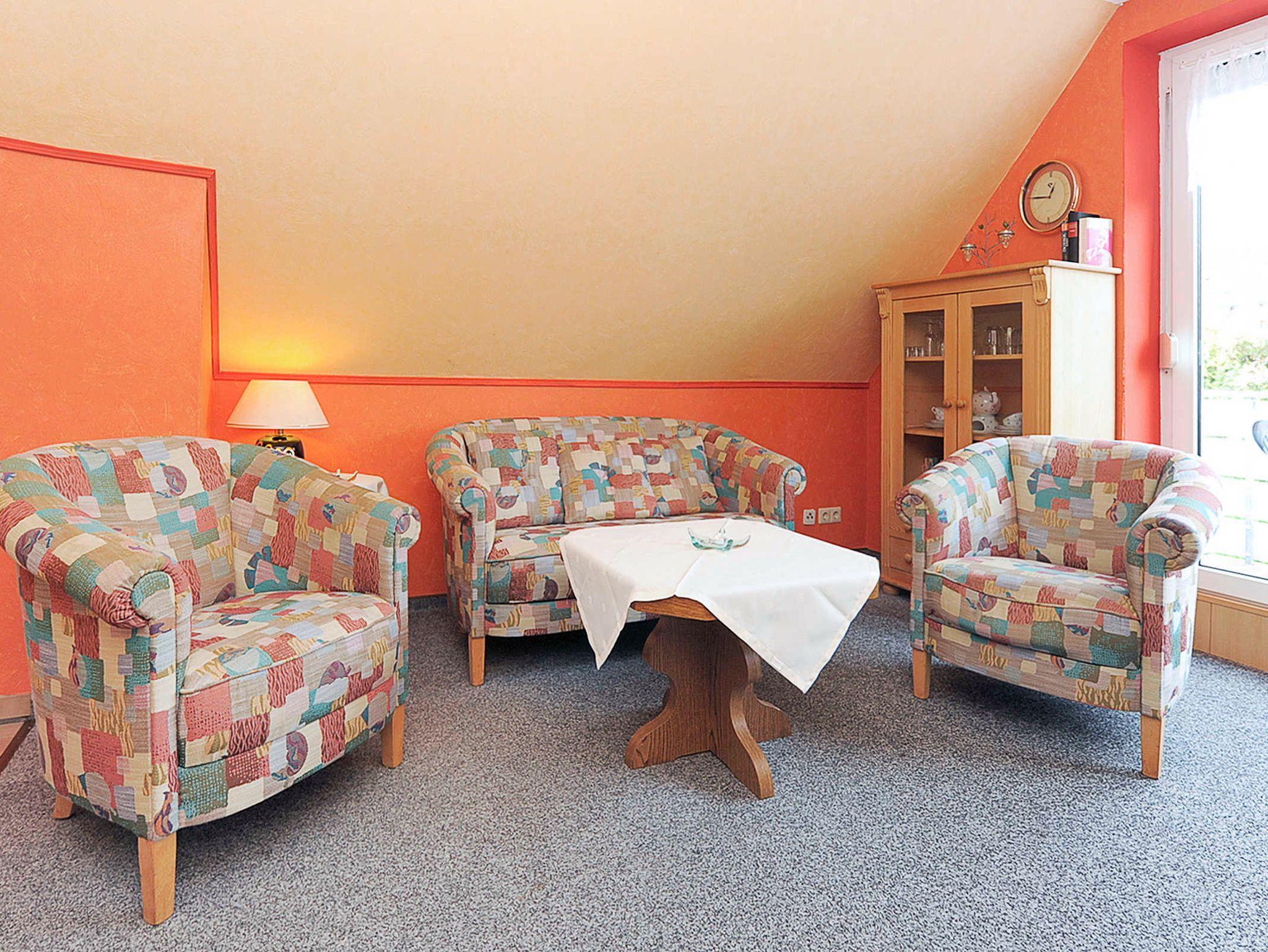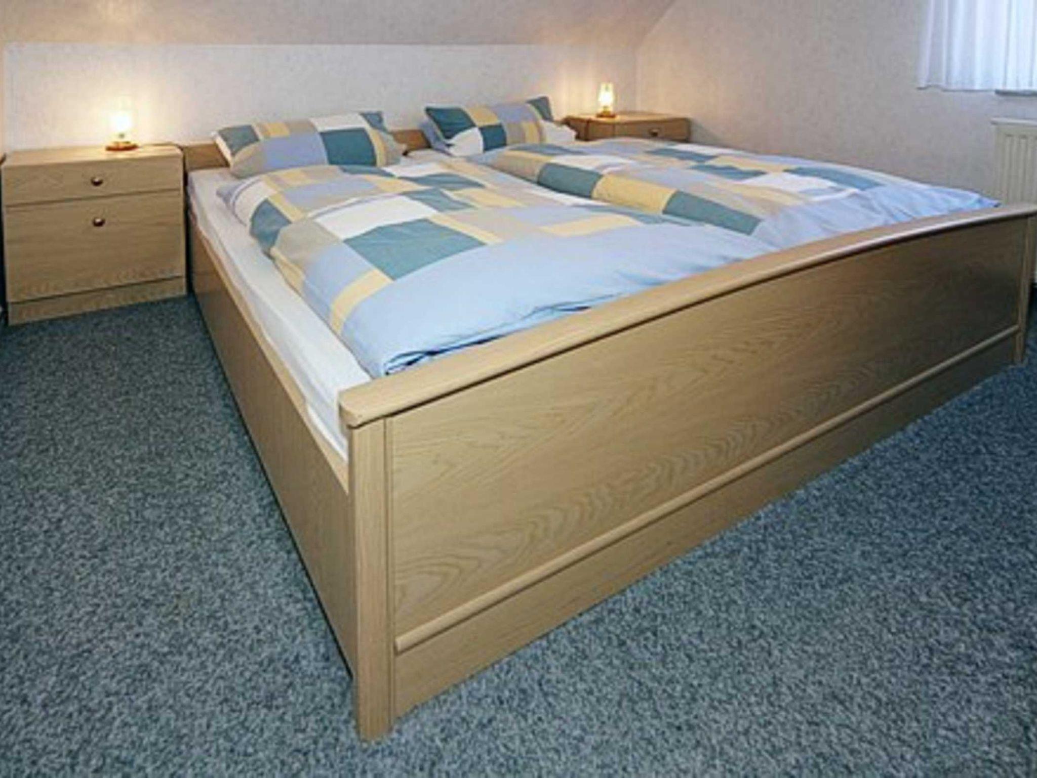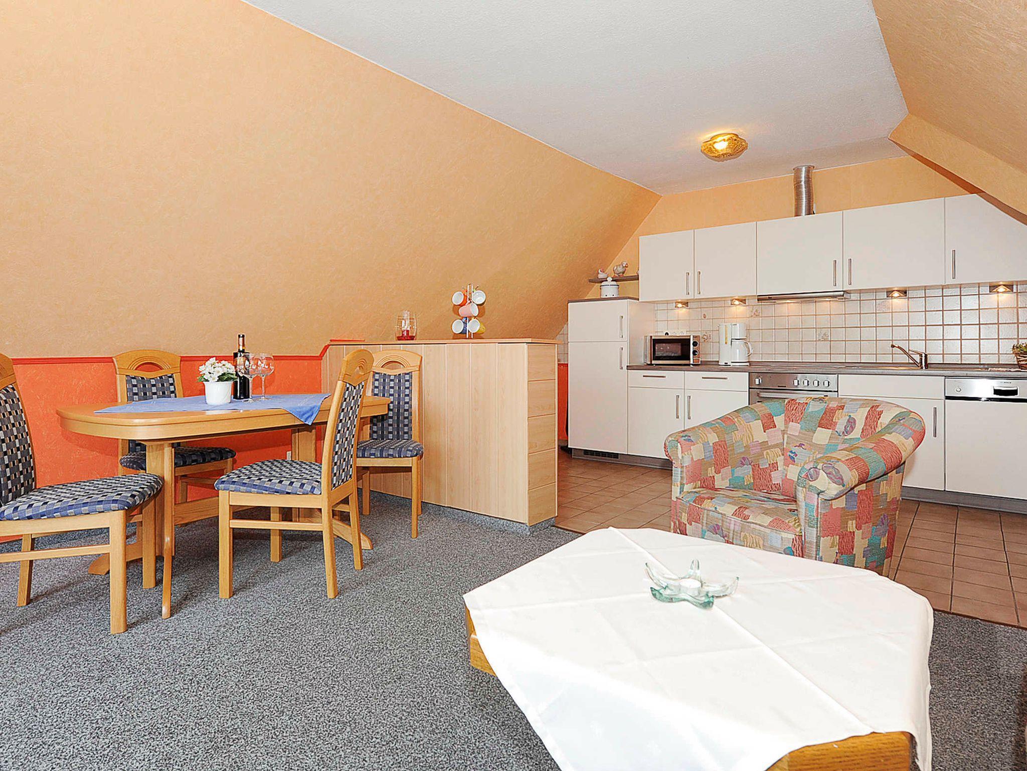 Größe ca. 50 Quadratmeter, Wohnraum mit integrierter Küche, Schlafzimmer, zweites separates Schlafzimmer/Kinderzimmer, Badezimmer mit Dusche, Waschtisch und WC, Obergeschoss, Balkon, optimal für 2 bis 4 Personen.