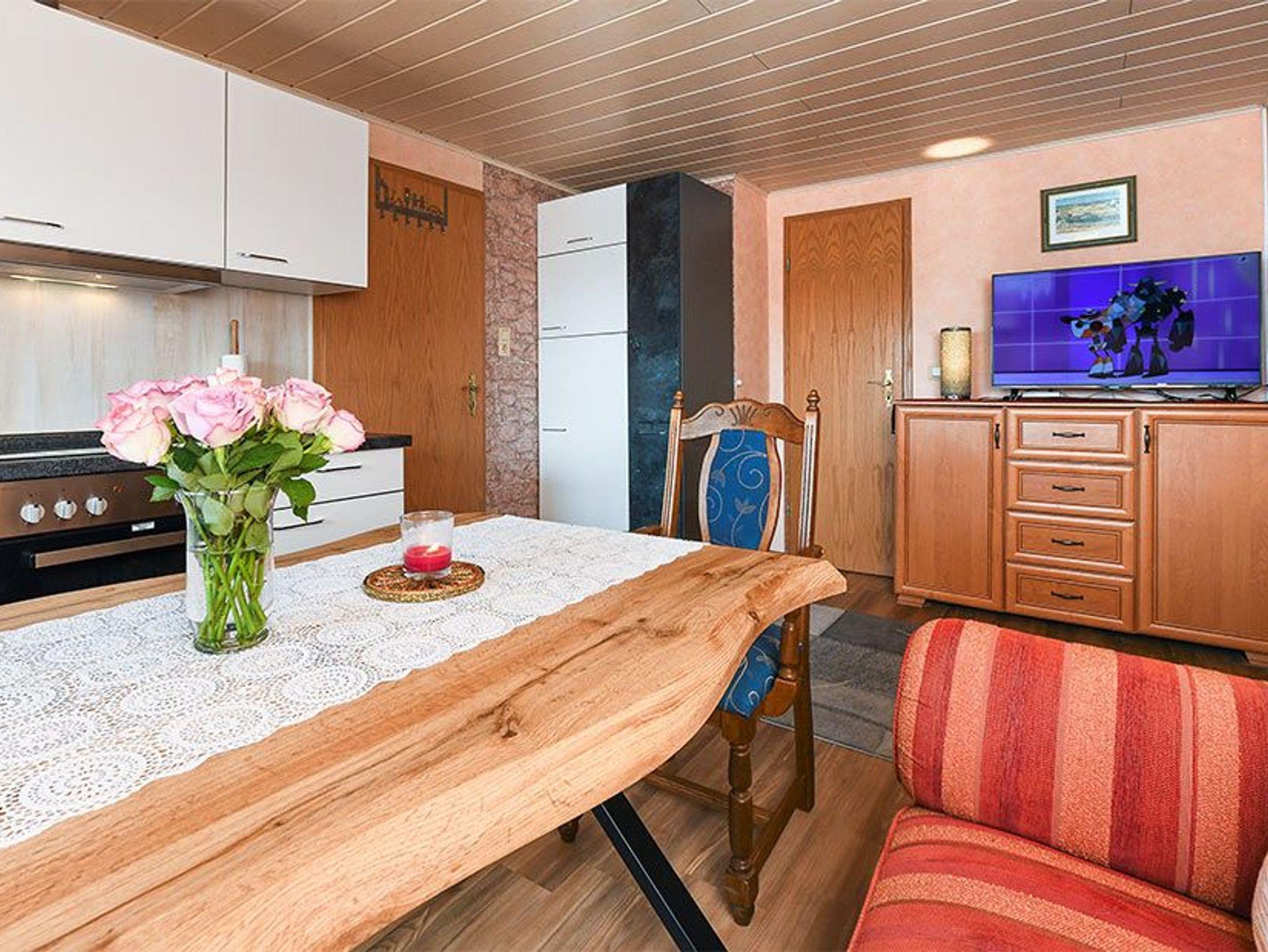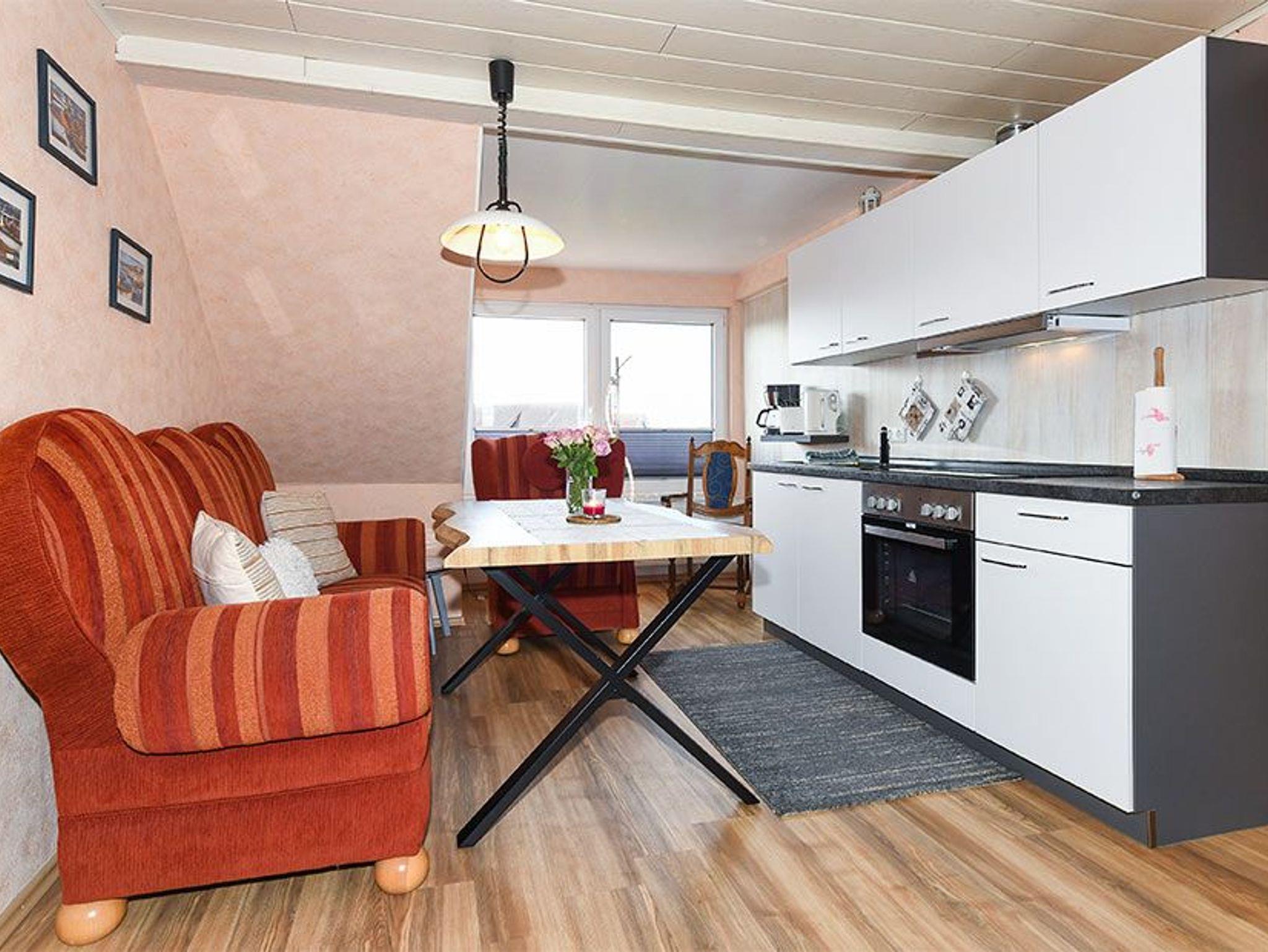 Größe ca. 45 Quadratmeter, Wohnraum mit integrierter Küche, Schlafzimmer, zweites separates, Schlafzimmer/Kinderzimmer, Badezimmer mit Dusche, Waschtisch und WC, Obergeschoss, optimal für 2 bis 4 Erwachsene sowie Kinder ab 10 Jahre.