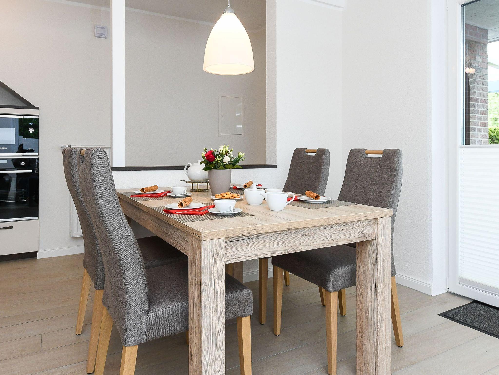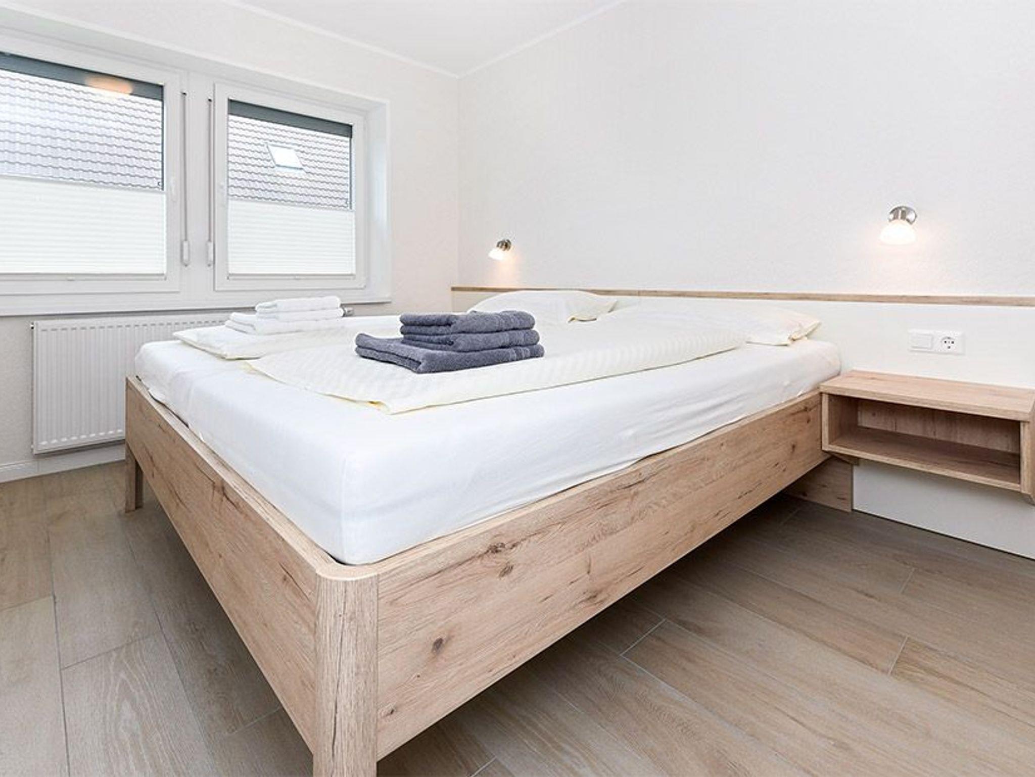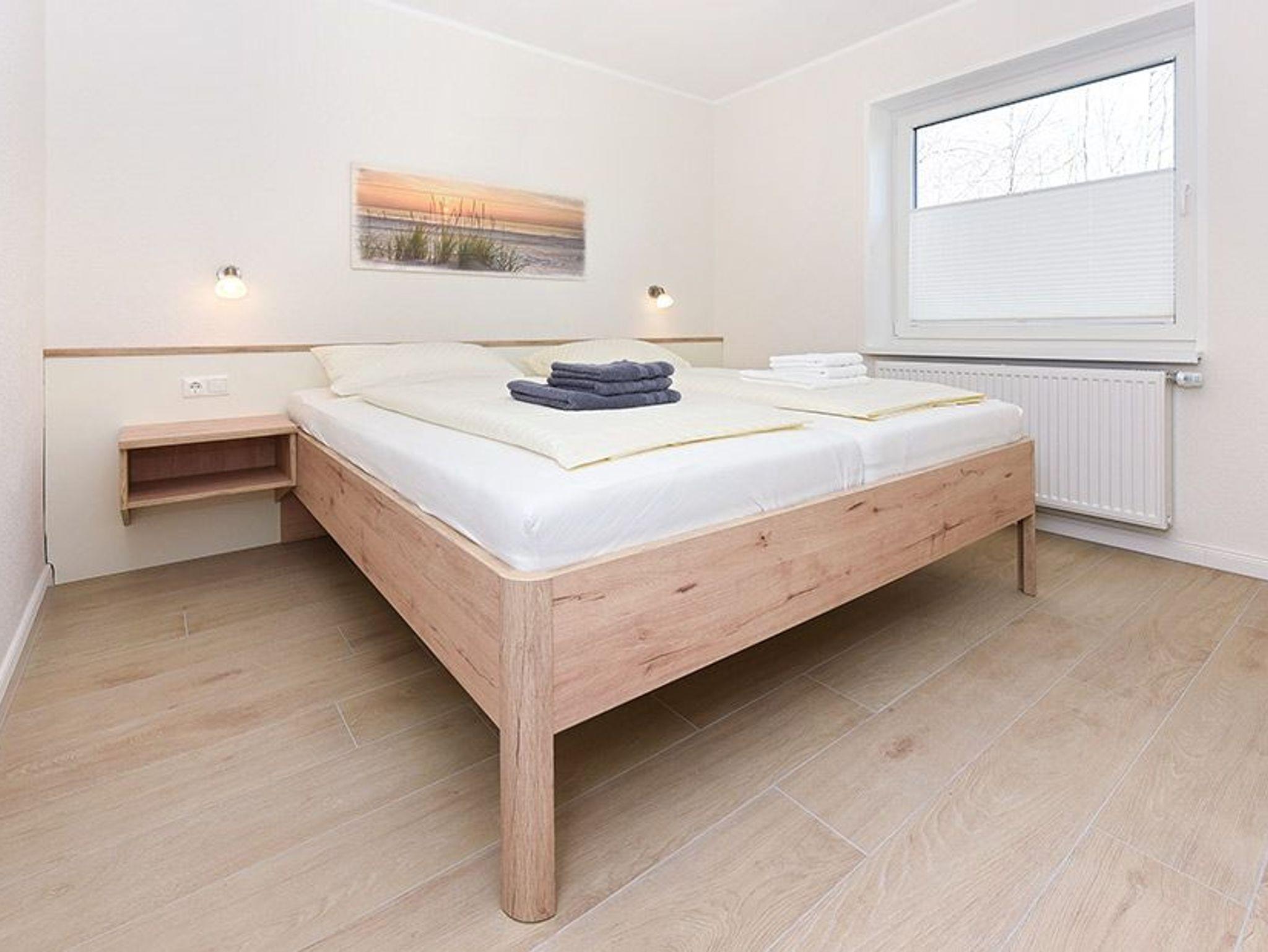 Größe ca. 60 Quadratmeter, Wohnraum mit integrierter Küche und Essgruppe, Schlafzimmer, zweites separates Schlafzimmer, Badezimmer mit Dusche, Waschtisch und WC, Erdgeschoss, Terrasse, optimal für 2 bis 4 Personen und zusätzlich ein Kleinkind.